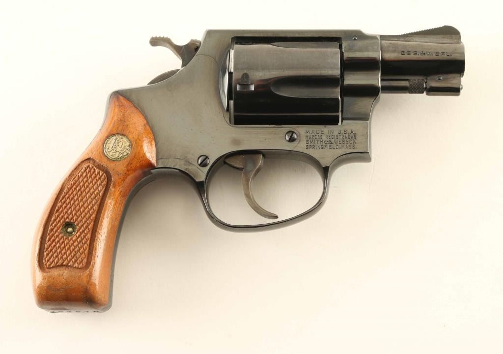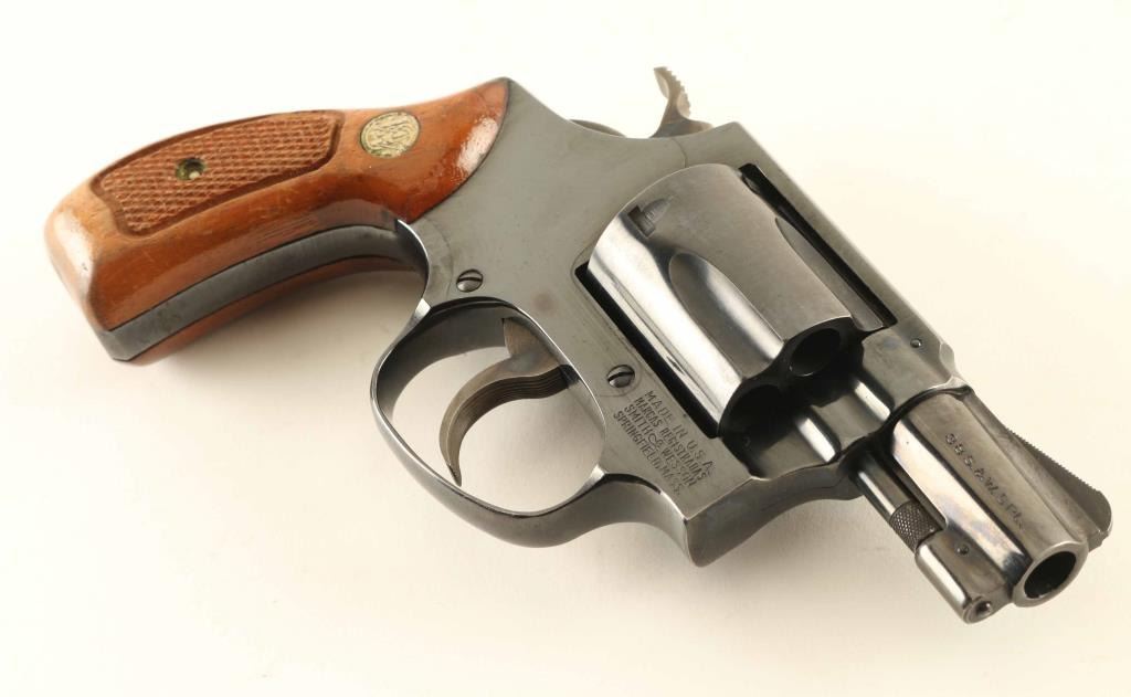 'The .38 Chiefs Special' No Dash, Pinned Barrel, older all machined construction. Small frame double action snub nose revolver. Features a blued finish, 1-7/8" barrel with serrated ramp front sight, square notched rear sight, non-shrouded ejector rod, fluted five-shot cylinder, serrated trigger, service hammer with knurled spur, three screw round butt J frame and two-piece checkered walnut Magna grips with silver S&W medallions. Bore and charge holes are very good. Retains 98% blue with slight showing of bare metal at muzzle. Grips are very good with few scratches. Action is smooth with tight lock-up. Condition is NRA Excellent *** Modern Firearm ***