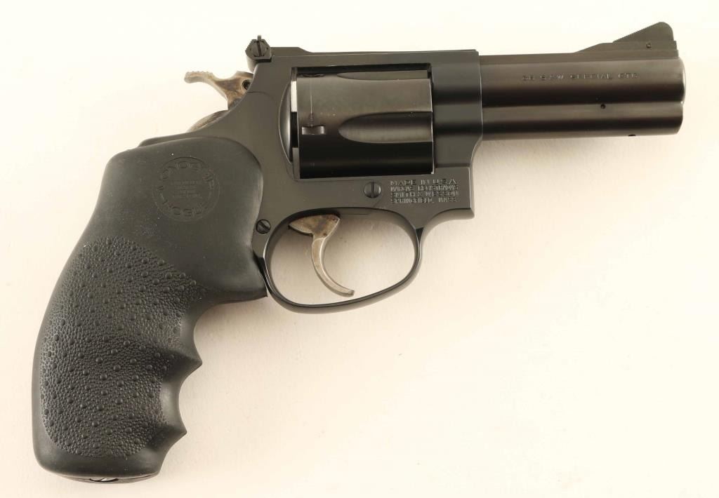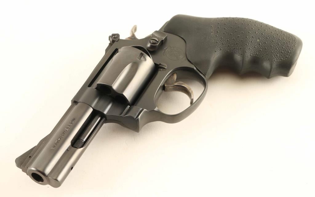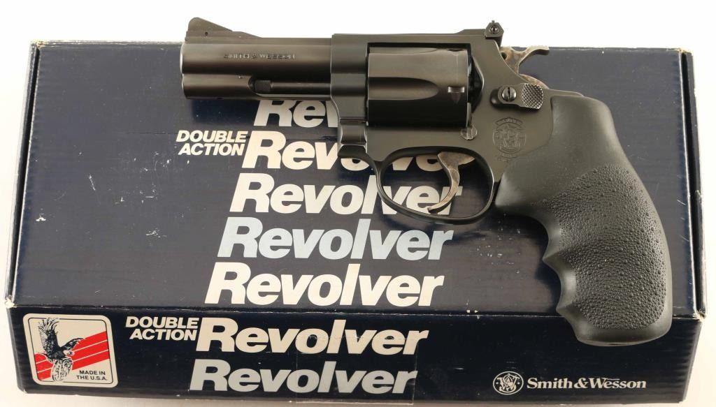 Revolver, 5-shot. 1989 special limited edition of the Model 36. 3" heavy, full lug barrel. Adjustable rear sights. Blued finish. Case-hardened hammer, serrated trigger.. Black rubber, Hogue grips. Bore, and cylinder chambers are excellent/bright. Action is tight. Cylinder indexes properly. Finish is about 99%, with a couple of minor scratches. grips are excellent. Comes in the original S&W box. Revolver is in near new condition. NRA Condition-Excellent. Modern Firearm.