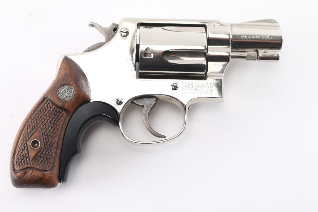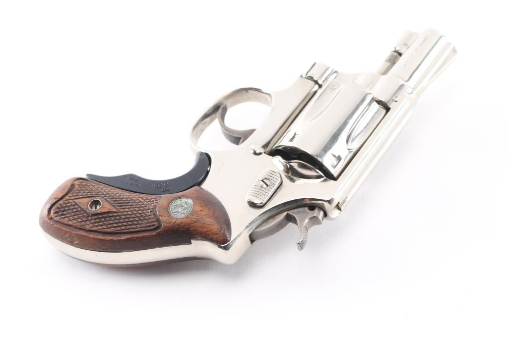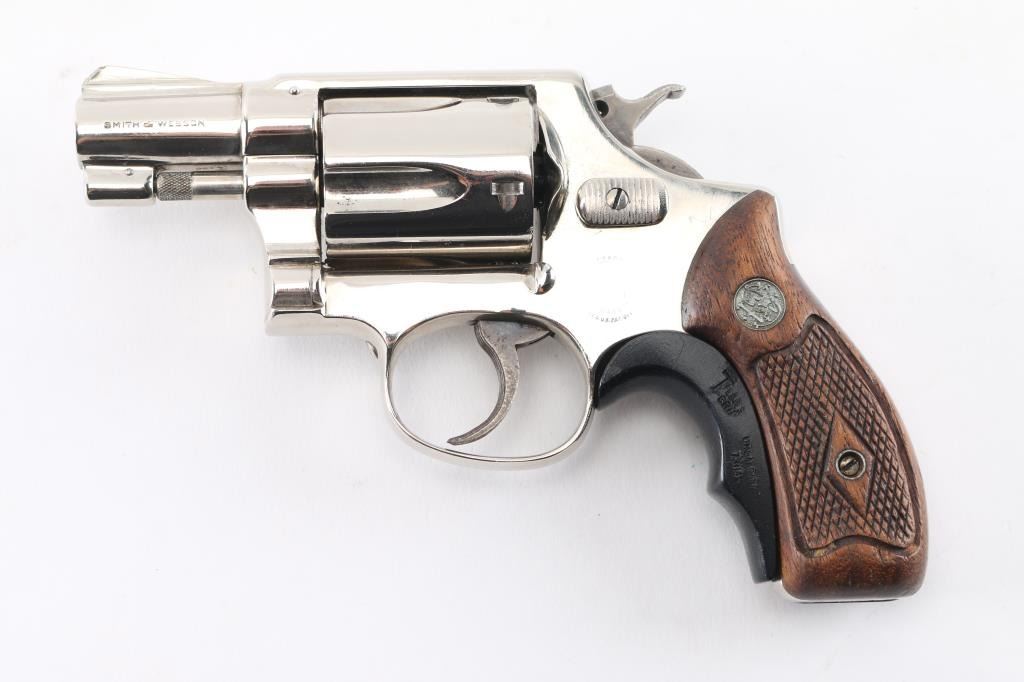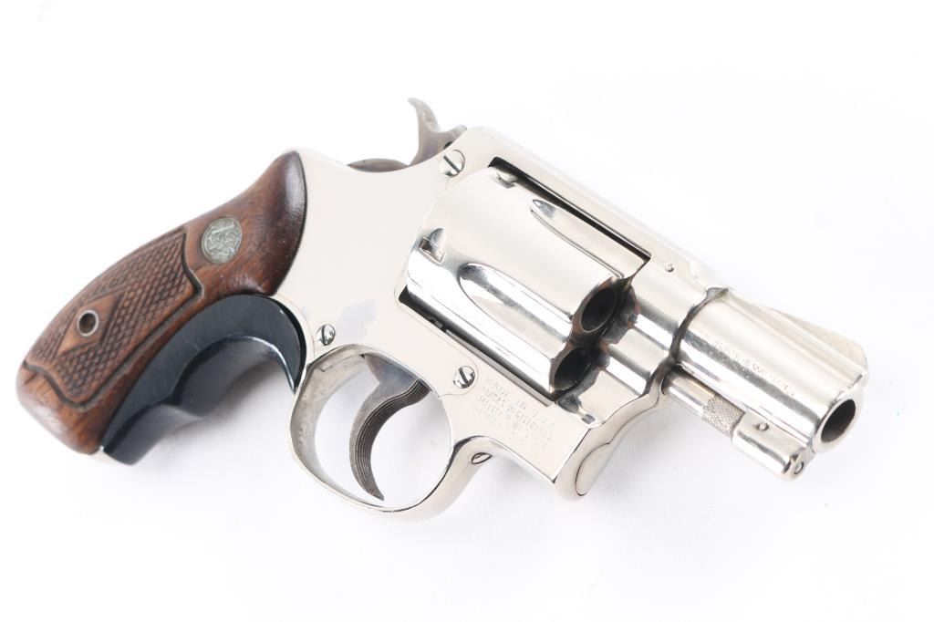SN: 9972 Pre-Model 36. "Pre-Model 36" refers to a Chiefs Special revolver manufactured before 1957, when the model designation system was implemented. Built on a round butt J frame, nickel finish, case colored hammer and trigger, 2" pinned barrel with ramp front sight, early checked wood diamond grips with S&W medallions, early round triggerguard. The four digit serial number is matched on the butt, barrel and cylinder, flat latch cylinder release. Tylers grip adapter attached. Bore is bright with good rifling with several small areas of light pitting, grips are overall good sound with some wear to the checkering and a couple of minor chips, nickel finish is about 75% with some loss from flaking on the right frame and cylinder, the S&W trademark is faint from handling, action is smooth with tight lock-up. NRA Condition-Good. C&R firearm.