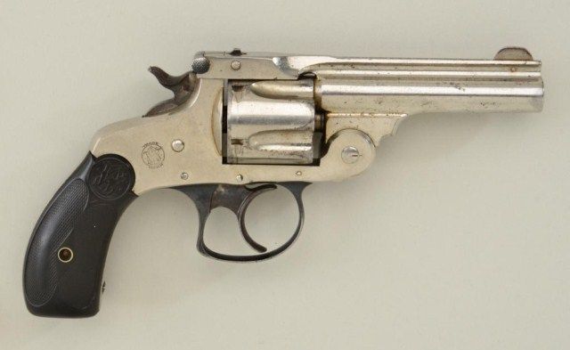 Smith & Wesson .38 DA 4th Model revolver, .38 cal., 3-1/4” barrel, nickel finish, checkered black hard rubber grips, inscribed on backstrap “Am. Ex. Co. 1525”, #461670. This gun is in overall very good to near fine condition showing the majority of its frosted nickel finish, crisp action, sharp markings, fine bore and very good grips. Formerly in the Dr. John Hall collection, founding member of the S & W Collector’sAssoc. Est.: $300-$600.