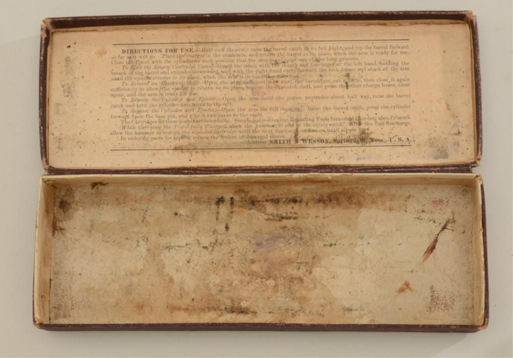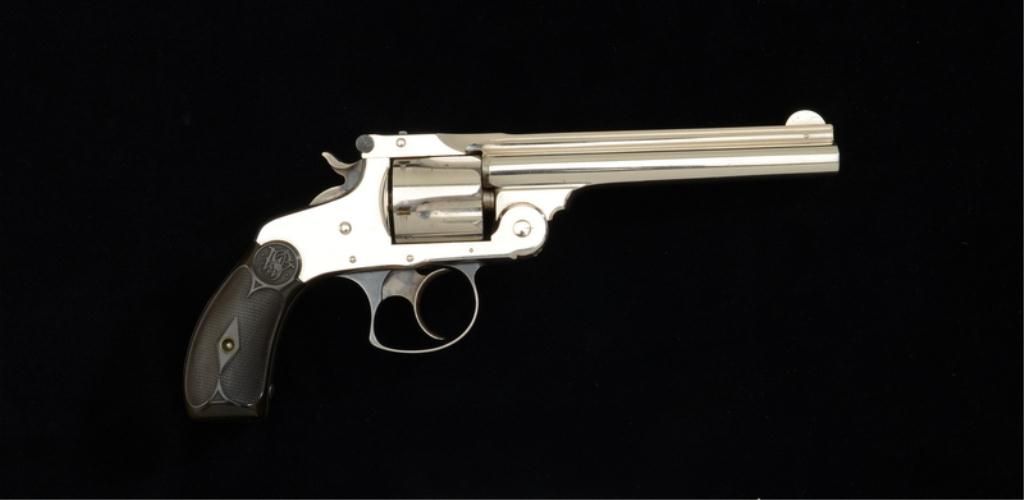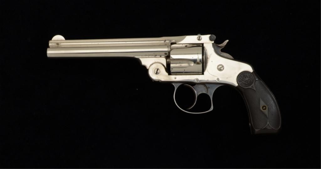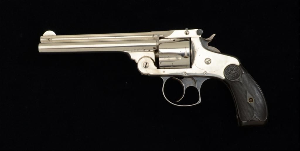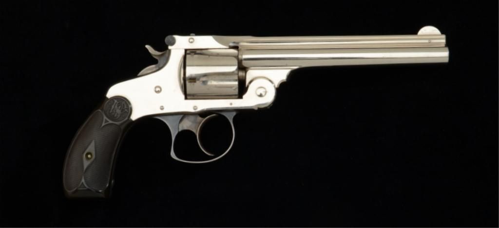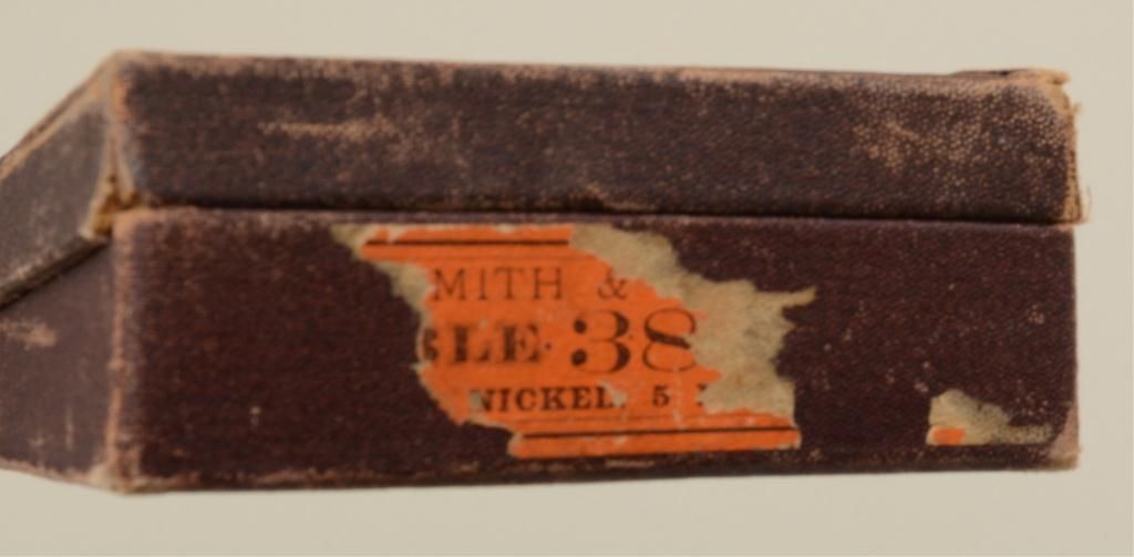 Smith & Wesson .38 DA top break Third Model revolver, .38 cal., 5” barrel, nickel finish, checkered black hard rubber grips, #302278 in factory cardboard box with partial orange end label. This gun is in overall fine toexcellent condition showing approx. 97% original finish, all matching numbers, fine bore, crisp action, sharp markings, fine grips; factory box is overall good with some edge wear and fraying to brown fabriccovering; Directions For Use on inside of lid, one interior trim piece absent; approx. 30% end label remaining including correct caliber, finish and “5” for barrel length. From the Dr. John Hall Collection. Est.:$500-$1,000.