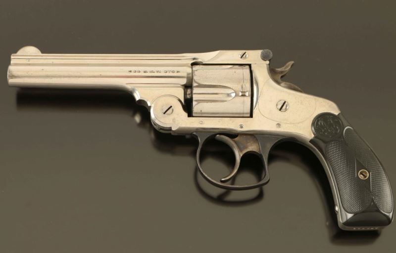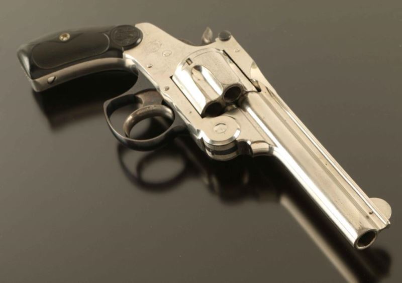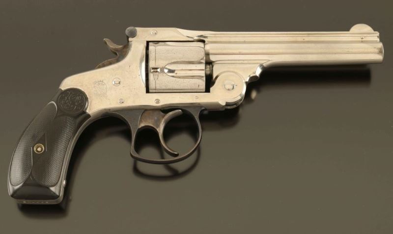 '4th Model' Vintage top-break double action revolver chambered in .38 Smith & Wesson, manufactured circa 1895-1909. Features a nickel plated finish, ribbed 4" barrel, pinned round blade front sight, notched rear sight on the "T" shaped barrel latch, fluted five shot cylinder with automatic extractor, smooth case hardened trigger, squareback recurve trigger guard with blued finish, .300" knurled trigger spur, round butt frame and two-piece diamond checkered black hard rubber grips with S&W monograms. Revolver retains nearly all of it's original nickel plated finish showing slight losses at the muzzle & on the cylinder with scattered oxidation on the right side of the frame and cloudiness on the backstrap & right side of the barrel. Action is crisp with very good lock-up, the bore is good with light pitting, markings are sharp and the matching hard rubber grips are very good with worn points. Condition is NRA Fine. ***C&R Firearm***