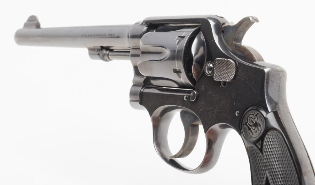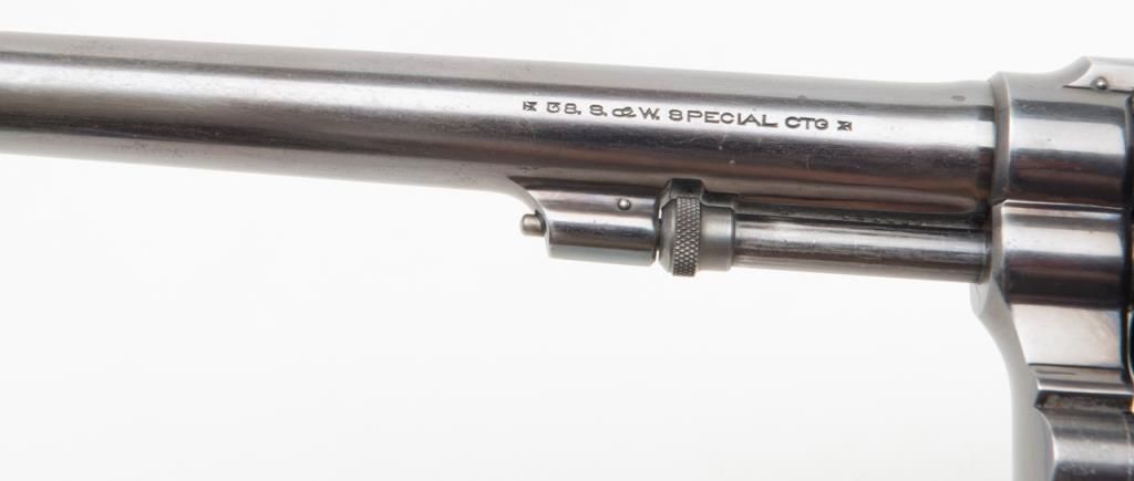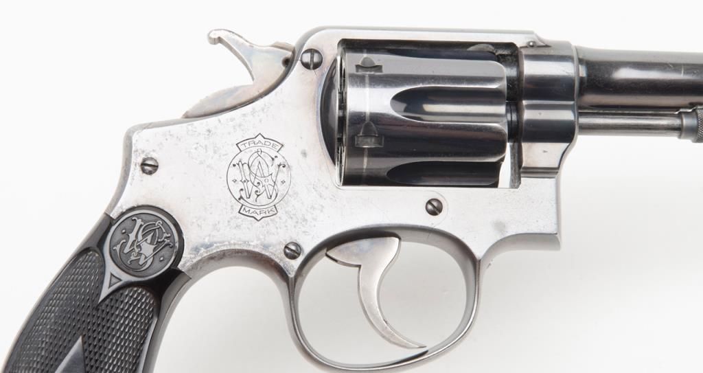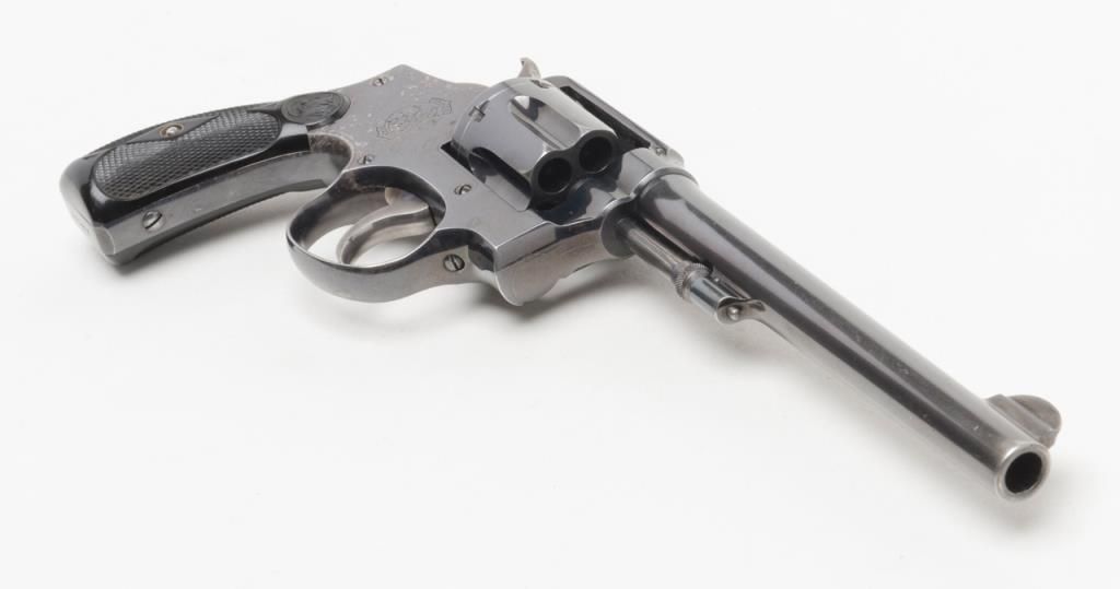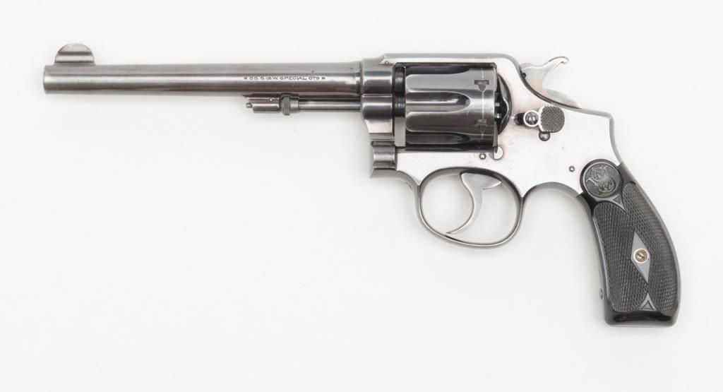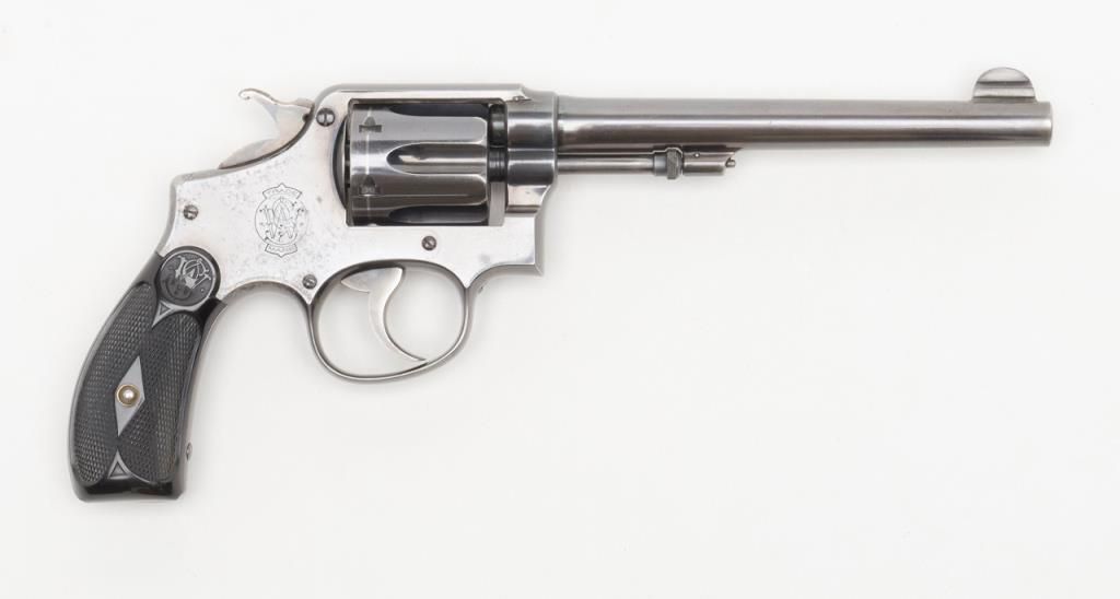 Smith & Wesson 38 Hand Ejector DA revolver 1st Change, .38 cal., 6-1/2” barrel, blue finish, #121436 (circa 1907), approx. 85%-95% high polish blue, checkered hard rubber grips, 80%-90% case colors on trigger and hammer; good action and fine bore. (C&R). Est.: $500-$1,000.