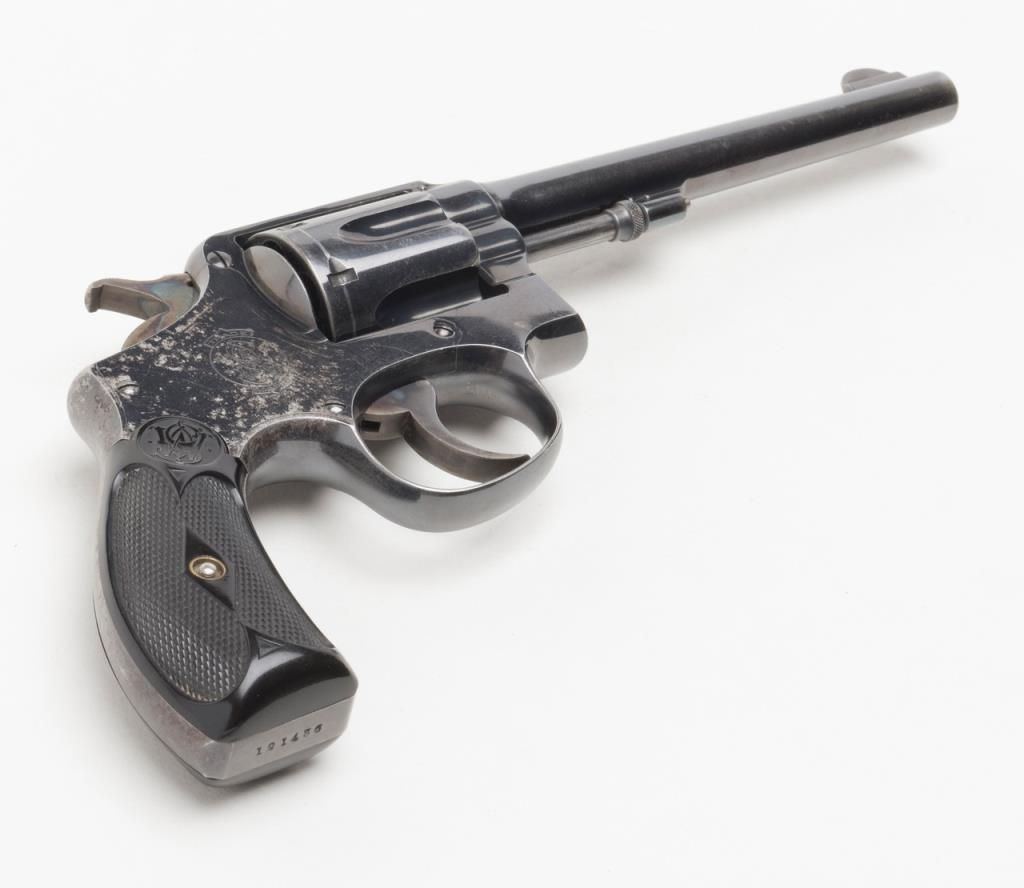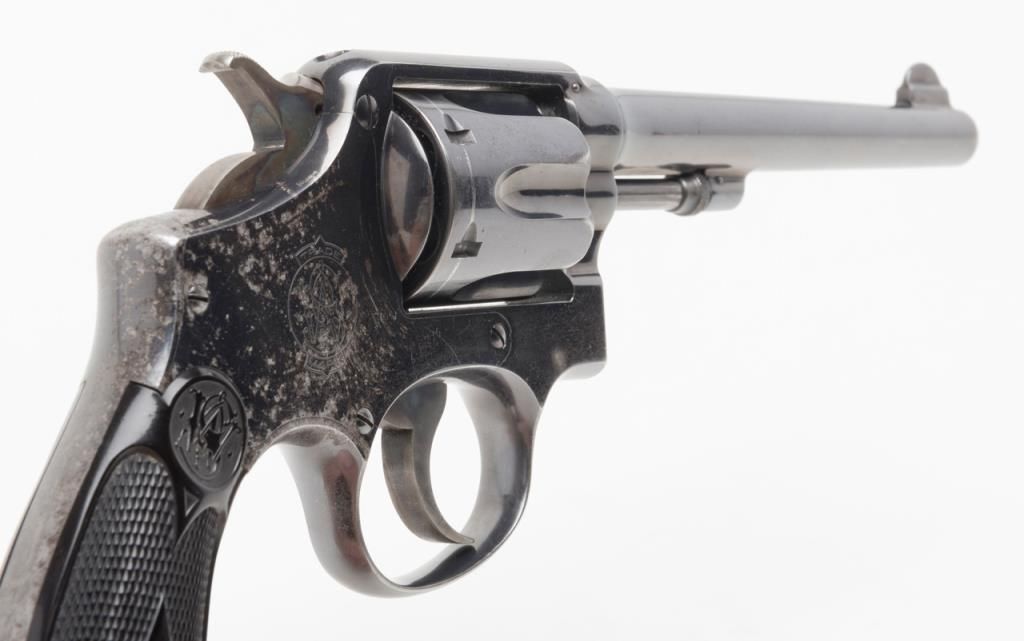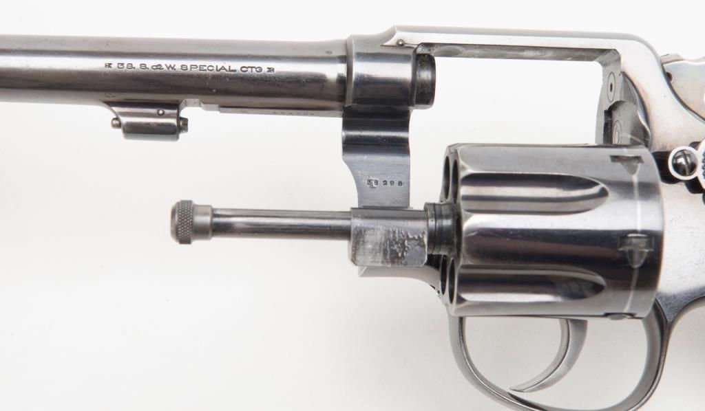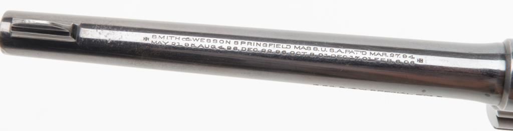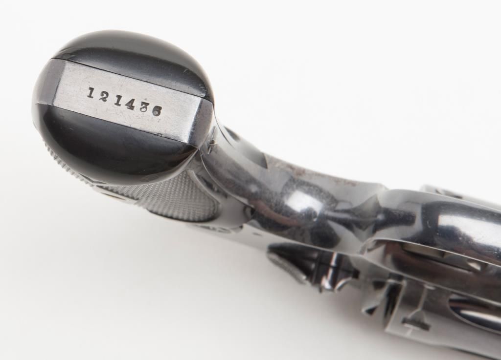 Smith & Wesson 38 Hand Ejector DA revolver 1st Change, .38 cal., 6-1/2” barrel, blue finish, #121436 (circa 1907), approx. 85%-95% high polish blue, checkered hard rubber grips, 80%-90% case colors on trigger and hammer; good action and fine bore. (C&R). Est.: $500-$1,000.