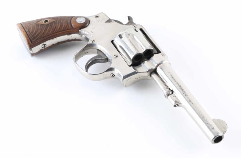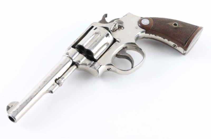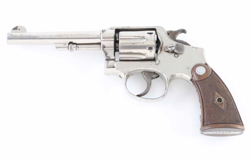 Medium frame double action revolver. Features nickel finish, 5" barrel, forged half moon front sight, square notched rear sight, non-shrouded ejector rod, fluted six-shot cylinder, smooth .240" trigger, .240" hammer, five screw square butt K service frame, two-piece checkered walnut grips with silver S&W medallions. Bore is very good condition. Revolver retains approximately 70% of it's nickel finish with peeling on some edges, small areas of puckering. Brown color showing in areas of finish loss: front sight, top strap, back strap, edge of yoke, rear of cylinder. Some patina and light rust on grip straps, sides of cylinder, sides of hammer.. Action is smooth with good lock up. Grips are good to very good condition with smoothing of checkering points and slight loss of finish. Numbers on cylinder & barrel match frame. Condition is NRA Good++ *** C&R Firearm ***