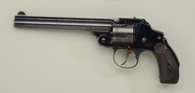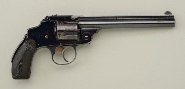 Smith & Wesson .38 Safety Hammerless 3rd Model DA revolver, .38 cal., desirable 6” barrel, blue finish, checkered black hard rubber grips, #84167. This gun is in overall fine to excellent condition showing approx.85% original blue with some scattered spots of erosion and some flaked losses confined primarily to the cylinder, crisp action, sharp markings and fine bore; grips are overall fine. Formerly in the Dr. John Hallcollection, founding member of the S & W Collector’s Assoc. Est.: $400-$800.