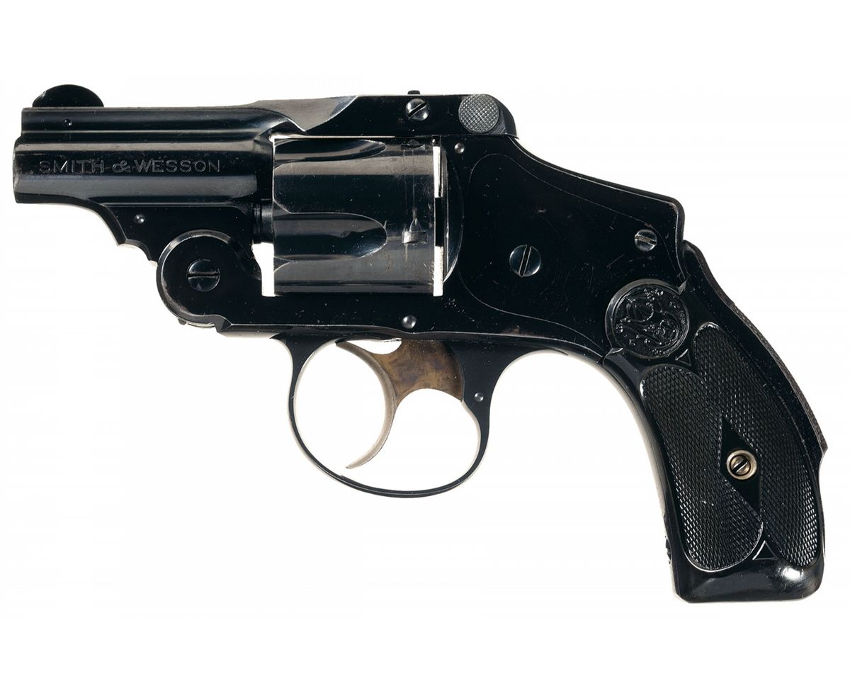 Very late manufacture S&W revolver made circa 1939-1940. This example has a 2 inch barrel, marked "SMITH & WESSON" on the left side and the caliber marking is stamped on the right side. The frame has the S&W trademark along with "MADE IN U.S.A." on the right side. Matching serial number on butt, cylinder, barrel and latch. Blue finish with casehardened trigger and checkered S&W monogram grips with the right panel numbered to the gun.
