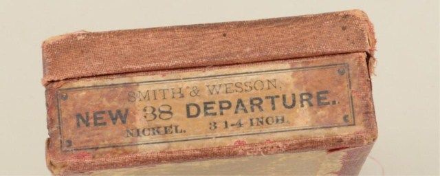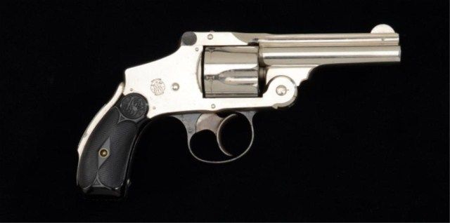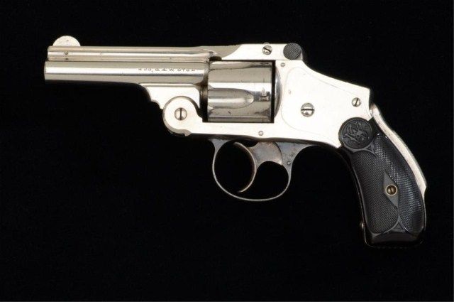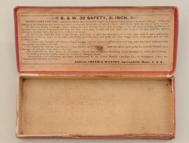 Smith & Wesson .38 Safety Hammerless DA revolver, .38 S&W cal., 3-1/4” barrel, nickel finish, checkered black hard rubber grips, #190246 (all matching visible numbers) with factory cardboard box and correct end label.This gun is in overall excellent condition showing approx. 98% original nickel finish, overall good bore with a couple spots of erosion, crisp action and markings, excellent grips; the box is overall good withscattered wear and stain spots; interior lid shows Instructions for Use, insert shows some fraying and repair. From the Dr. John Hall Collection. Est.: $600-$1,200.