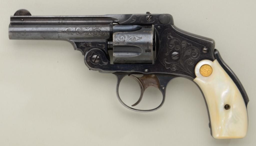Smith & Wesson .38 Safety Hammerless DA revolver, .38 S&W cal., 3-1/4”, blue finish, factory style engraved, gold medallion pearl grips, #127718 (all visible numbers matching). This gun is in overall fine tonear excellent condition showing approx. 75% muted original blue finish, no factory letter available, good bore, crisp action, sharp markings; fine iridescent pearl grips. From the Dr. John Hall Collection. Est.:$700-$1,400.