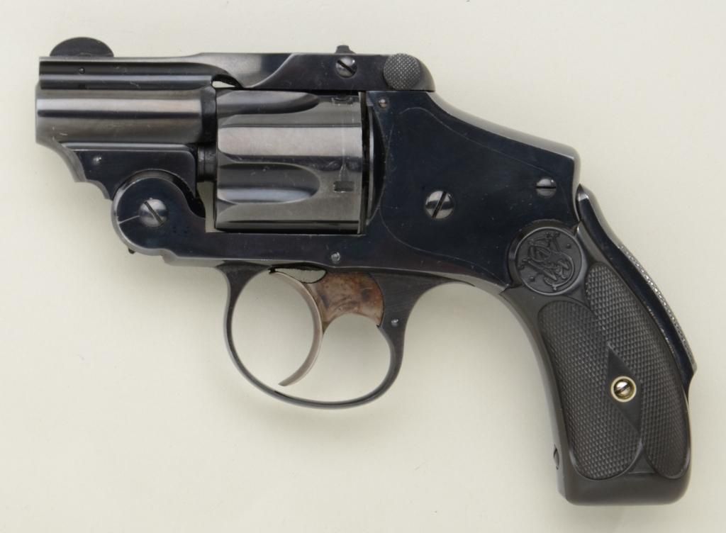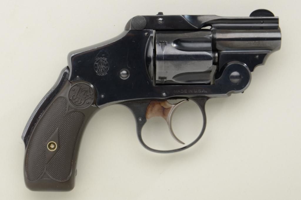 Smith & Wesson .38 Safety Hammerless DA revolver, .38 cal., unusual 1-1/2” barrel, blue finish, checkered black hard rubber grips that are numbered to this gun (balance of visible numbers also match with additional “B” on barrel assembly, #259765. This gun is a bit of an enigma as it only has the S&W seal on the right side of the frame and “MADE IN USA” on the right side of the frame above the trigger but no roll address on the topof the barrel or caliber marking; muzzle crown appears factory correct as does the finish which is retained in almost its entirety; fine bore, action, markings and grips. Should be factory lettered. From theDr. John Hall Collection. Est.: $350-$700.