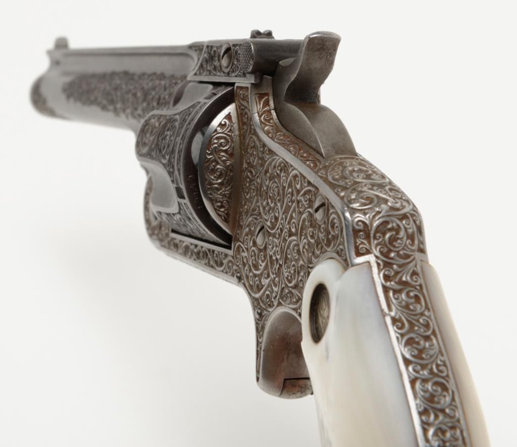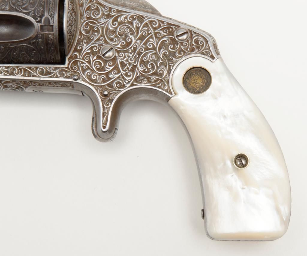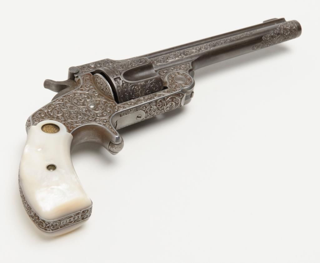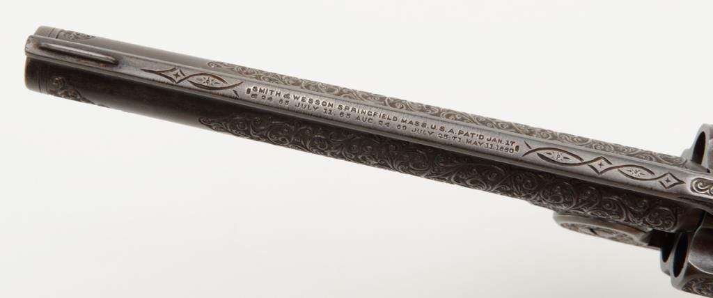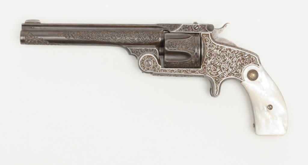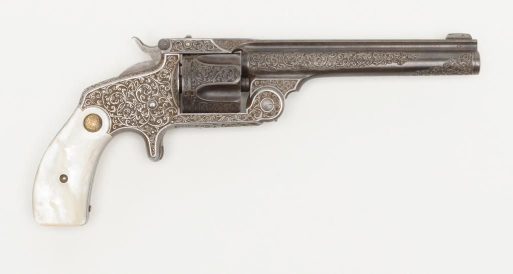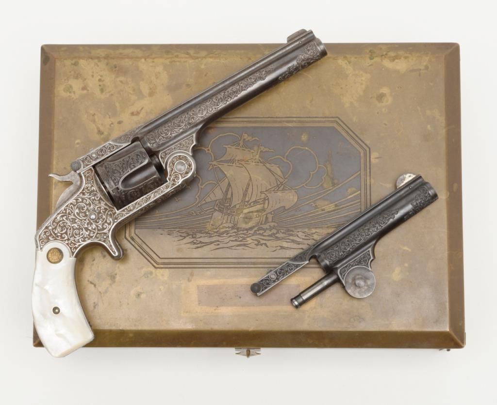 Smith & Wesson .38 Single Action Second Model revolver, custom high relief engraved in old fitted lined brass covered casing with extra barrel engraved en suite, .38 cal., 5” barrel (extra barrel is 3-1/4”), blue finish, factorypearl gold medallion grips, #81871 in overall very good condition showing a dark patina mixed with blue on the barrel and cylinder, very good bore, crisp action, good markings and beautiful iridescent pearl grips; the front sight has beenreduced in height; the extra barrel shows considerable muted blue finish with silvered front sight, near fine bore and sharp markings. The engraving on the gun is expertly accomplished. The casing is old and also of high quality with adeep patina to the brass, re-enforced edges and etched panel scenes including a sailing ship on the lid, crashing waves on the front of the case and nautical designs repeated on both sides with the wording “GRAMMES” and “ALLENTOWN” incorporated in twin anchors of the scenes. (Antique). Est.: $2,000-$4,000