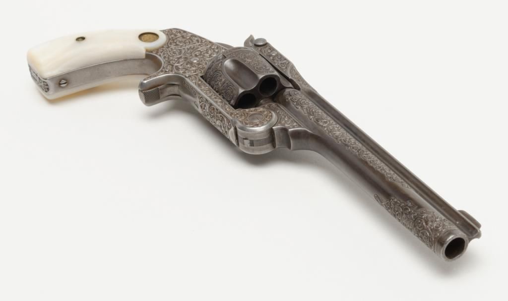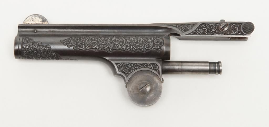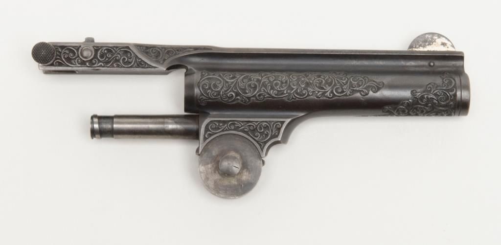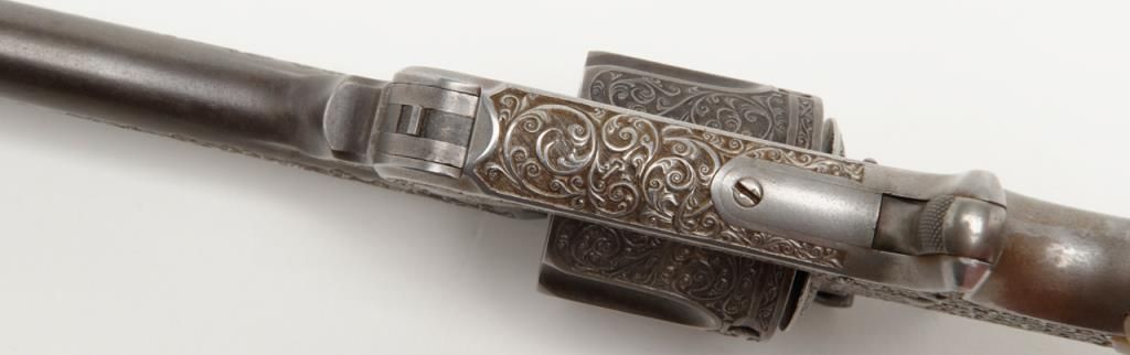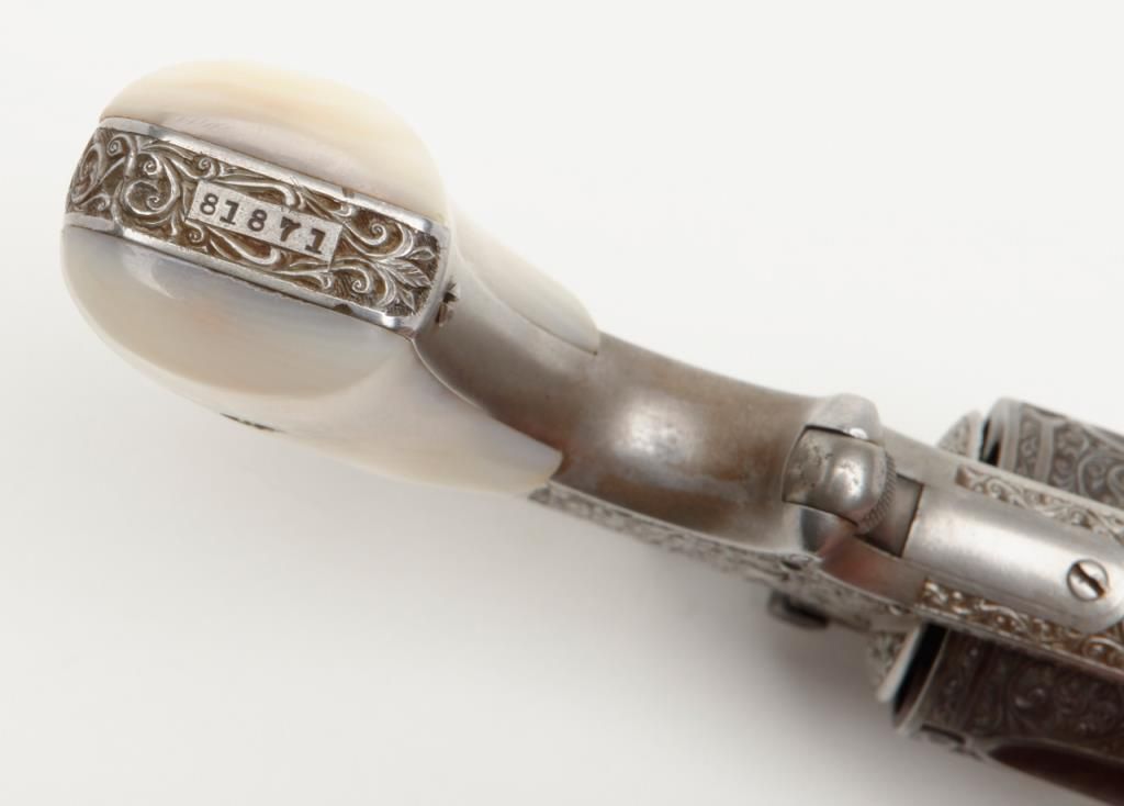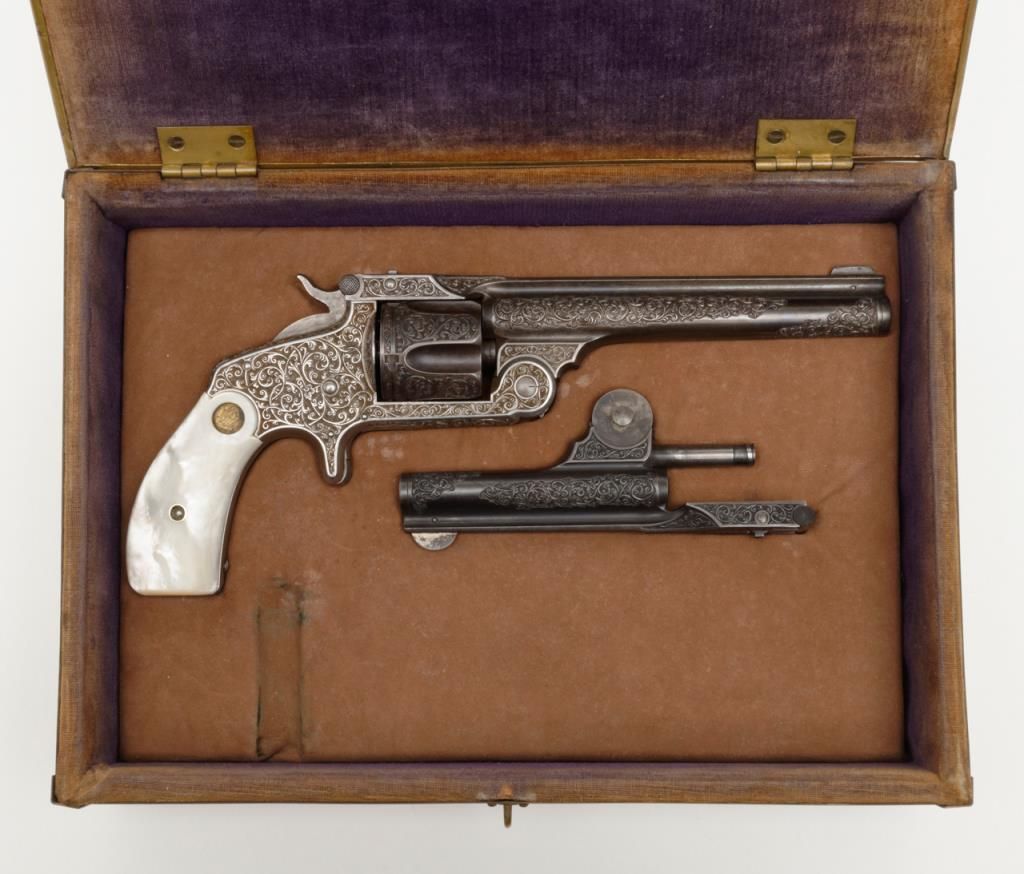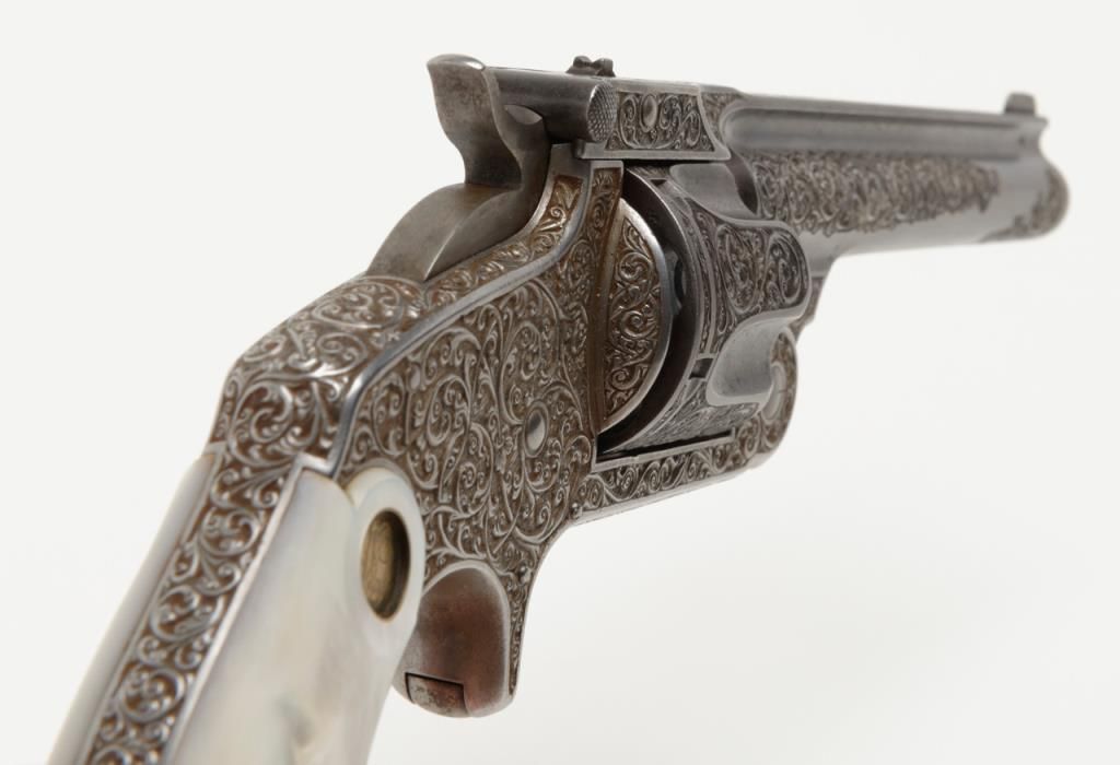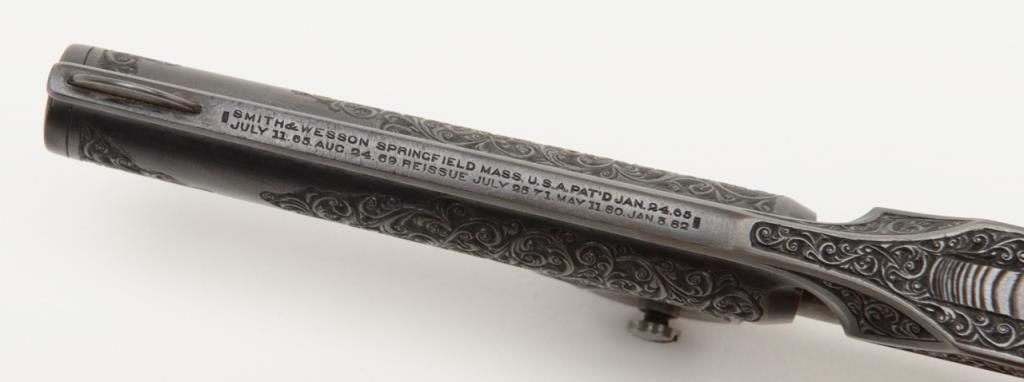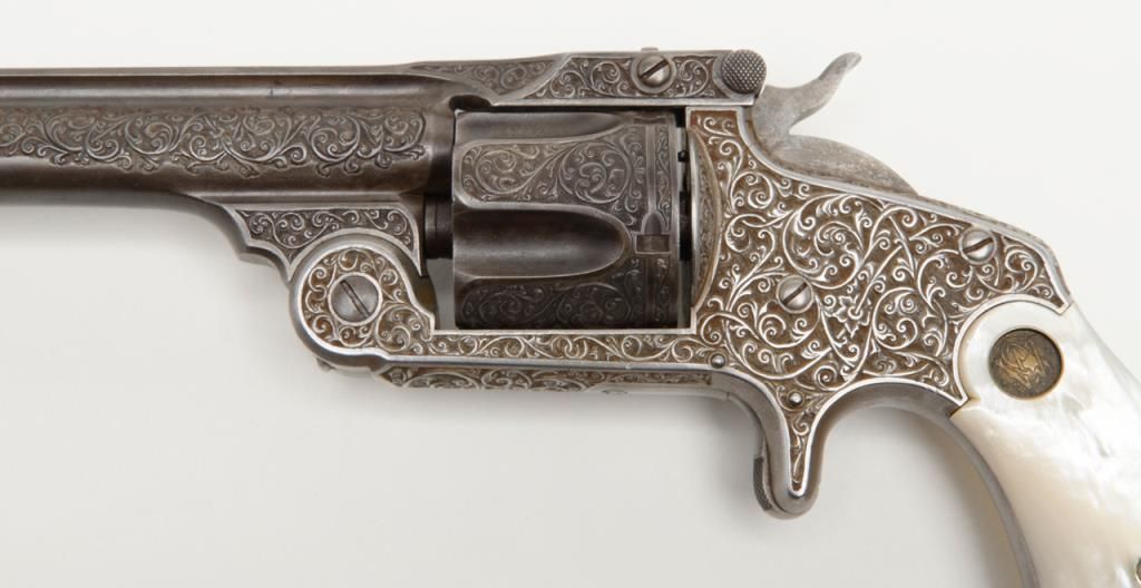 Smith & Wesson .38 Single Action Second Model revolver, custom high relief engraved in old fitted lined brass covered casing with extra barrel engraved en suite, .38 cal., 5” barrel (extra barrel is 3-1/4”), blue finish, factorypearl gold medallion grips, #81871 in overall very good condition showing a dark patina mixed with blue on the barrel and cylinder, very good bore, crisp action, good markings and beautiful iridescent pearl grips; the front sight has beenreduced in height; the extra barrel shows considerable muted blue finish with silvered front sight, near fine bore and sharp markings. The engraving on the gun is expertly accomplished. The casing is old and also of high quality with adeep patina to the brass, re-enforced edges and etched panel scenes including a sailing ship on the lid, crashing waves on the front of the case and nautical designs repeated on both sides with the wording “GRAMMES” and “ALLENTOWN” incorporated in twin anchors of the scenes. (Antique). Est.: $2,000-$4,000
