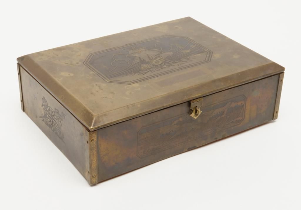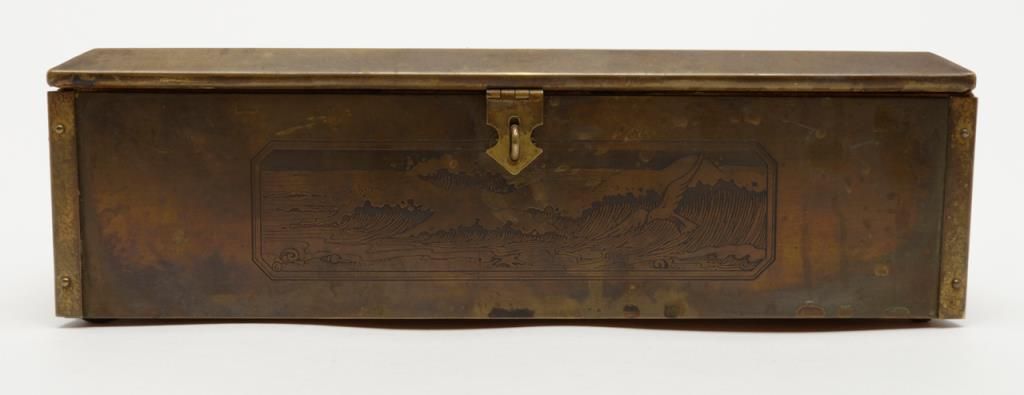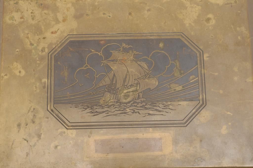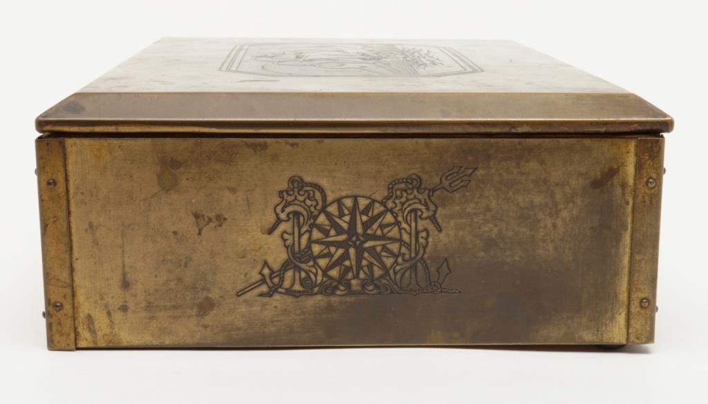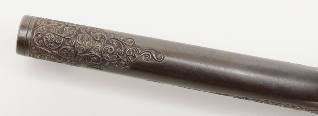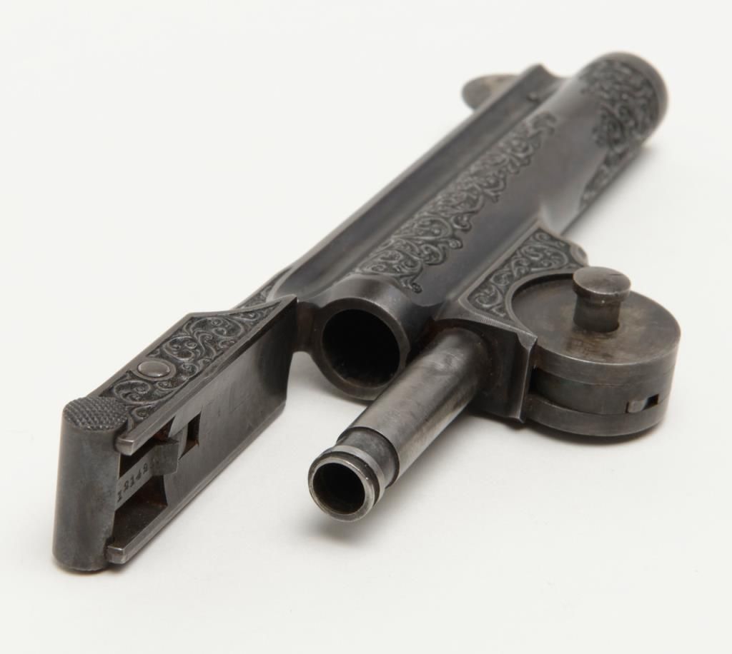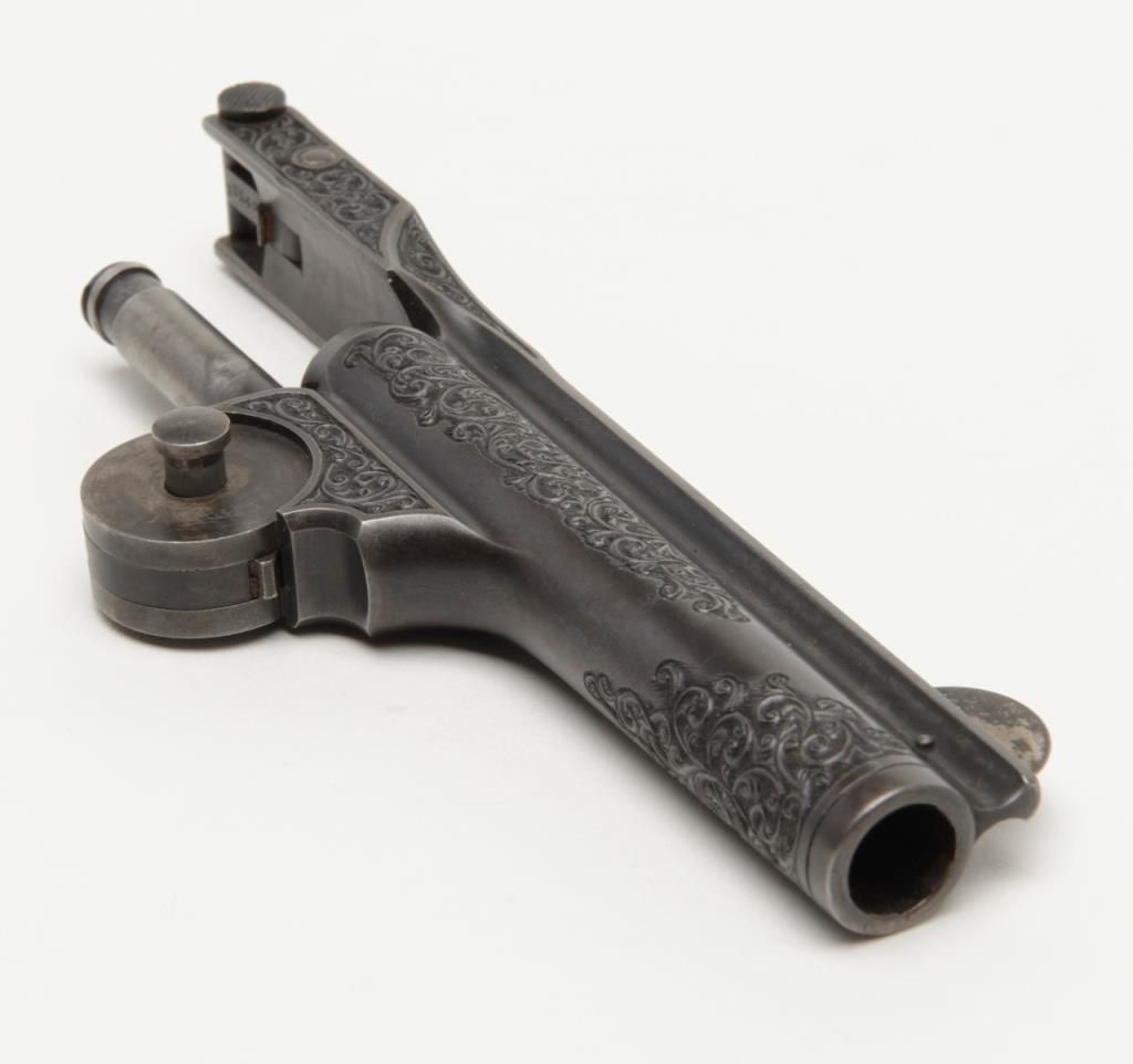 Smith & Wesson .38 Single Action Second Model revolver, custom high relief engraved in old fitted lined brass covered casing with extra barrel engraved en suite, .38 cal., 5” barrel (extra barrel is 3-1/4”), blue finish, factorypearl gold medallion grips, #81871 in overall very good condition showing a dark patina mixed with blue on the barrel and cylinder, very good bore, crisp action, good markings and beautiful iridescent pearl grips; the front sight has beenreduced in height; the extra barrel shows considerable muted blue finish with silvered front sight, near fine bore and sharp markings. The engraving on the gun is expertly accomplished. The casing is old and also of high quality with adeep patina to the brass, re-enforced edges and etched panel scenes including a sailing ship on the lid, crashing waves on the front of the case and nautical designs repeated on both sides with the wording “GRAMMES” and “ALLENTOWN” incorporated in twin anchors of the scenes. (Antique). Est.: $2,000-$4,000