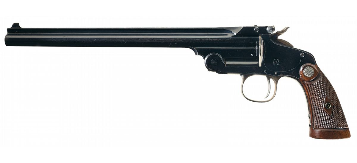 Manufactured between 1891 and 1911. The barrel has a Patridge style front sight and a windage adjustable rear sight. The barrel is stamped with the matching serial number "22654". The serial number is stamped on the butt. Fitted with a set of extended checkered walnut grips with silver S&W medallions.