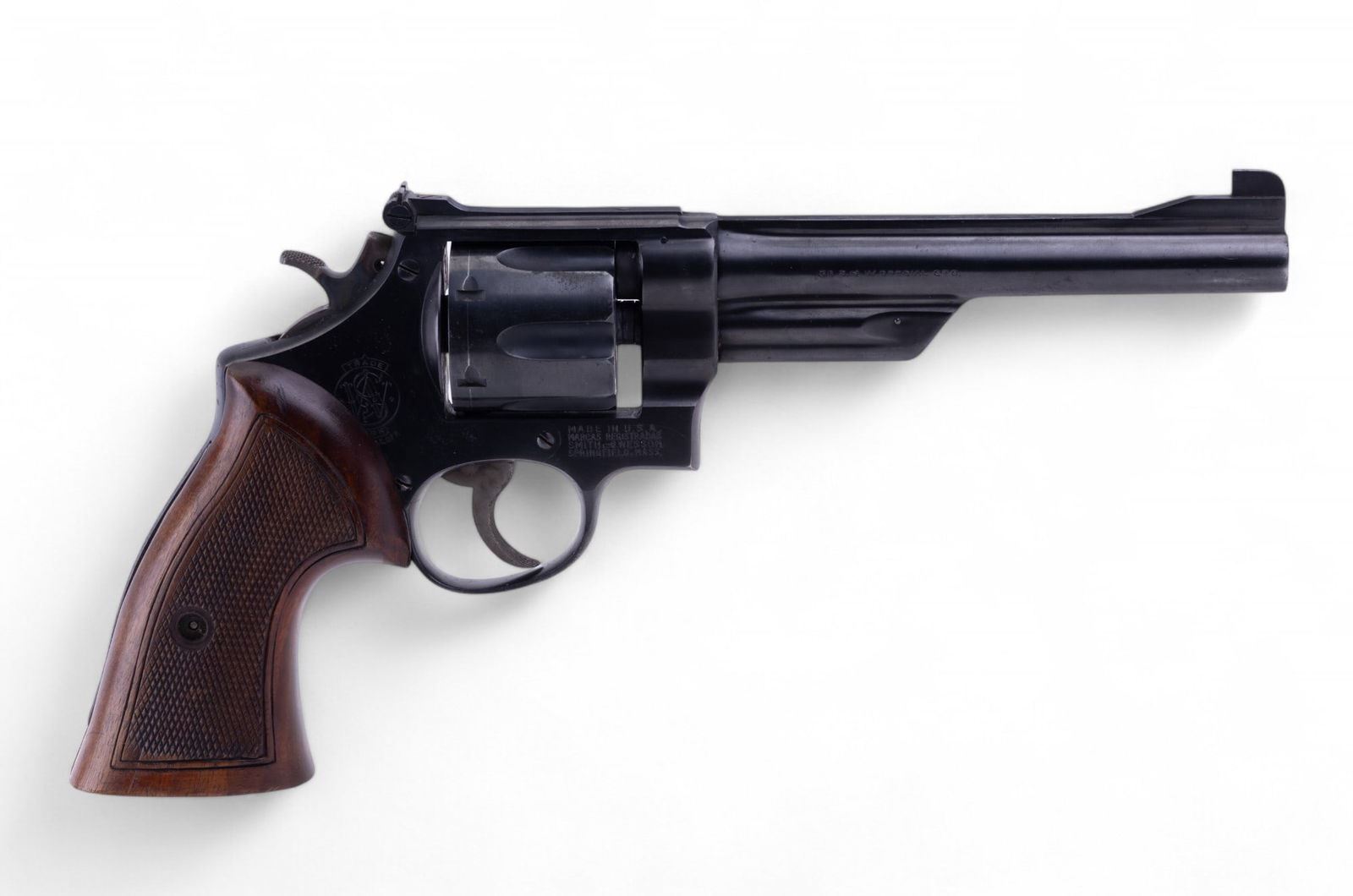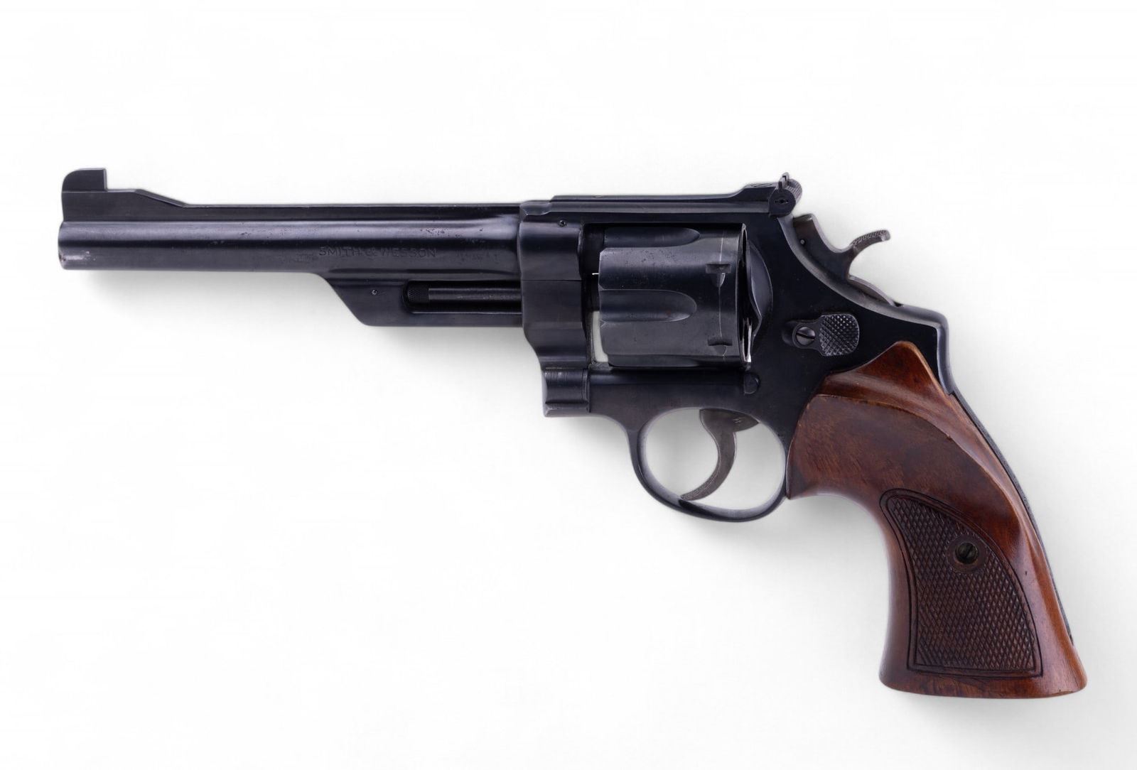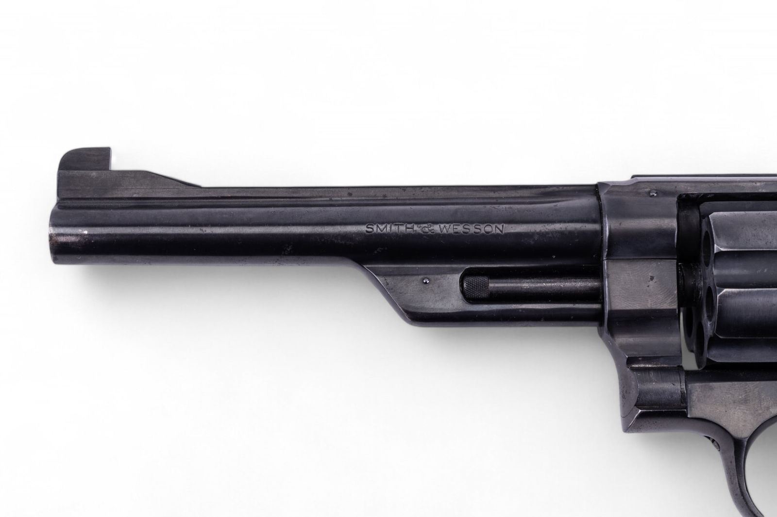Smith & Wesson 38 Special CTG Revolver with a 6" barrel, some loss to bluing on the steel and has a walnut replacement grip.