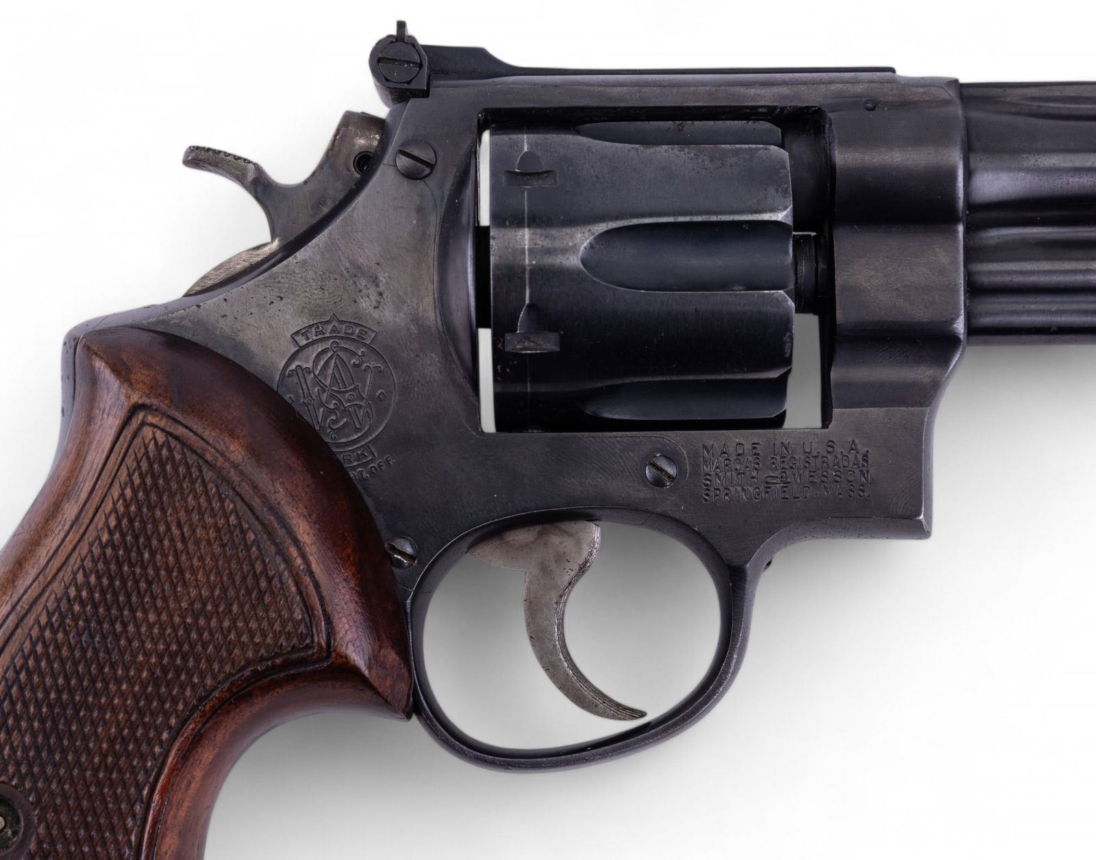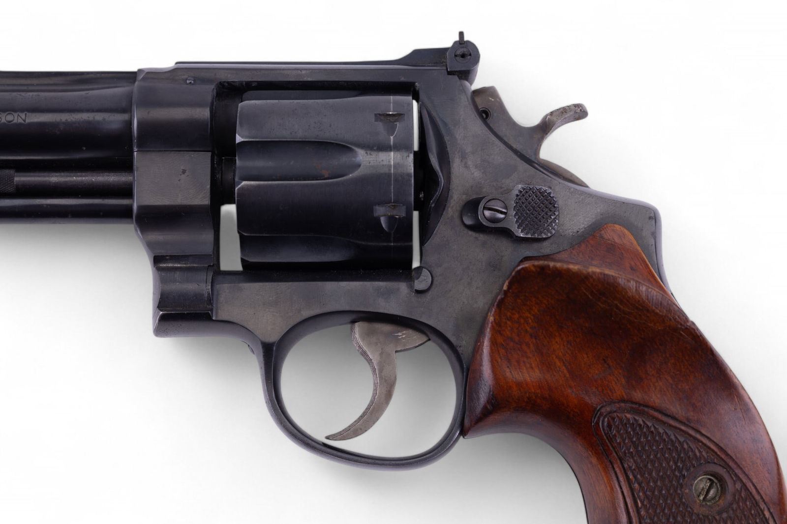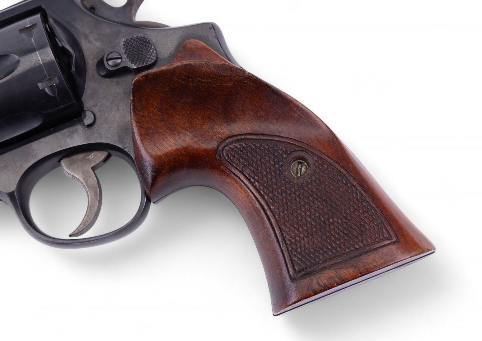 Smith & Wesson 38 Special CTG Revolver with a 6" barrel, some loss to bluing on the steel and has a walnut replacement grip.