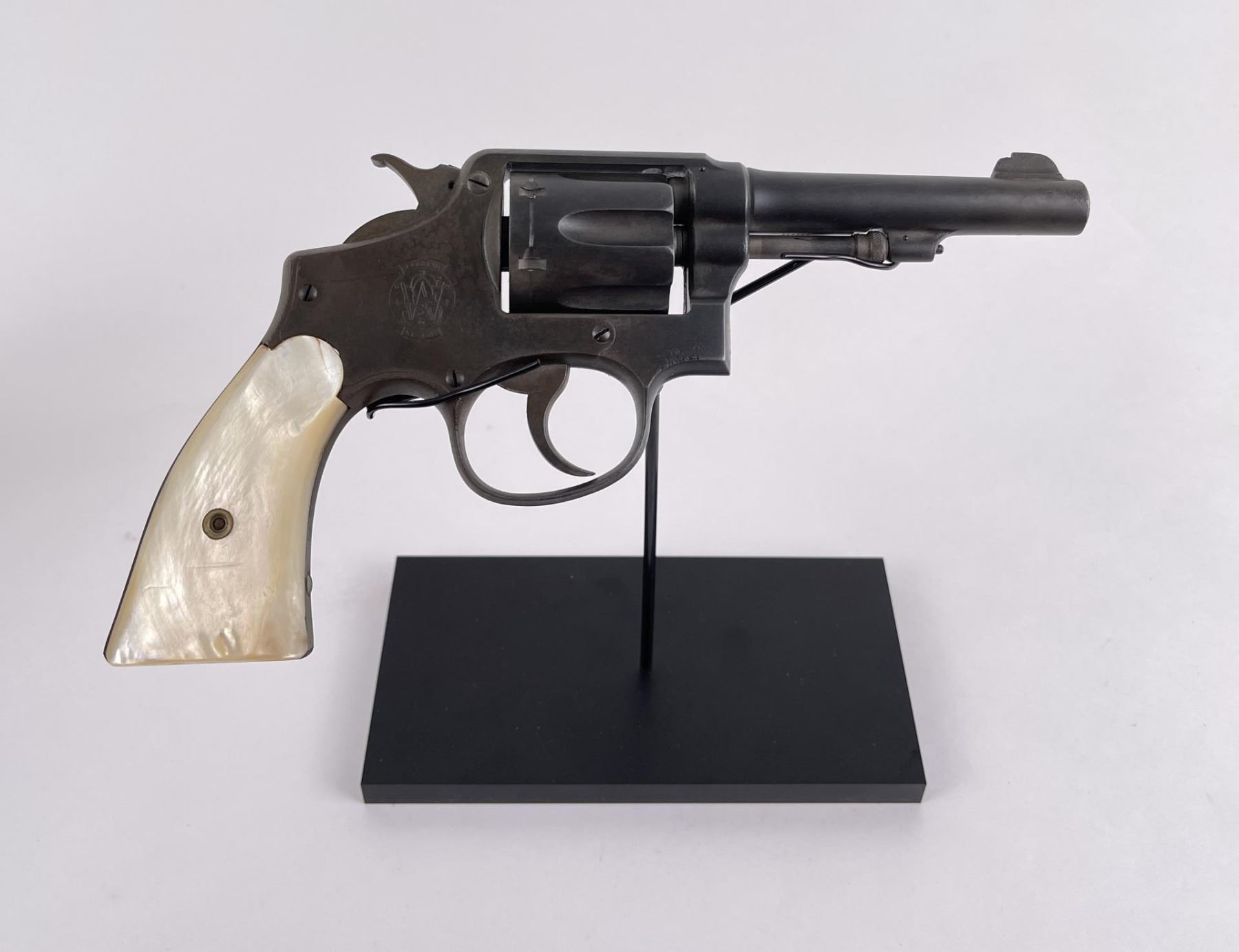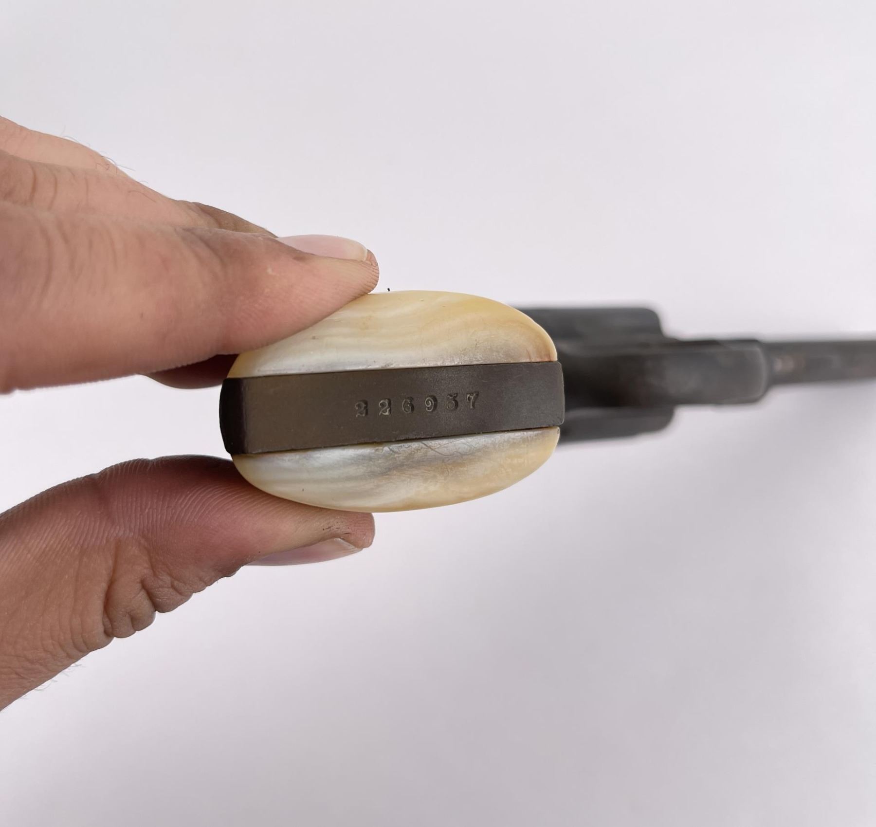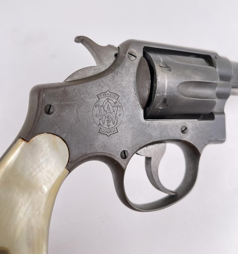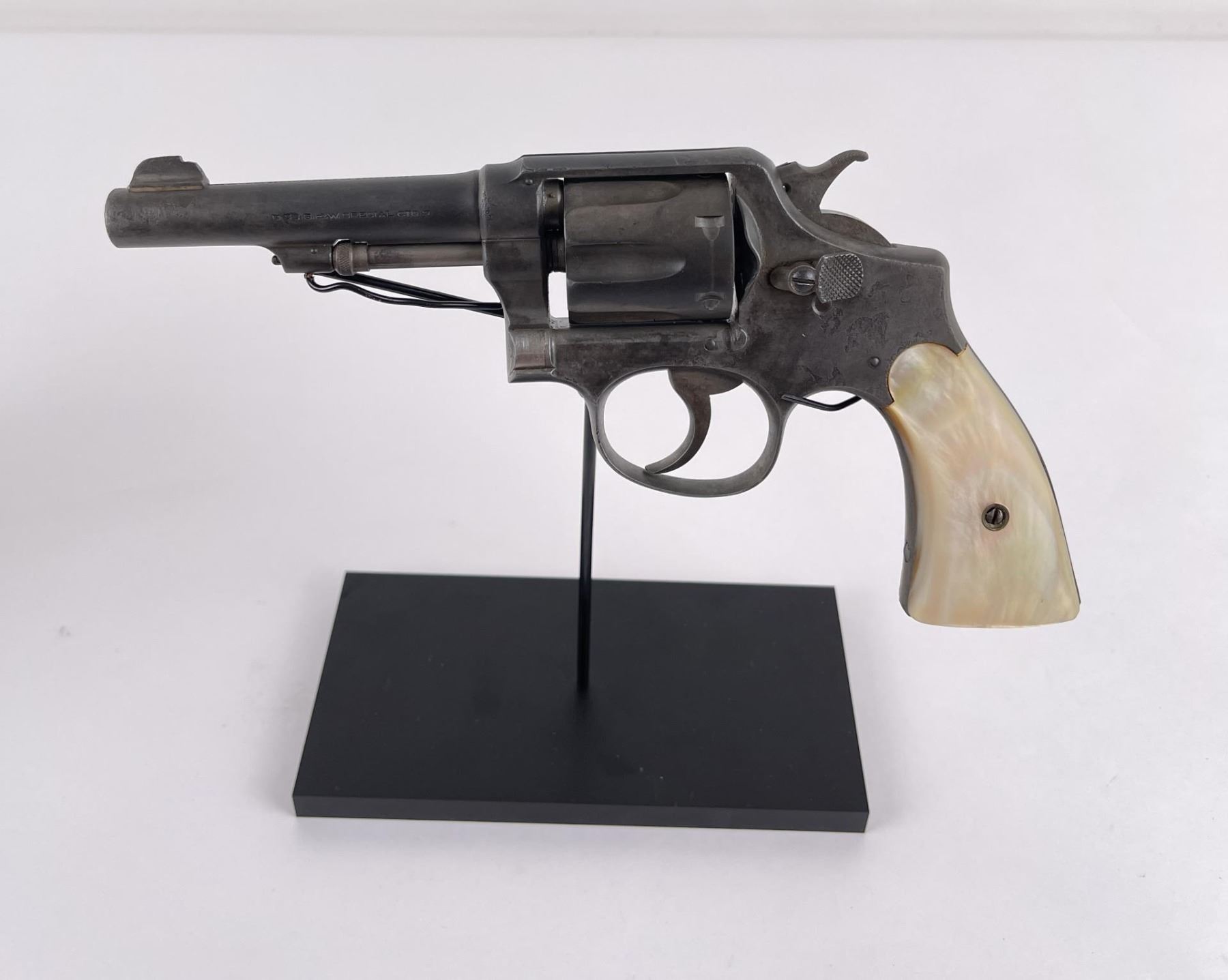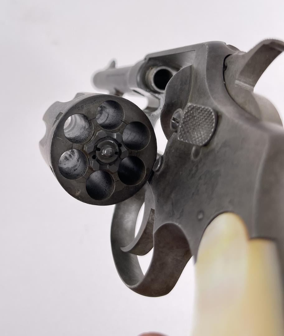 Revolver shows pitting. Mother of pearl grips. 4" barrel. Requires FFL Transfer.