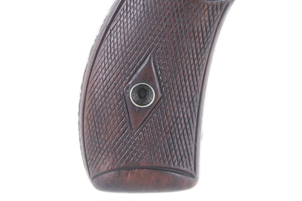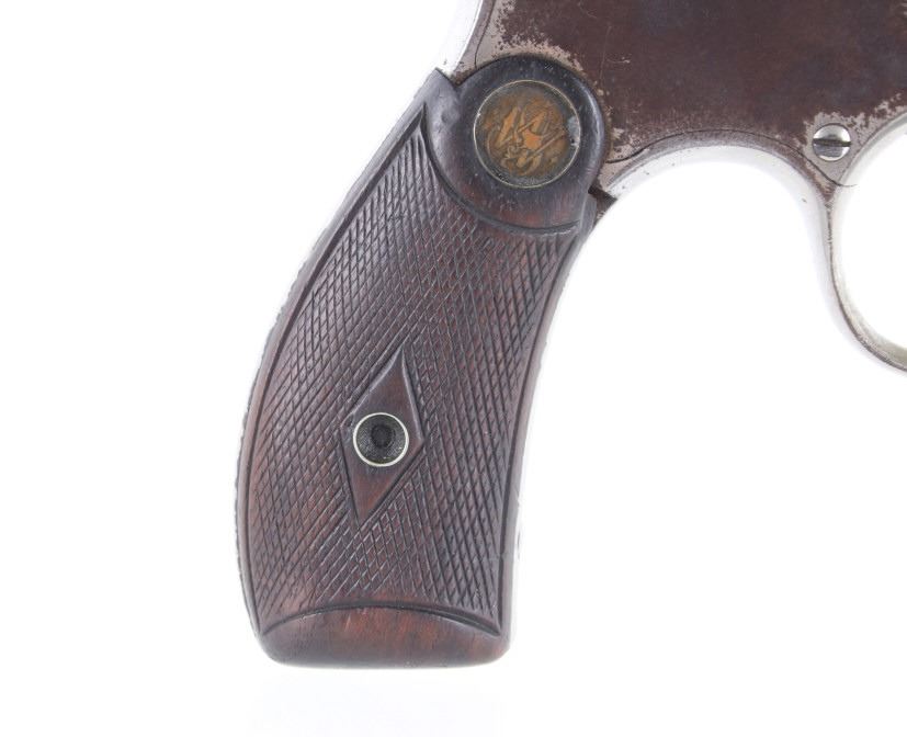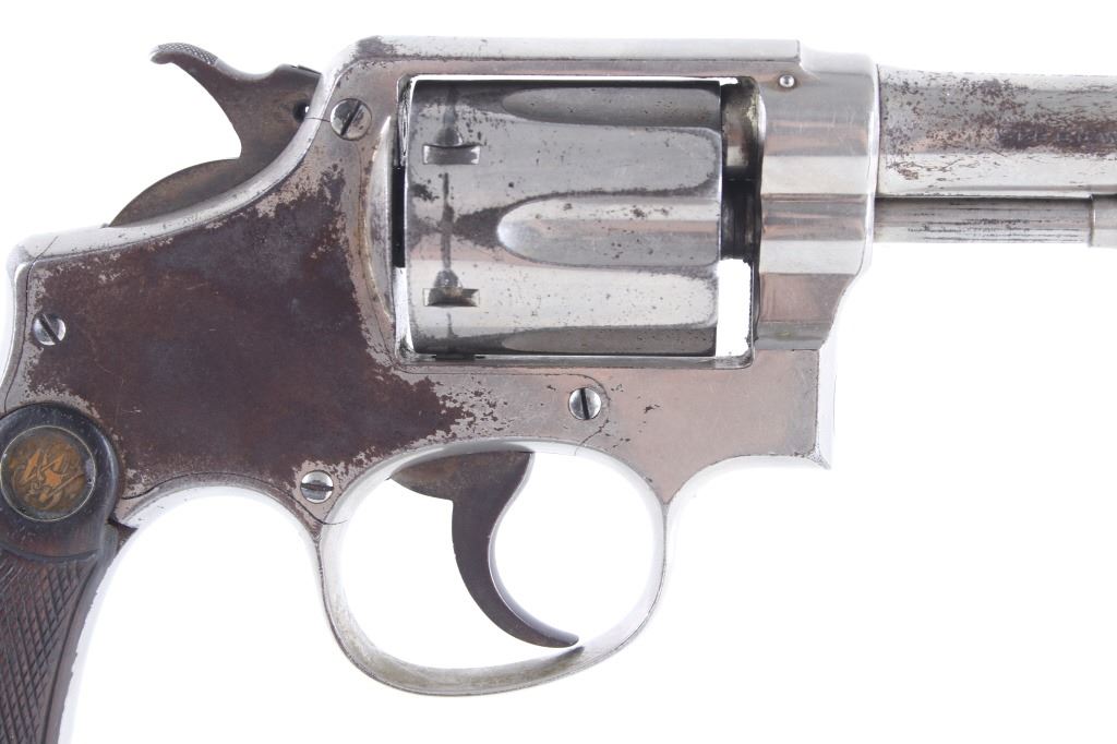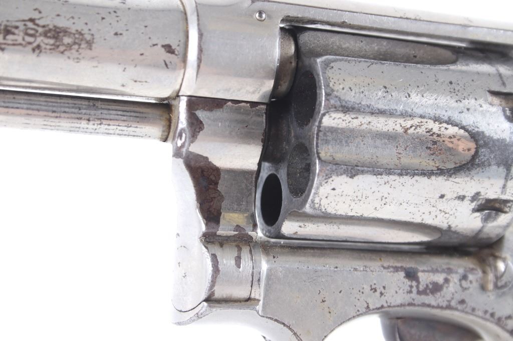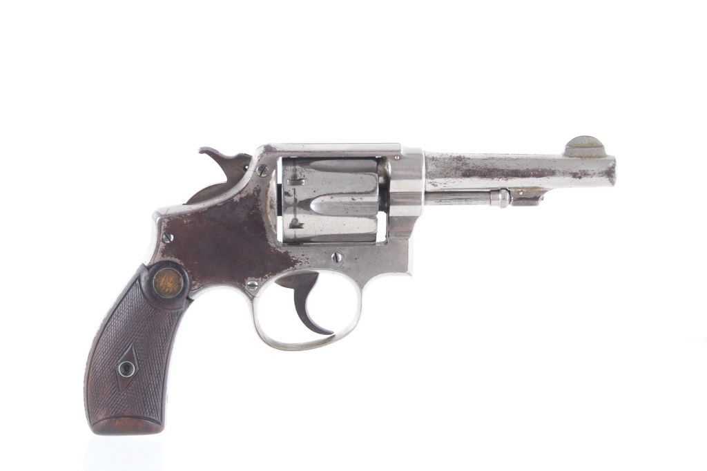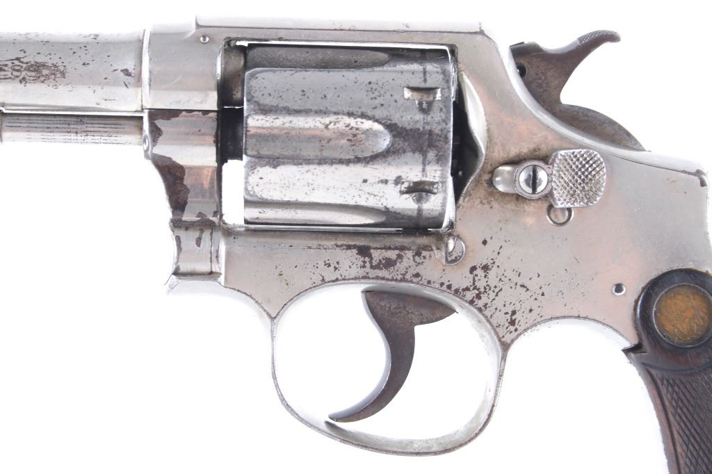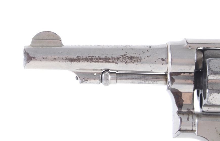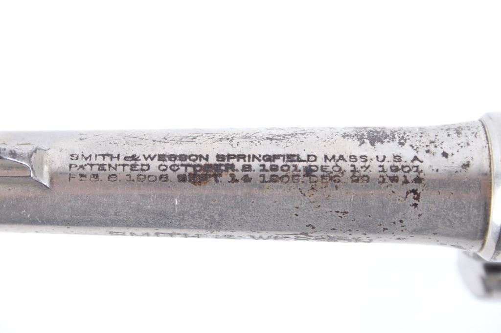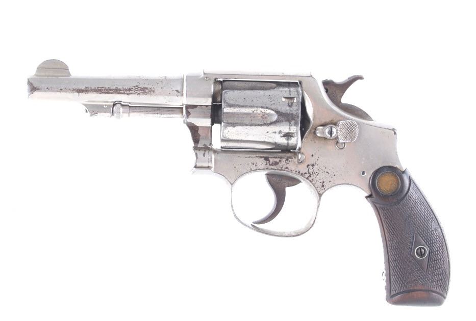 Featured in this lot we have a Smith & Wesson double action military and police revolver chambered in .38 special. This revolver was manufactured between 1915-1942 by Smith & Wesson for military or police use. The revolver displays a 4" long round barrel, six shot cylinder, checkered wood grips, double action trigger, and nickel plated finish. The barrel is marked across the left side reading "SMITH & WESSON", "SMITH & WESSON SPRINGFIELD MASS U.S.A. PATENTED OCTOBER. 8. 1901. DEC. 17. 1901. FEB. 8. 1906. SEPT. 14. 1908. DEC. 29. 1914" across the top with the right side reading ""38 S. & W. SPECIAL CTG". The wooden grips display carved checkered patterns and a brass Smith & Wesson medallion on the top of the grips. Mechanically the revolver shows a tight trigger and good timing on the cylinder. The revolver shows good condition overall with wear across the finish. The revolver weighs 1lbs 12oz. Serial Number: 326157. This firearm qualifies as a Curio & Relic firearm, and requires FFL Transfer or NICS Background Check.
