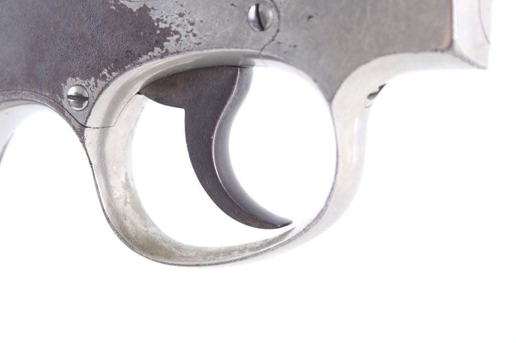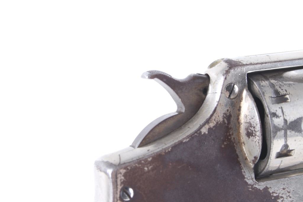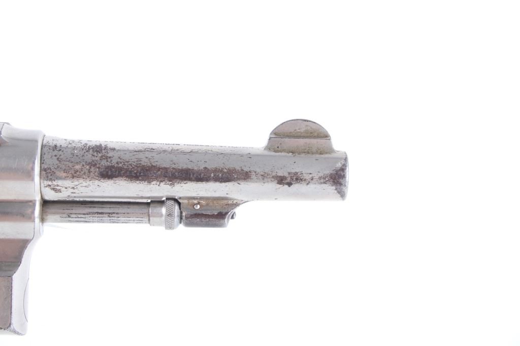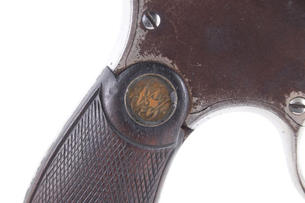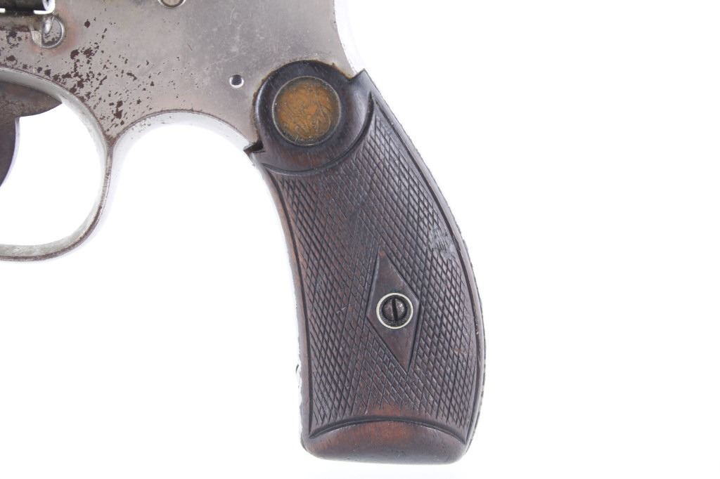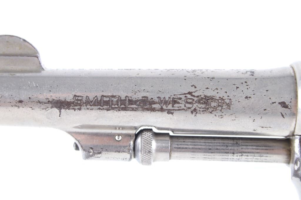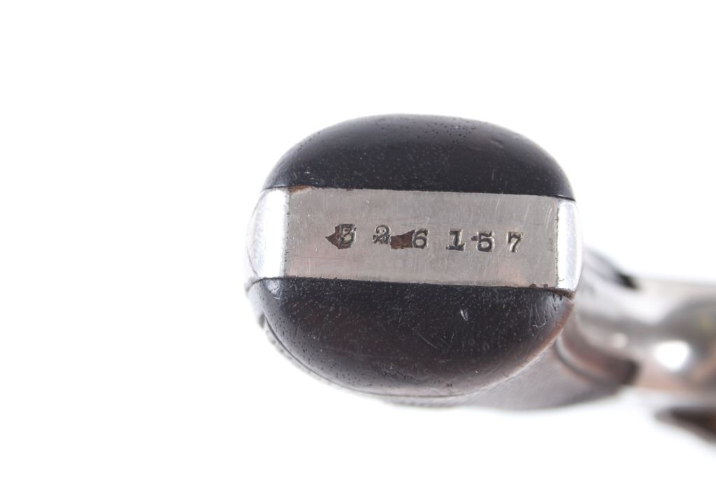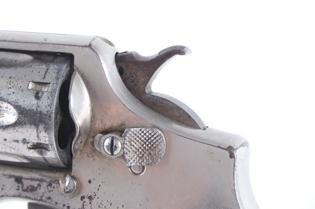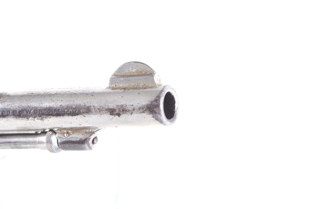 Featured in this lot we have a Smith & Wesson double action military and police revolver chambered in .38 special. This revolver was manufactured between 1915-1942 by Smith & Wesson for military or police use. The revolver displays a 4" long round barrel, six shot cylinder, checkered wood grips, double action trigger, and nickel plated finish. The barrel is marked across the left side reading "SMITH & WESSON", "SMITH & WESSON SPRINGFIELD MASS U.S.A. PATENTED OCTOBER. 8. 1901. DEC. 17. 1901. FEB. 8. 1906. SEPT. 14. 1908. DEC. 29. 1914" across the top with the right side reading ""38 S. & W. SPECIAL CTG". The wooden grips display carved checkered patterns and a brass Smith & Wesson medallion on the top of the grips. Mechanically the revolver shows a tight trigger and good timing on the cylinder. The revolver shows good condition overall with wear across the finish. The revolver weighs 1lbs 12oz. Serial Number: 326157. This firearm qualifies as a Curio & Relic firearm, and requires FFL Transfer or NICS Background Check.