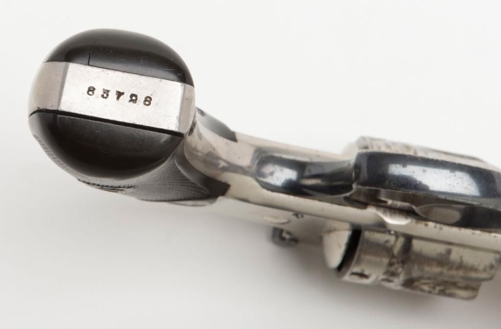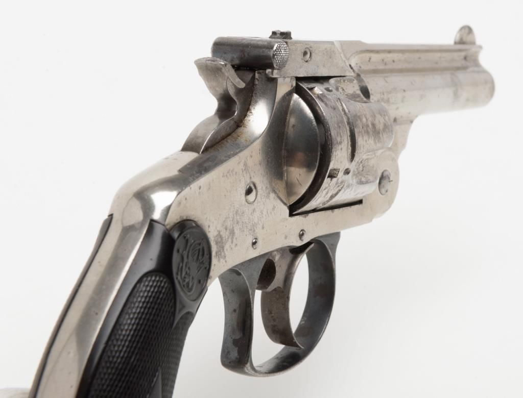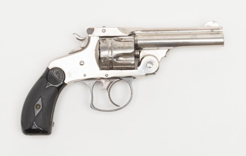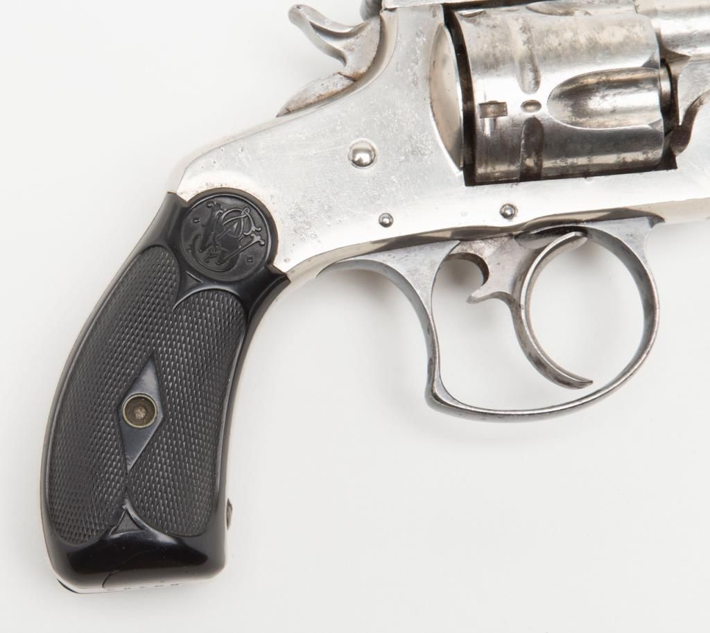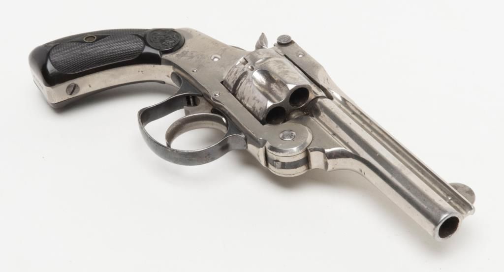 Smith & Wesson .38 top break DA revolver, .38 cal., 3-1/4” barrel, nickel finish, checkered hard rubber grips, #83728 in overall very good condition showing considerable original nickel finish, good bore, action and markings, correctright grip with crack on butt; replaced checkered left non-S&W but period grip; accompanied by later leather Brauer Bros., St. Louis holster. (Antique). Est.: $150-$300.