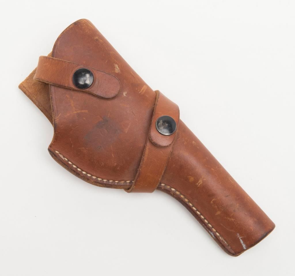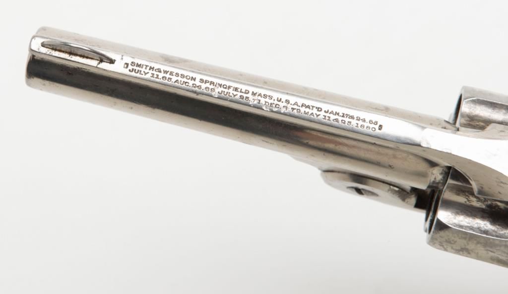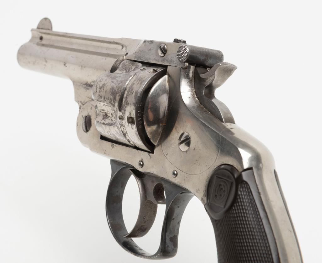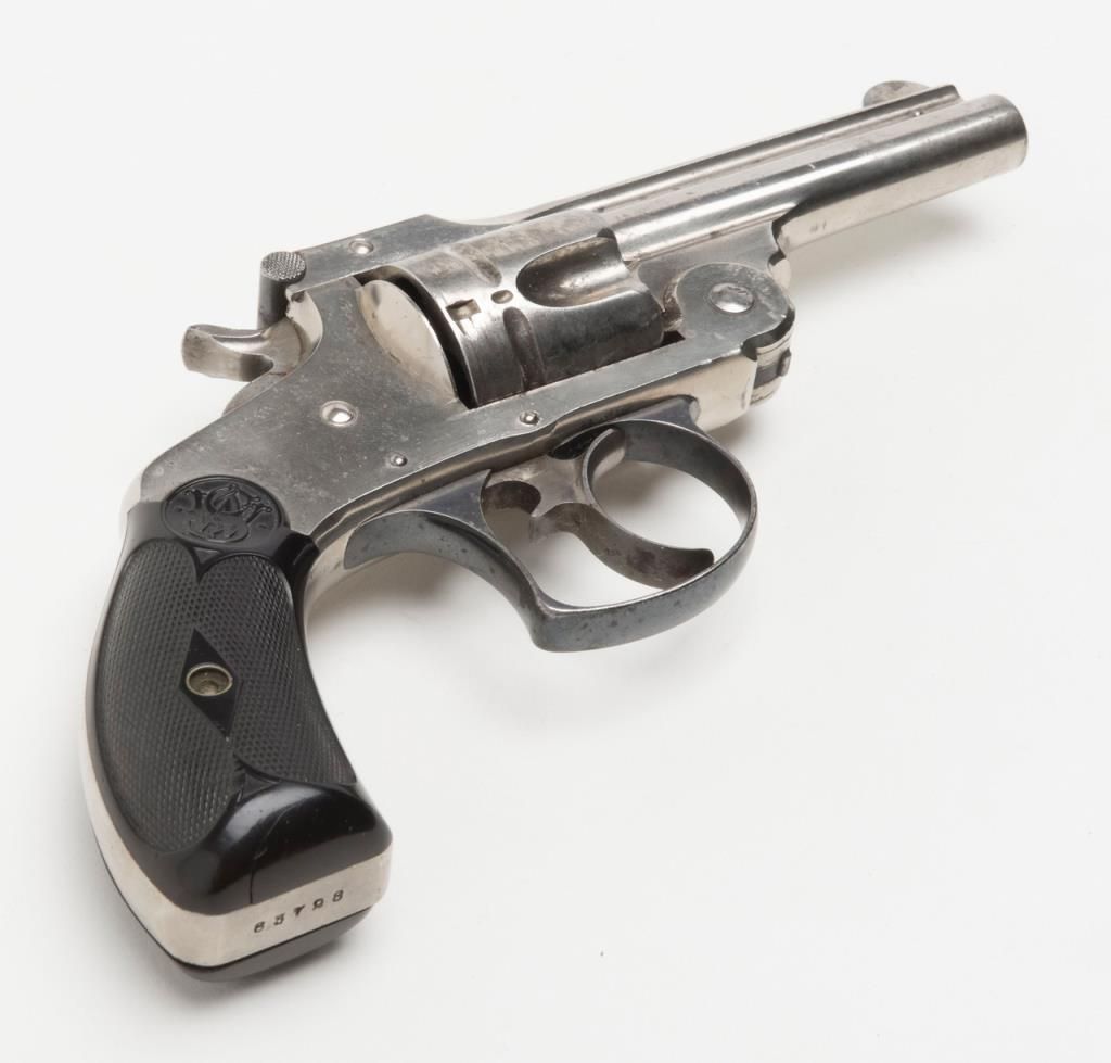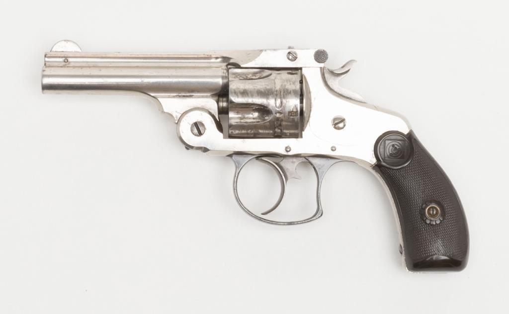 Smith & Wesson .38 top break DA revolver, .38 cal., 3-1/4” barrel, nickel finish, checkered hard rubber grips, #83728 in overall very good condition showing considerable original nickel finish, good bore, action and markings, correctright grip with crack on butt; replaced checkered left non-S&W but period grip; accompanied by later leather Brauer Bros., St. Louis holster. (Antique). Est.: $150-$300.
