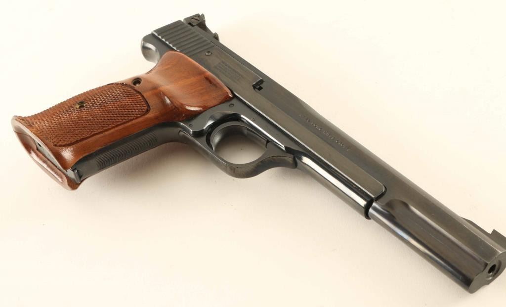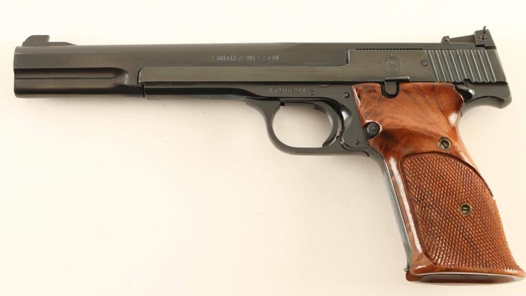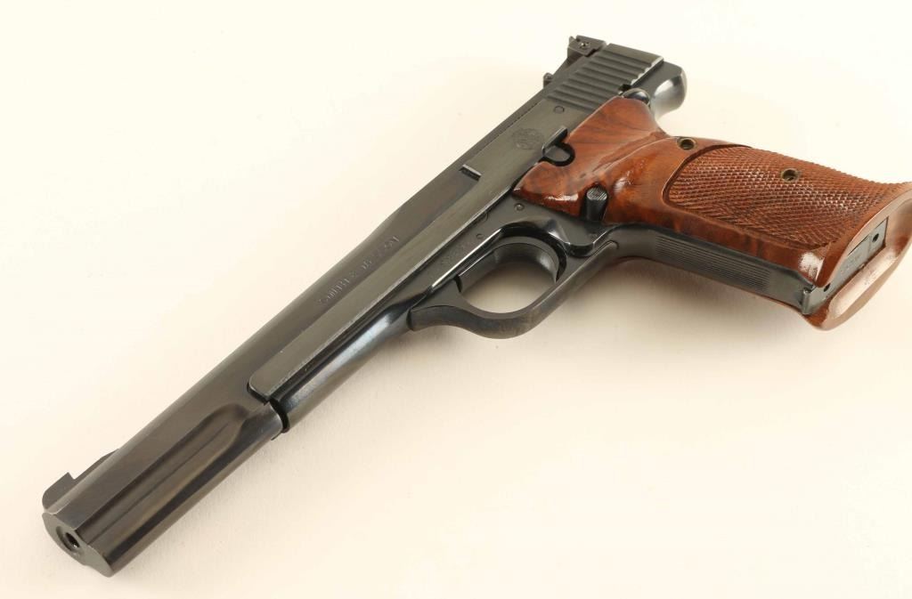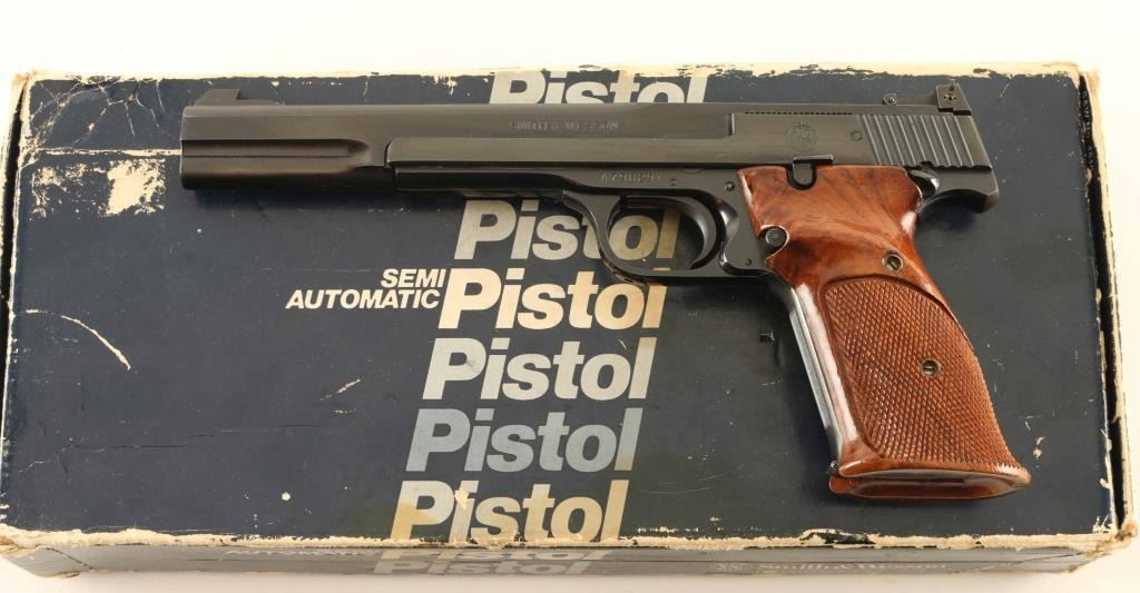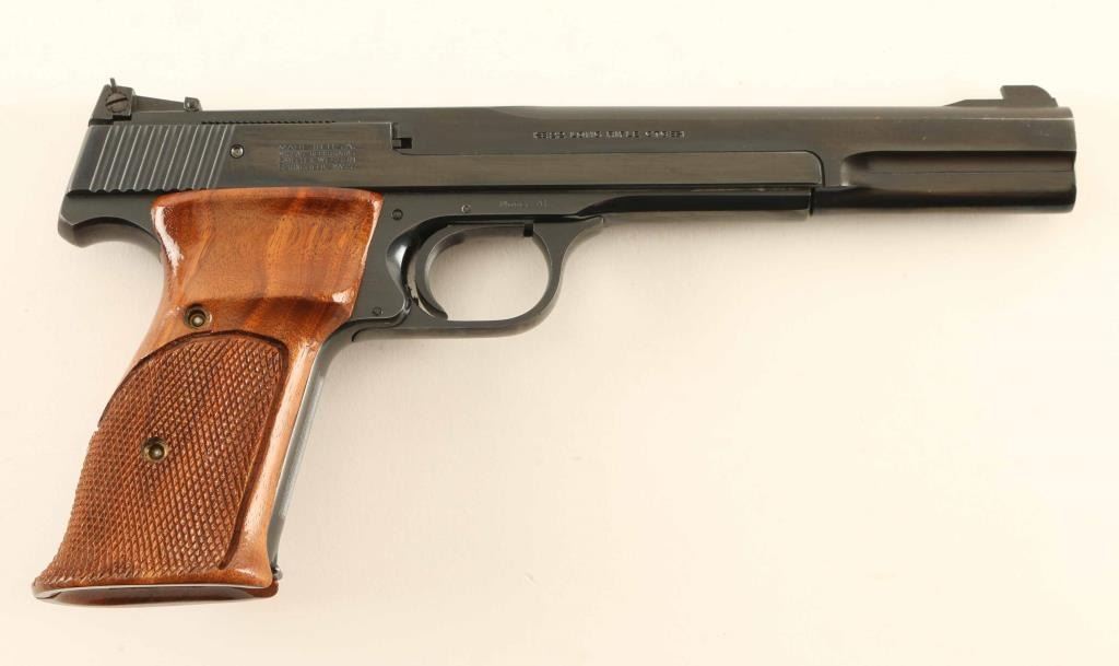 High quality single action semi-automatic target pistol chambered in .22 Long Rifle, manufactured circa 1982. Features a blued finish, 7" slab-side barrel, undercut patridge front sight, fully adjustable rear sight, .365" serrated trigger with adjustable overtravel stop, concealed hammer, manual safety on the left side of the frame, slide stop on the left side of the frame, push button magazine release, factory 10 round magazine, steel frame with serrated front strap and two-piece wrap around checkered walnut target grips. Includes the original factory cardboard box with documents. Pistol exhibits approximately 98% of it's original blued finish showing light scattered wear with a single small dot of light surface rust observed on the left side of the slide. Action is smooth, the bore appears pristine with some grease towards the muzzle and the wood grips are fine. Condition is near NRA Excellent in box. ***Modern Firearm***