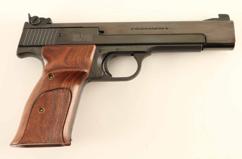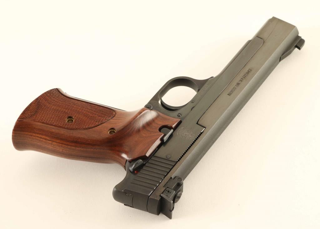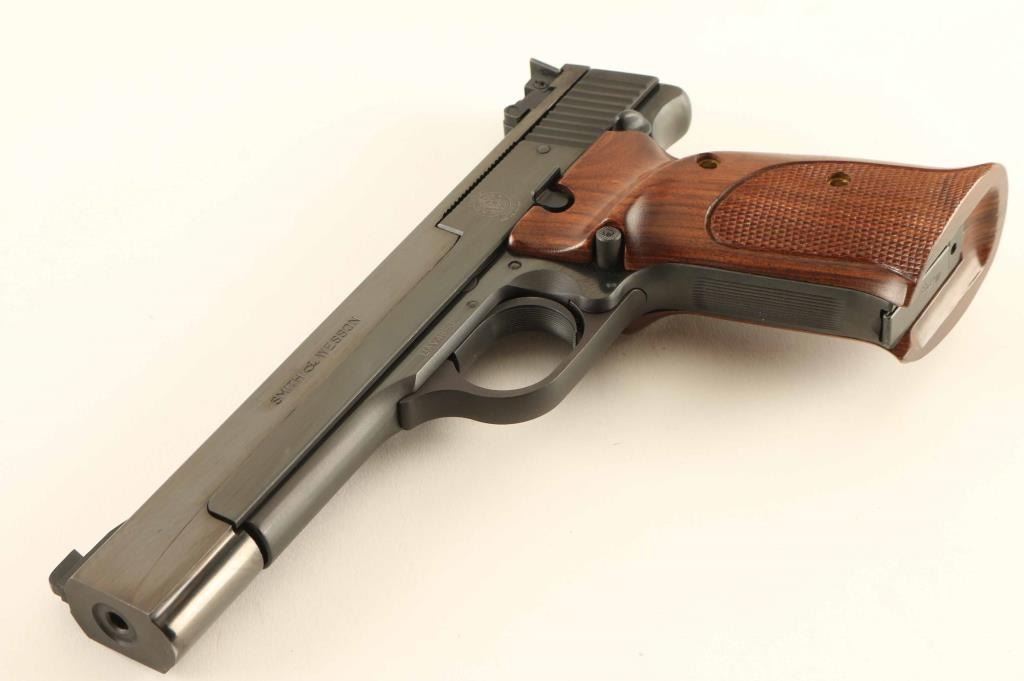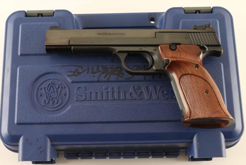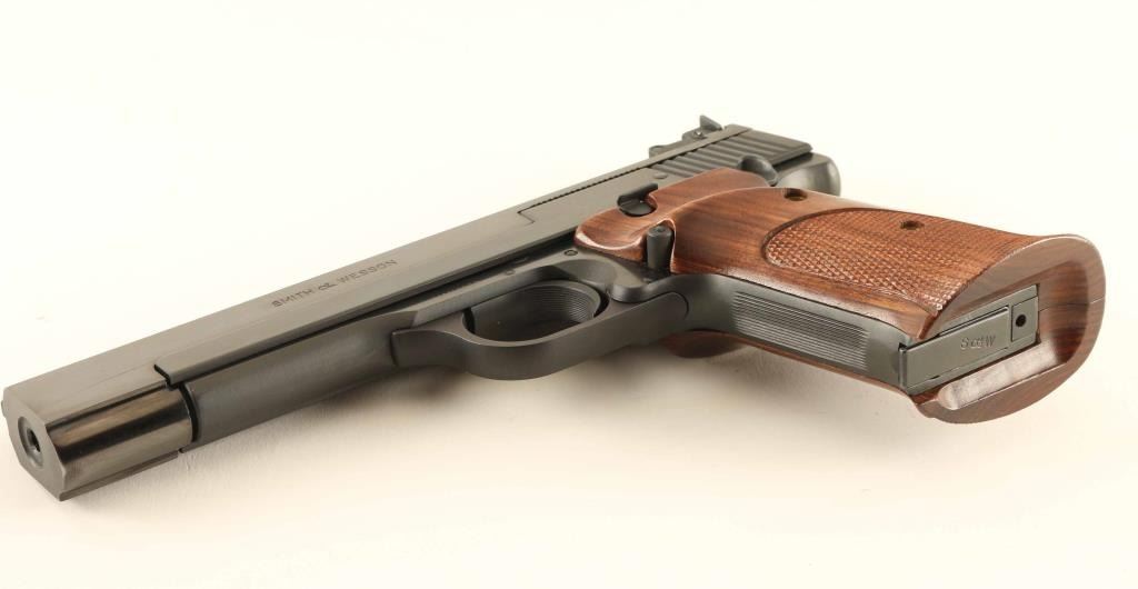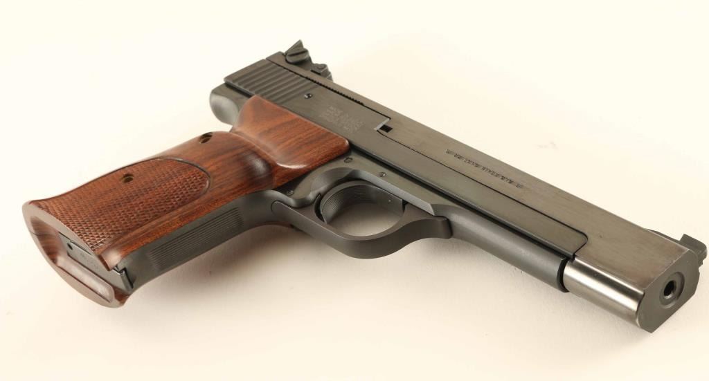 American made single action semi-automatic target pistol chambered in .22 Long Rifle. Features a matte/polished blued finish, heavy 5 1/2" slab-side barrel, ramped patridge front sight, adjustable rear sight, no cocked indicator, .365" serrated trigger with adjustable stop, push button magazine release, 10 round factory magazine, manual safety on the left side of the frame, steel frame with serrated front strap and two-piece checkered walnut wrap-around grips with thumb rests. Includes a factory hard case with documents and spare magazine. Pistol exhibits approximately 97% of it's original blued finish showing scattered light scratches. Action is smooth, the bore is excellent and wood grips are near fine with a small loss at the toe of the left panel. Condition is near NRA Excellent. ***C&R Firearm***