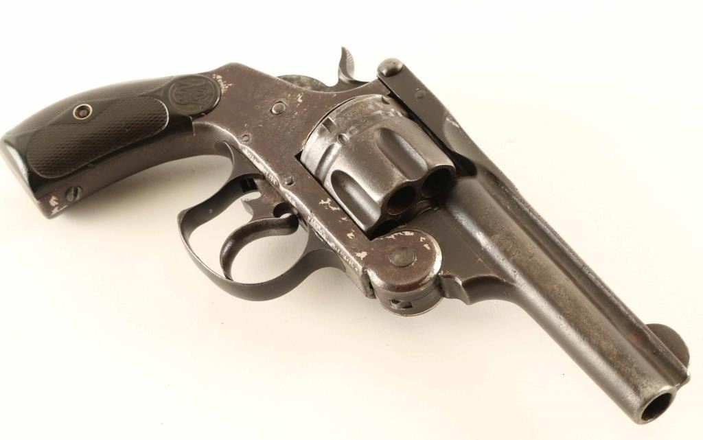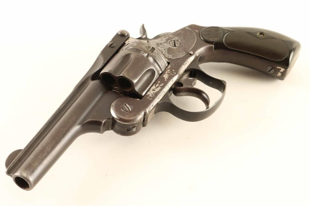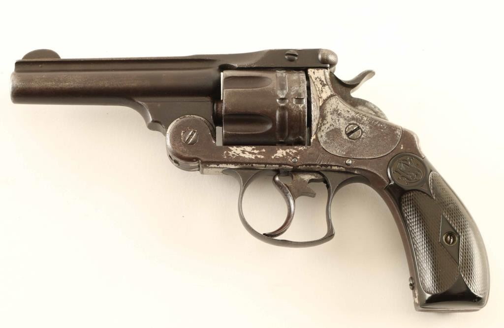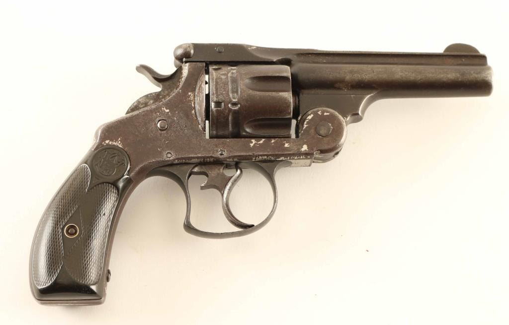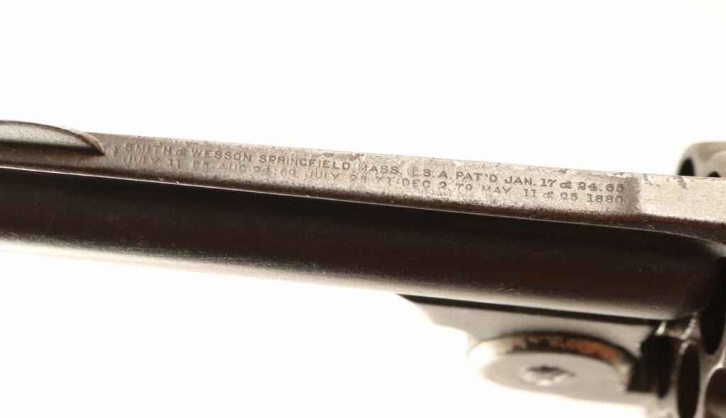 .44-40 SN: 1168 Antique double action top-break revolver chambered in .44-40 Winchester, assembled circa 1886-1913 with pre-1899 made frames. Features a nickel plated finish, ribbed 4" barrel, pinned round blade front sight, 'v' notch rear sight cut into the "T" shaped barrel latch, rounded trigger shoe, knurled hammer spur, fluted six-shot cylinder, and two-piece diamond checkered black hard rubber grips with molded S&W monograms. Serial number match on the frame, cylinder and barrel latch with no other numbers observed. Revolver exhibits nearly 10% or less of it's nickel plated finish with the majority of the metal surfaces displaying an aged dark brown patina. Action performs well though the automatic exactor doesn't function consistently, the lock-up has some play, the bore shows some scattered light pitting, markings are fair and the hard rubber grips are good as worn semi-smooth. Condition in NRA Good. ***Antique Firearm***
