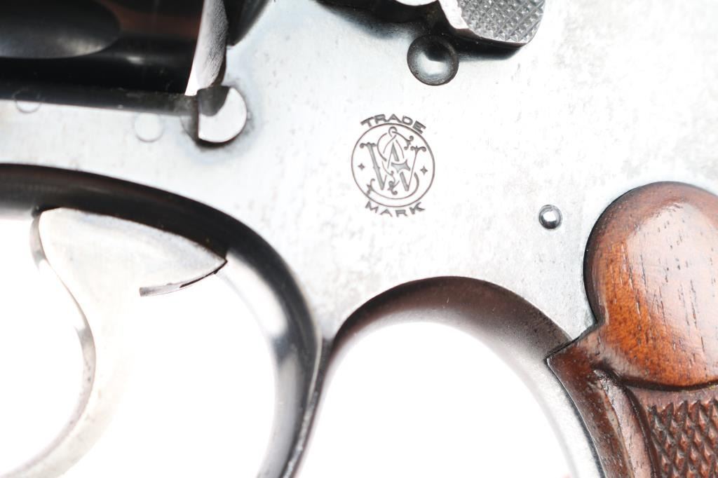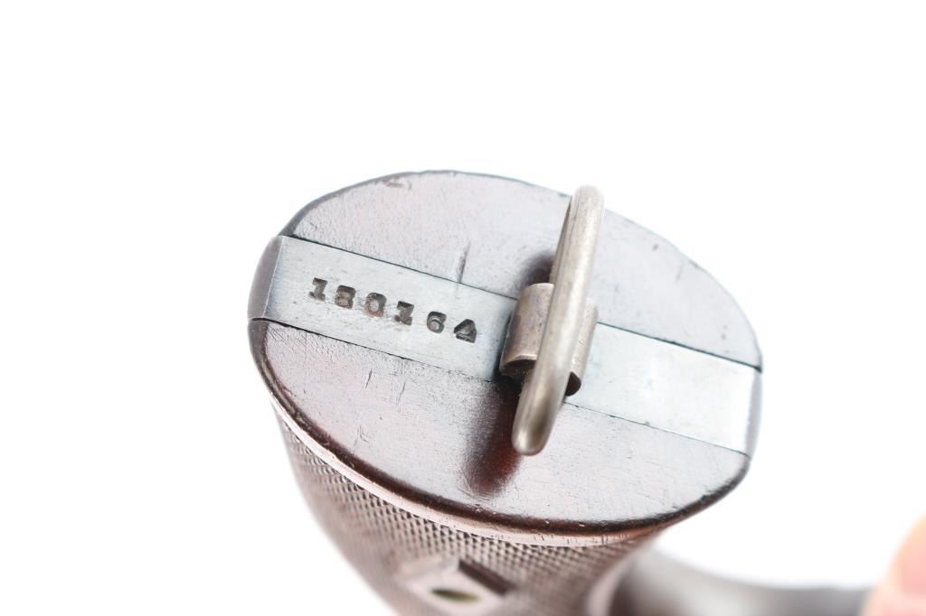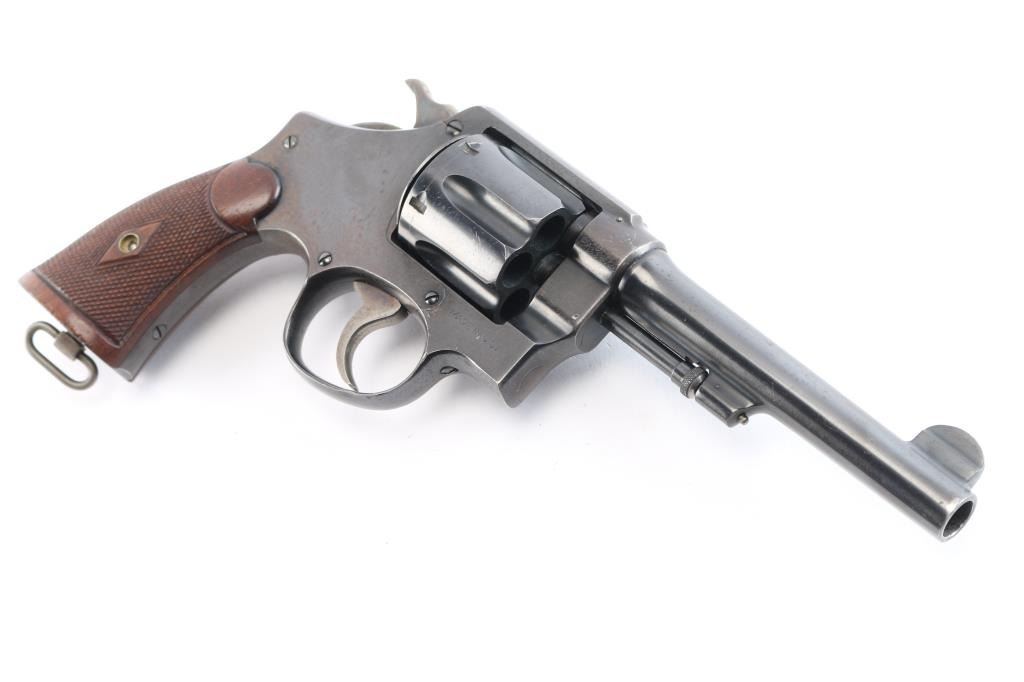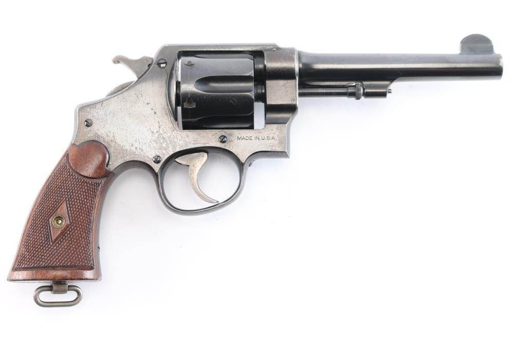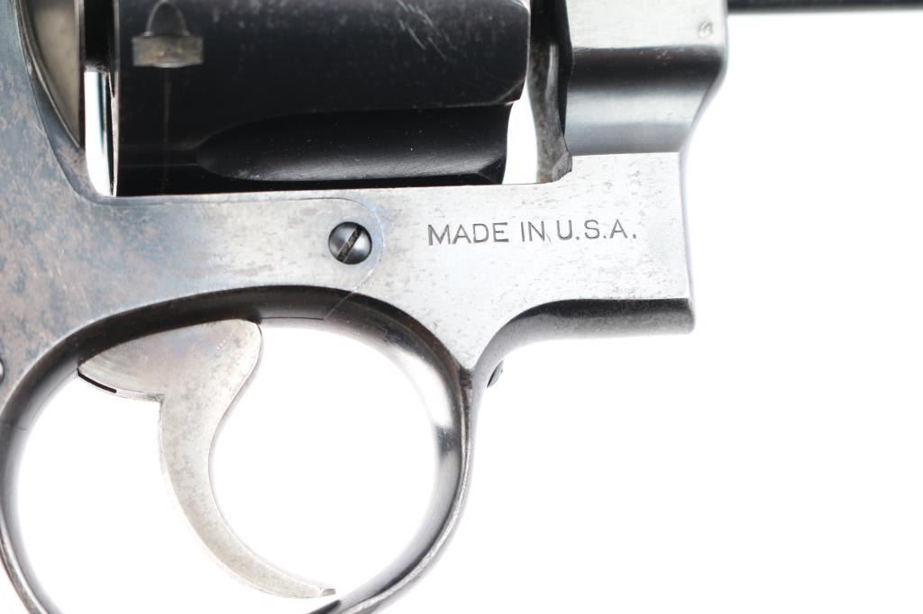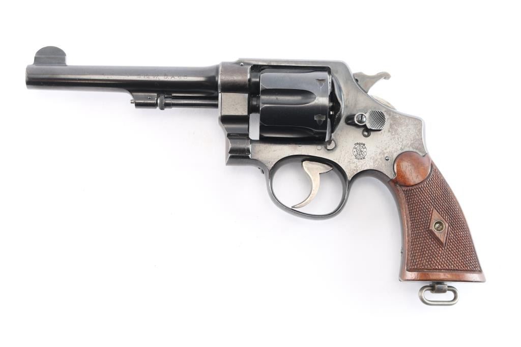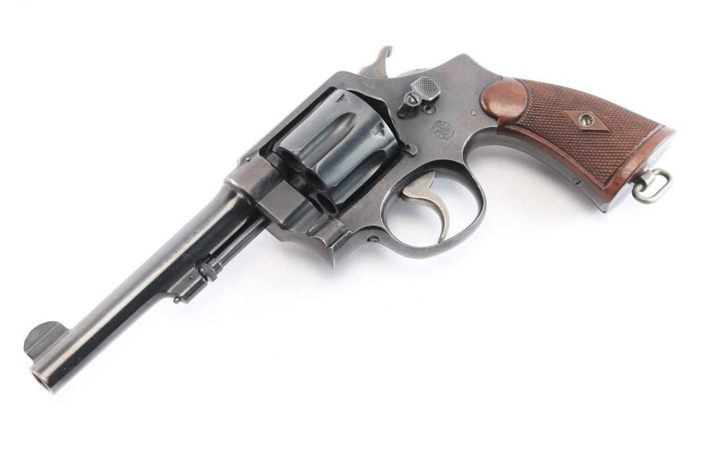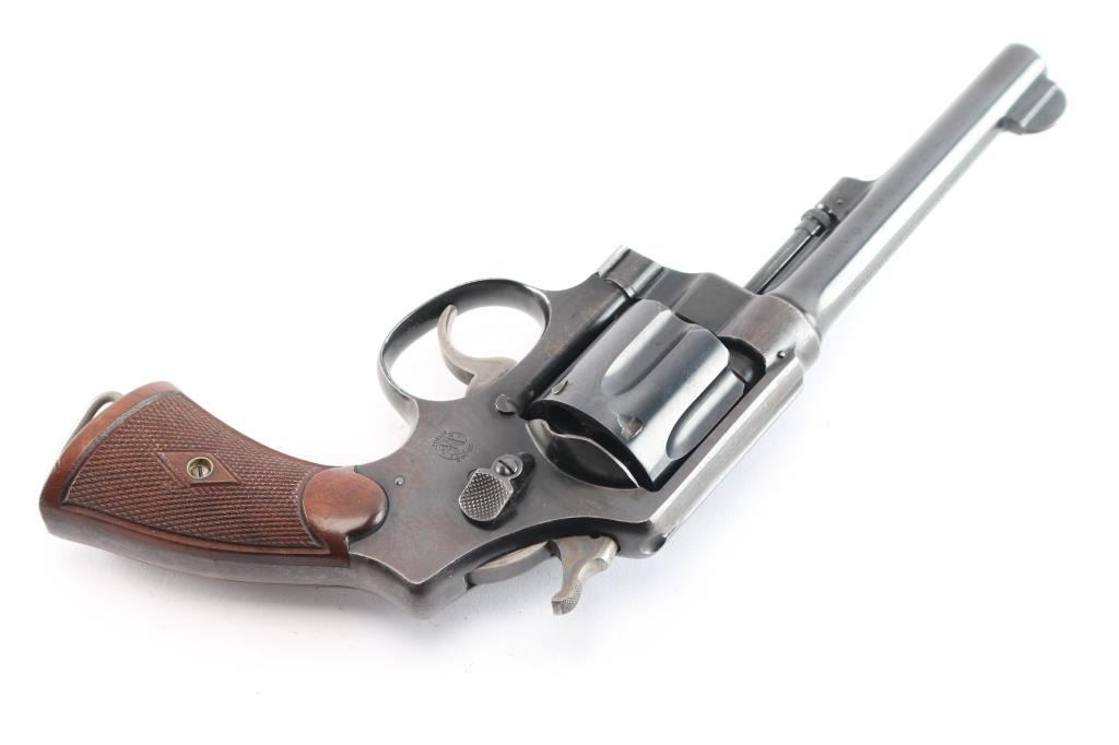 '.45 Hand Ejector,' an American made double-action revolver chambered for .45 Automatic Colt Pistol, manufactured between 1917-1946 in Springfield, MA. Approximately 163,600 of these revolvers were made for the U.S. Army. This revolver is outside of the U.S. Army's serial number range of 169959, which makes this pistol a commercial example of the .45 Hand Ejector. Revolver features a blued finish, 5-1/2" barrel, 6-shot fluted cylinder, forged round blade front sight, notched frame rear sight, non-shrouded ejector rod, knurled ejector rod head, color-case smooth curved trigger, color-case hammer with checkered spur, firing pin on hammer nose, checkered cylinder release, lanyard ring on the grip butt, and checkered diamond walnut two-piece grips. The number '180164' is stamped on the bottom of the grip butt, barrel, cylinder, and extractor star. An eagle's head with a 'S34' is a late assistant inspector proof marked on the barrel flat. Original blued finish remaining is approximately 75% with losses encompassing the frame, edge wear, scattered light scratches, and a drag line on the cylinder. Metal displays a fair amount of patina where the bluing has thinned, but there were no observed deformation. The bore is very good with strong rifling, and the cylinder chambers are also very good. The chambers and bore are dirty. Grips are in excellent condition with superficial handling marks, and the action is smooth and crisp with a good lock-up.