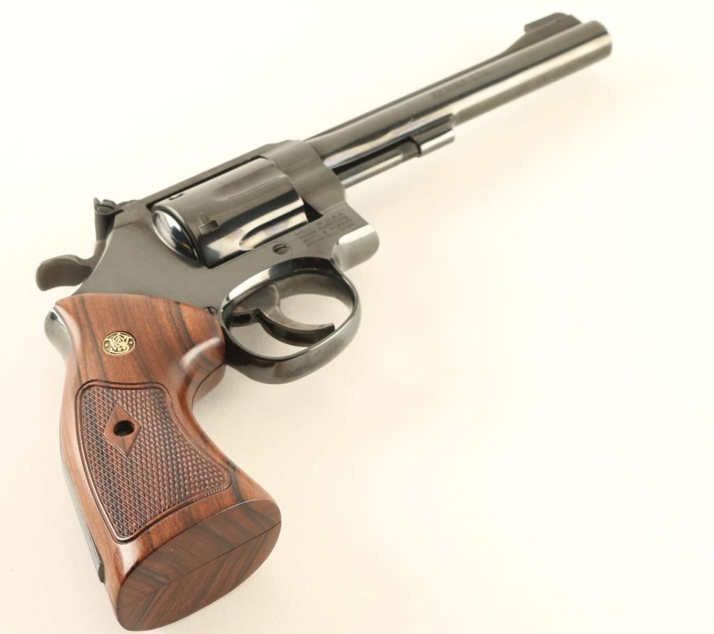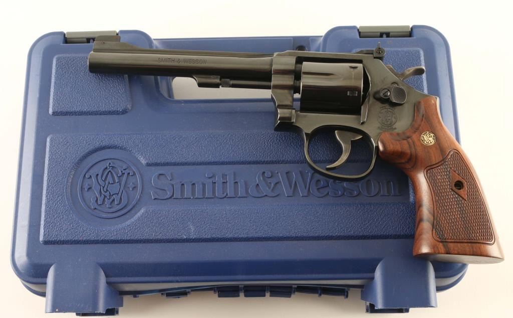 'The K-22 Masterpiece Magnum Rimfire’ Medium frame double action revolver chambered in .22 Magnum, manufactured circa 2012. Features a blued finish, 6" barrel with recessed crown & serrated sighting rib, raised patridge front sight, adjustable micrometer click rear sight, fluted six-shot cylinder with counterbored chambers, non-shrouded ejector rod, case hardened .320" smooth trigger, case hardened .500" target hammer, three screw square butt K target frame with internal key lock & ten groove grip straps, and two-piece diamond checkered walnut target grips with brass Smith & Wesson medallions. Includes the original factory hard case with documents, spent case and keys. Revolver retains approximately 99% of its original blued finish showing a thin drag line on the cylinder and minor handling marks. Action is smooth with very good lock-up, the bore is pristine, and the wood grips are fine. Condition is near NRA Perfect in case. ***Modern Firearm***