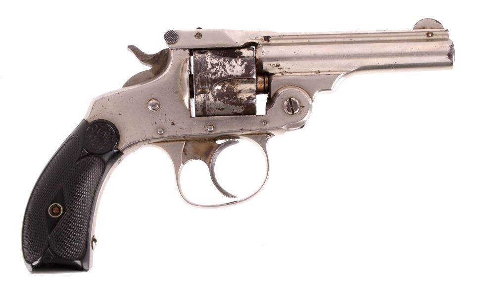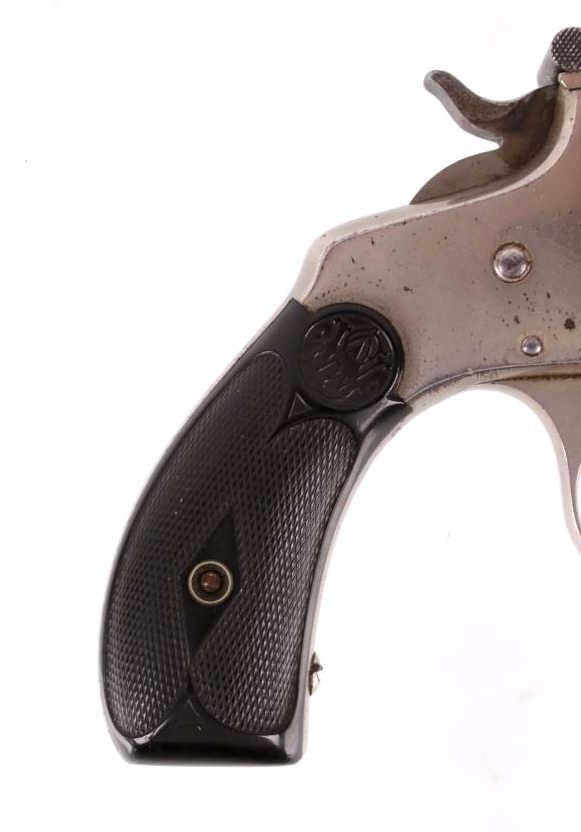 Offered for sale in this lot is a fine Smith & Wesson 4th Model, Double-Action, Top-Break revolver, chambered for .32 S&W Short. The revolver shows a serial number 90193, and attributes it to an early 4th Model. The revolver utilizes a 3" round barrel with full top rib, 5-shot cylinder, hard rubber "S&W" monogram grips, top break operation, and a fine double action trigger. The revolver is marked in numerous places, reading; "SMITH & WESSON SPRINGFIELD MASS. U.S.A. PAT'D JAN.24.65 - JULY 11.65. AUG. 24.69. REUISSUE JULY 25.71.MAY 11.80.JAN.3.82" on the top of the barrel rib, and showing matching serial numbers on the butt of the grips, on the back of the cylinder, and on the bottom of the top break latch. Overall, the revolver shows very good condition, with some wear to the cylinder and the backstrap. The nickel finished is in good condition on the frame and barrel while the cylinder has developed patina. Mechanically the revolver has a good double-action, with good cylinder timing. As well, the revolver has a tight cylinder lock-up. The hammer will not hold at full cock. Serial Number: 90193. This firearm qualifies as an Antique, and does not require FFL Transfer or NICS Background Check.