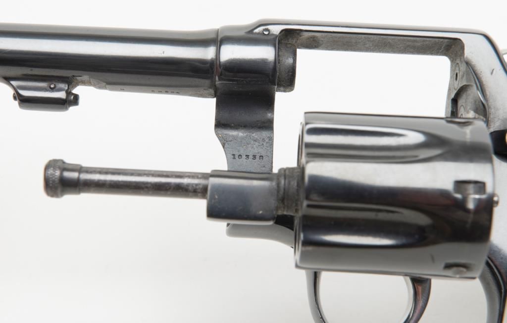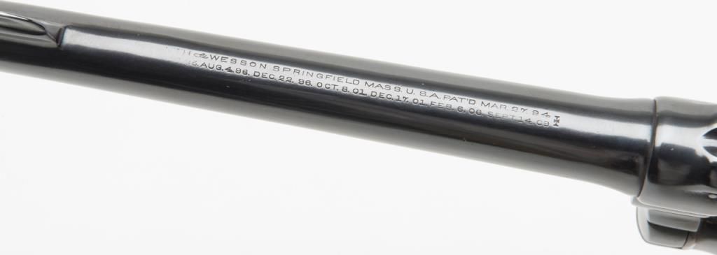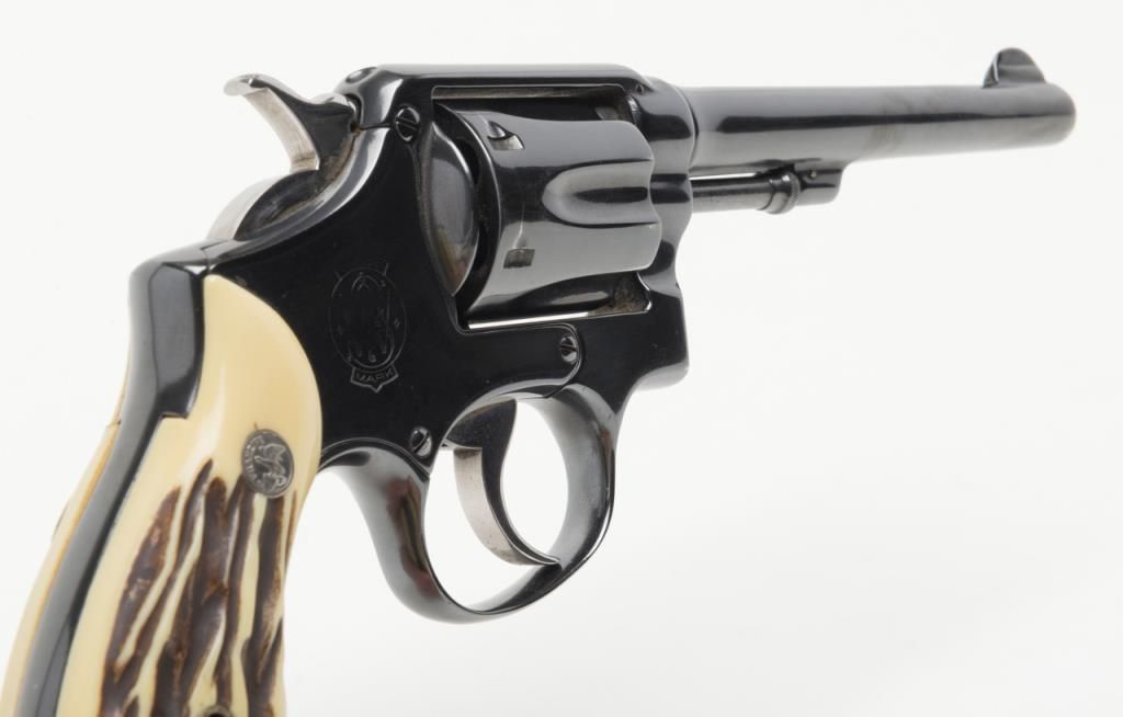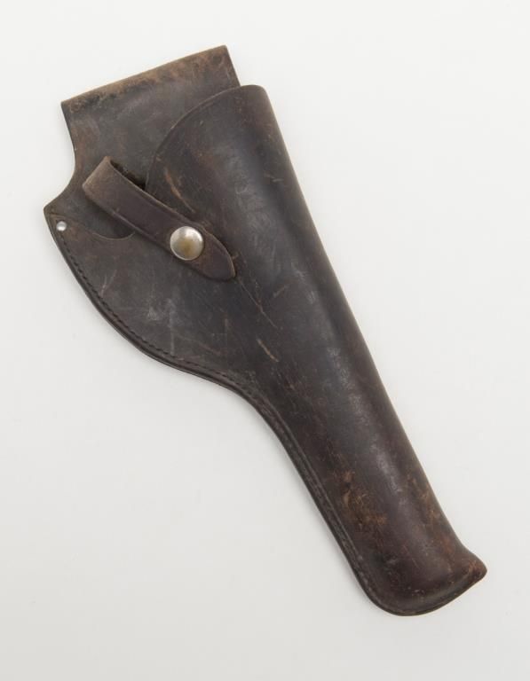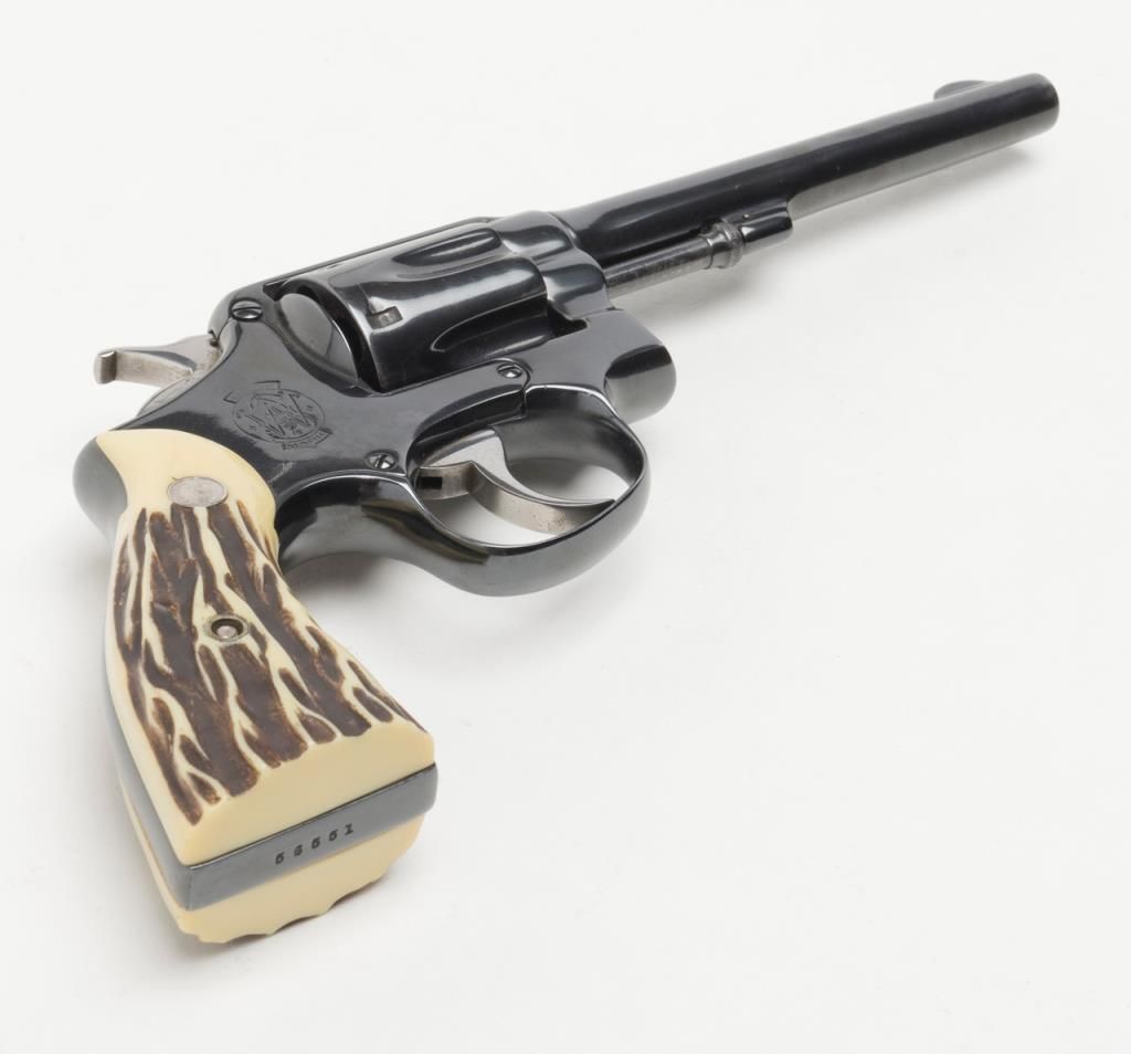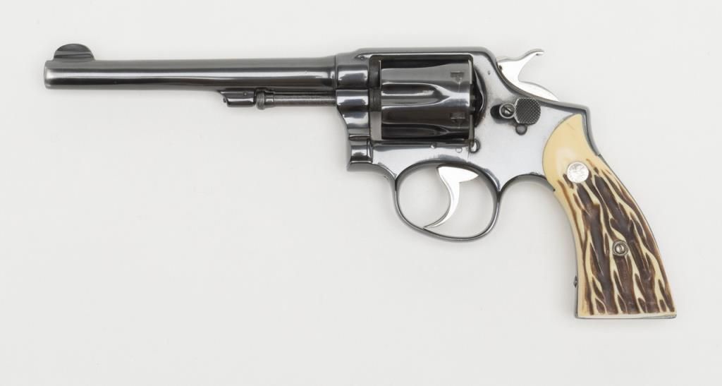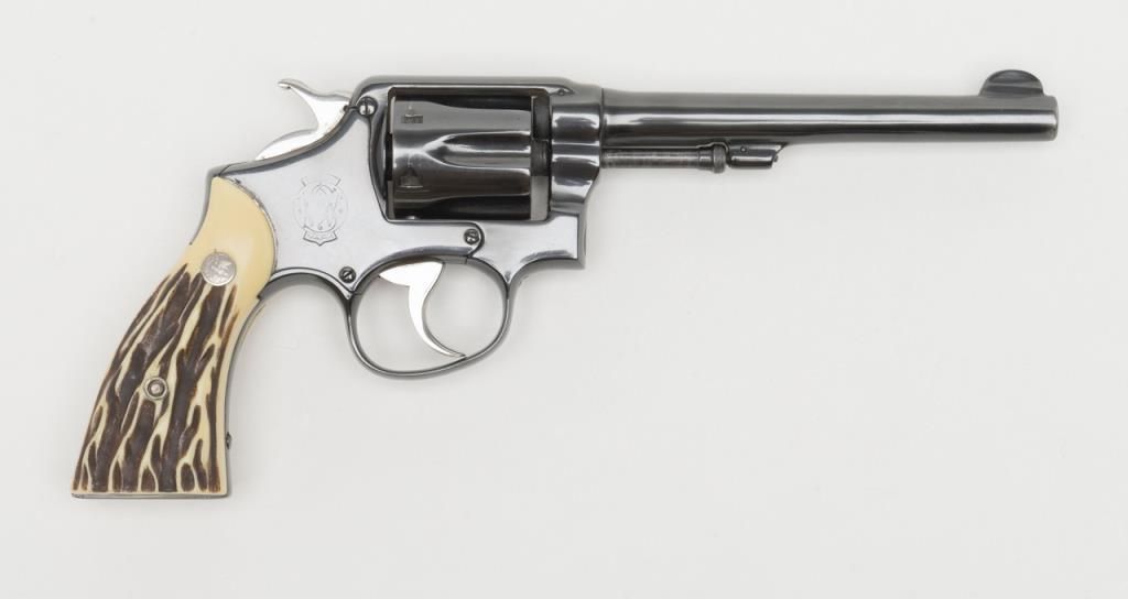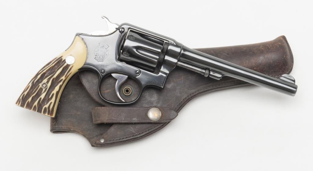 Smith & Wesson 5-Screw DA hand Ejector revolver, .32 Win. cal., 6” barrel, heavily re-finished, Franzite faux stag grips, #56551 in overall good condition showing the majority of its re-blue, good action, fair bore, markings are light and the caliber markings on the left side of the barrel are mostly gone from the polishing process during the re-finish; accompanied by an old leather holster. (C&R). Est.: $150-$300.