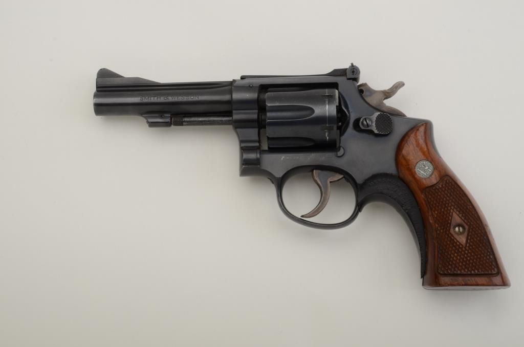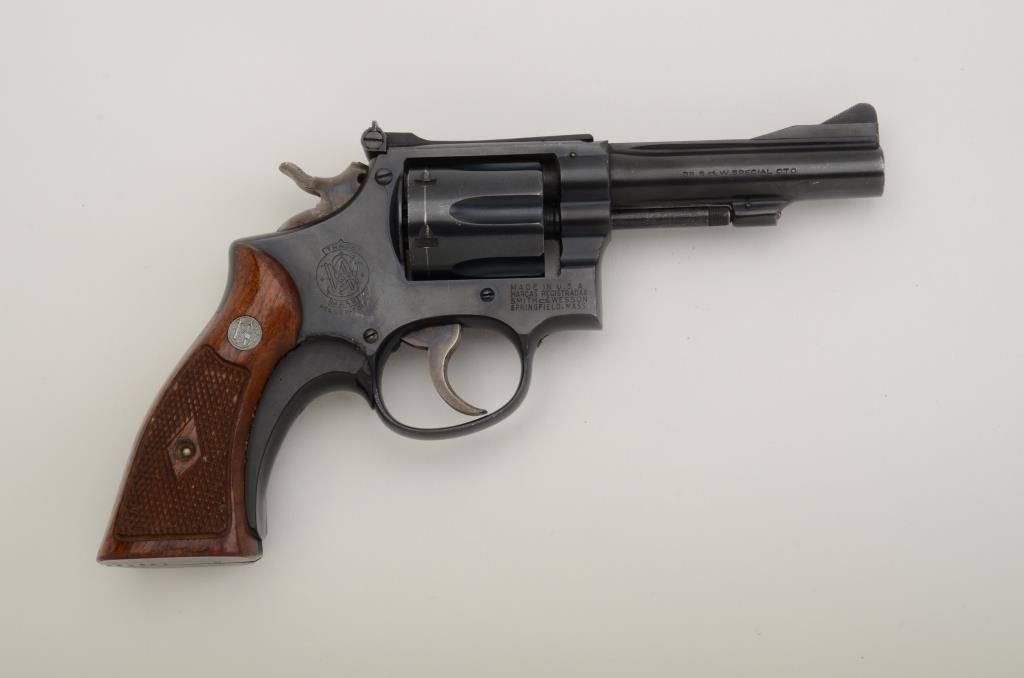 Smith & Wesson 5-screw DA hand ejector revolver, .38 Special cal., 4” barrel, blue finish, checkered wood medallion grips, #K139986 with add-on grip shoe. This gun is in overall fine condition showing themajority of its original finish, fine bore, action, markings and grips. From an old estate. Est.: $250-$350.