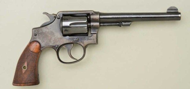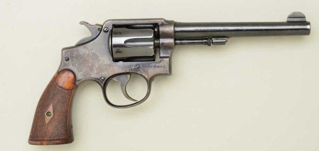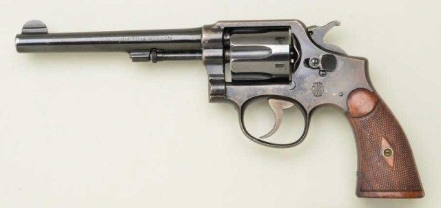 Smith & Wesson 5-screw M & P hand ejector DA revolver, .38 Special cal., 6” barrel, blue finish, checkered wood grips, #417357. This gun is in overall very good to fine condition showing approx. 70% original finish withmajority of loss just flaked and turned to a plum brown patina, fine bore, crisp action and markings, fine grips; accompanied with a copy of a Wells Fargo Bank Bill of Sale dated May 24, 1966, identifying this gun by serial number as having been sold by the Bank to Ellingson’s Sport Center. Est.: $450-$900.