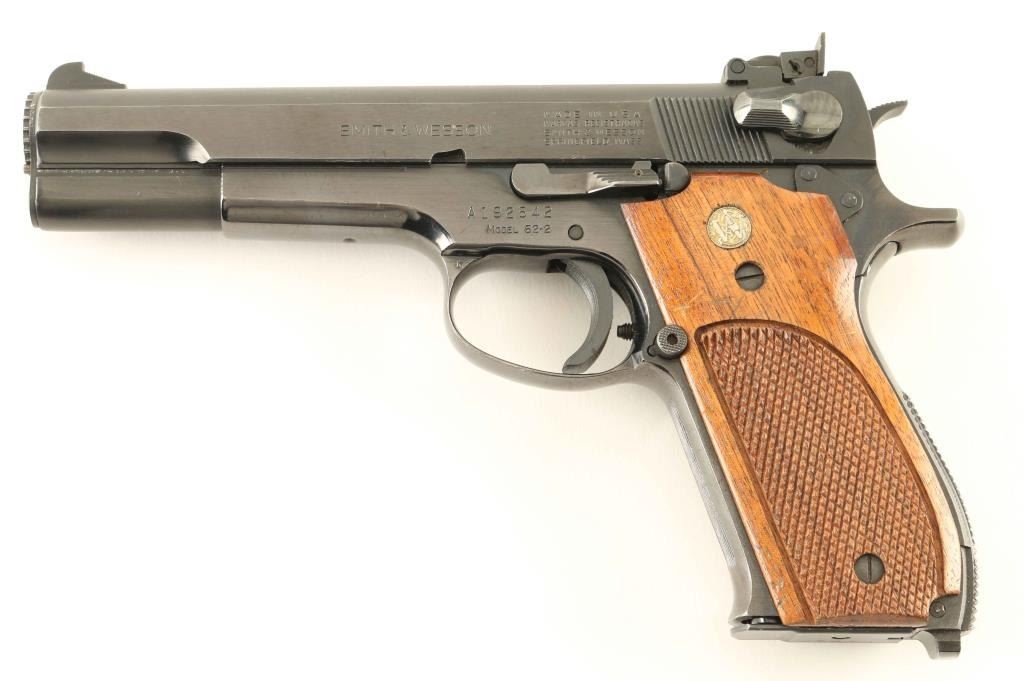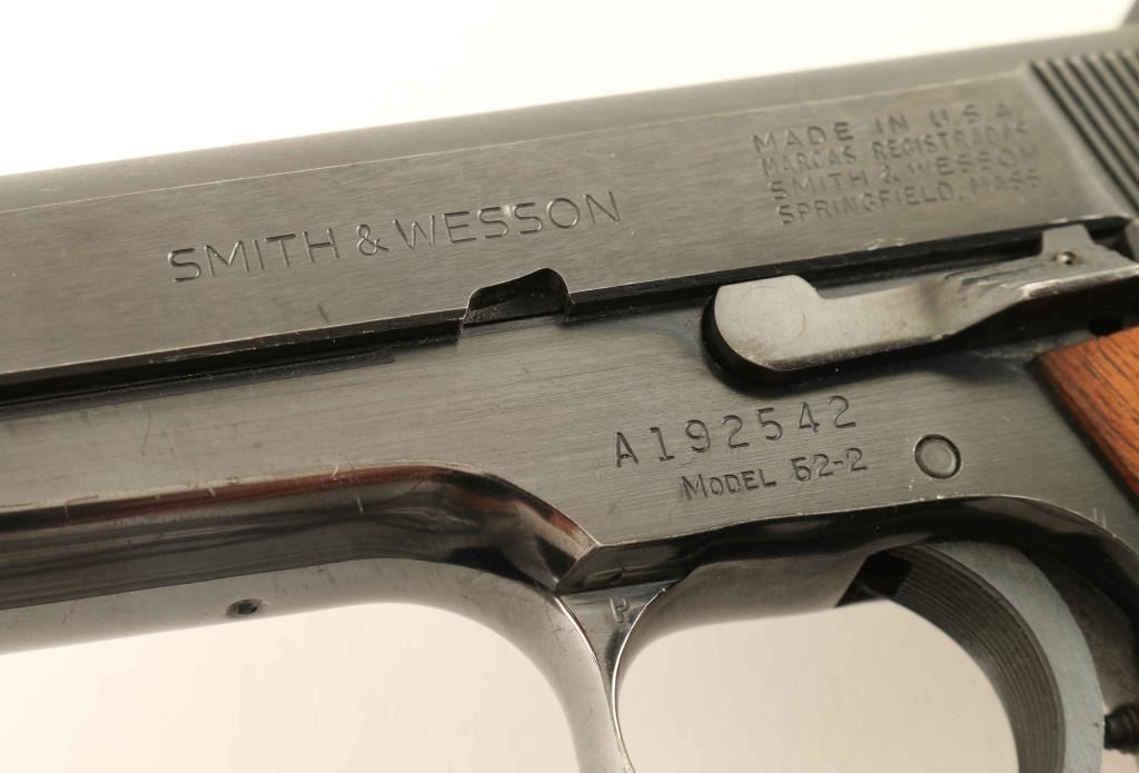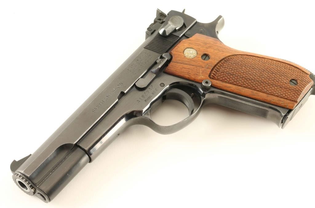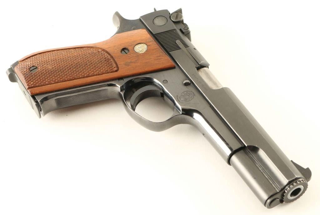 'The .38 Master Single-Action' Vintage full size single action semi-automatic pistol chambered in .38 Special Mid-Range, manufactured circa 1971-1993. Features a bright blued finish, 5" barrel, full-length steel guide rod, 1/8" patridge front sight, dovetailed adjustable rear sight, .365" serrated trigger with adjustable stop, .260" hammer with serrated spur, thumb safety on the left side of the slide, magazine disconnect safety, push button magazine release, factory 5 round magazine, steel frame with serrated front strap, knurled mainspring housing with lanyard loop, and two-piece checkered walnut grips with silver S&W medallions. Pistol exhibits approximately 95% of it's original finish showing light edge wear and scattered handling marks/scratches. Action is very smooth, the bore is pristine & wood grips are very good. Condition is NRA Very Good+++. ***Modern Firearm***