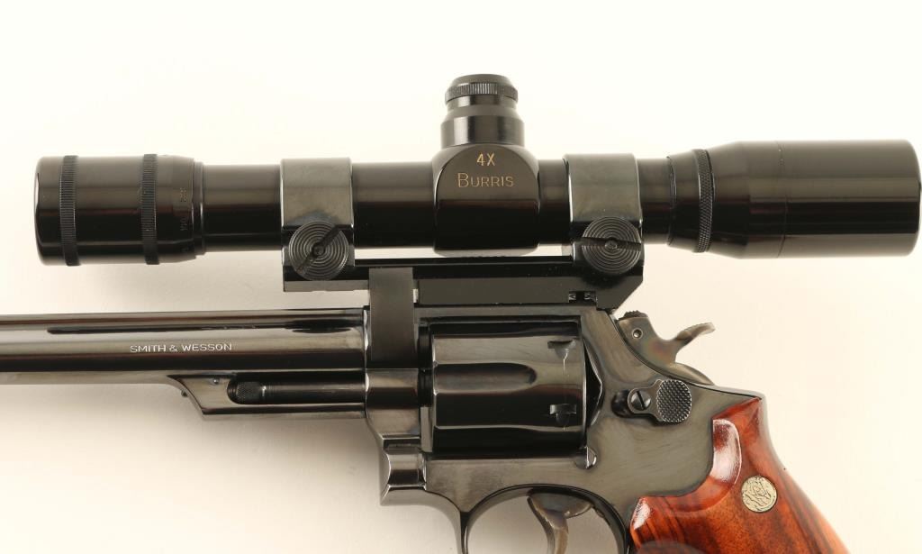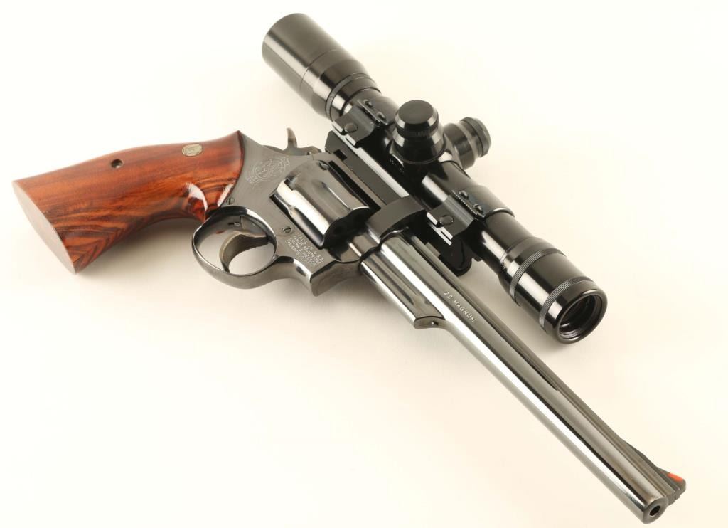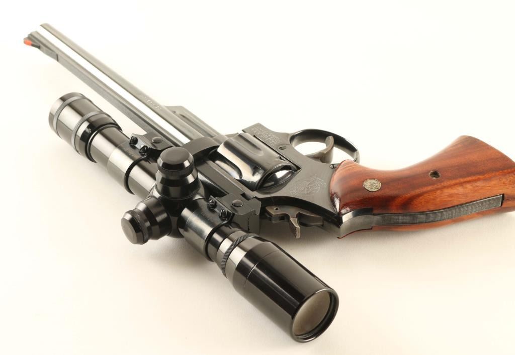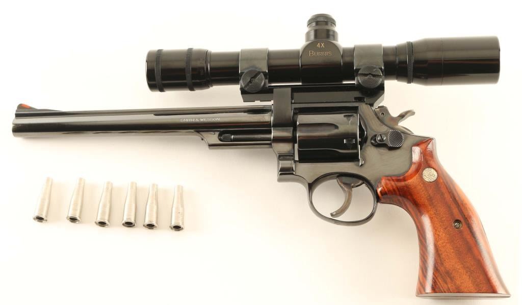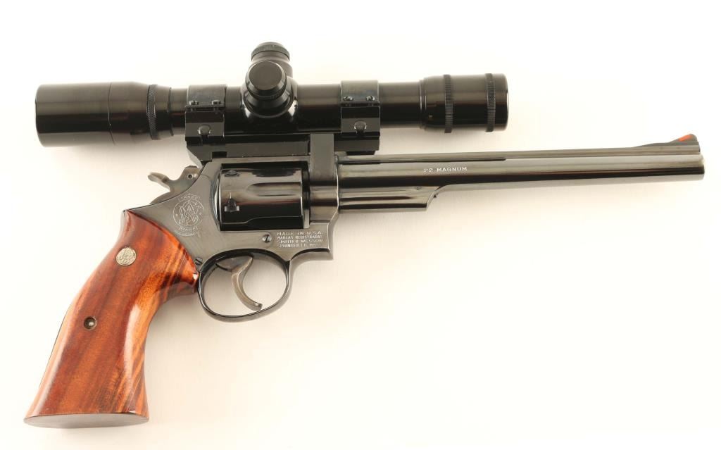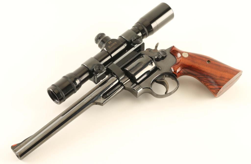 'The .22 Centerfire Magnum' Scarce medium frame double action revolver chambered in .22 Remington Jet, manufactured circa 1972. The model 53 emerged with the popularity of the similar .224 Harvey Kay-Chuk wildcat cartridge, but suffered dismal commercial success due to issues with the Jet cartridge. Features a blued finish, pinned 8 3/8" barrel with serrated sighting rib, raised serrated ramp front sight with red insert, removed rear sight with installed Weaver 307 scope mount fitted with a Burris 4x E.E.R. scope, fluted six-shot cylinder with counterbored chambers, shrouded ejector rod, case hardened .500" serrated target trigger, case hardened .375" semi-target hammer with built in center fire/ rim fire selector switch, three screw square butt K target frame with ten groove grip straps, and smooth two-piece cocobolo target grips with silver Smith & Wesson medallions. Includes six factory .22 Long Rifle steel chamber inserts. Revolver retains approximately 95% of its original blued finish showing edge wear, a drag line on the cylinder and some light scattered rust in the serrations on the backstrap. Action is crisp with very good lock-up, the bore is pristine, and the wood grips are fine. Condition is near NRA Very Good++. ***Modern Firearm***