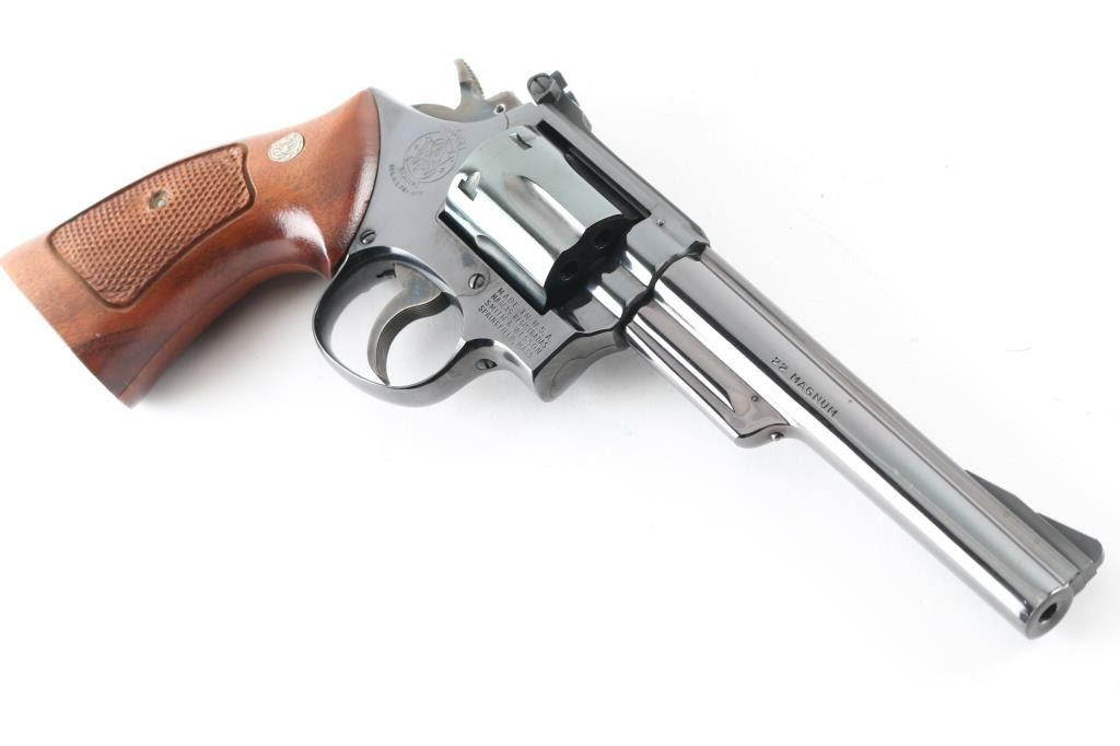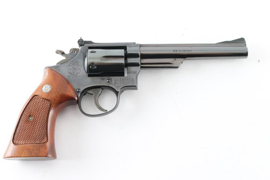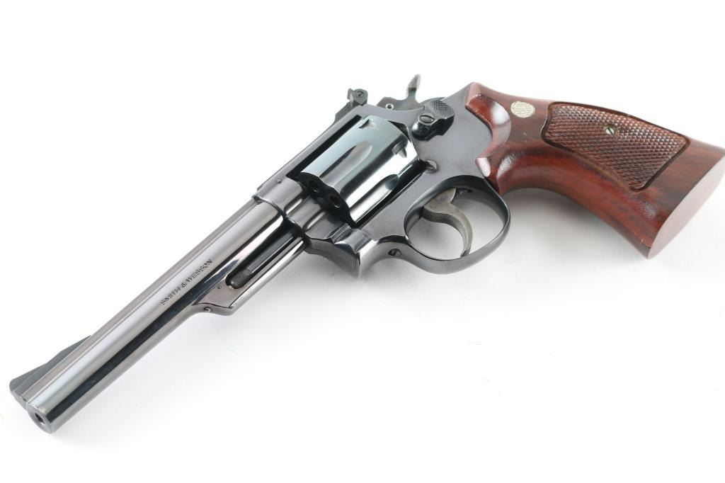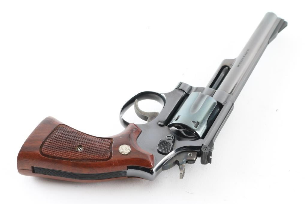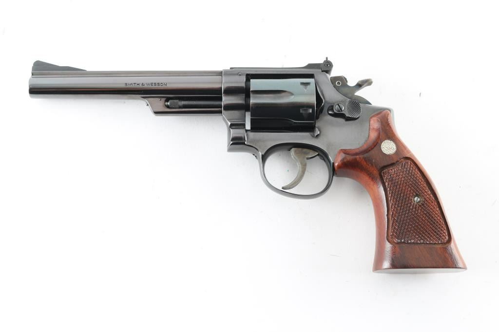 Double action revolver manufactured circa 1961. Features blued finish, checkered wood target type grips with S&W medallions, 6" pinned barrel, K frame 4-screw square butt target frame with trigger stop adjustment, adjustable sights, case colored grooved narrow trigger, case colored checkered medium width spur hammer. Hammer has switch to select which frame mounted firing pin is struck, to switch between centerfire and rimfire. Bore and charge holes are very good condition. Retains 95% blue with handling marks & edge losses, thin drag line, several scuffs to right side of barrel. Grips are excellent condition. Includes set of (6) auxiliary chambers for cylinder charge holes to allow chambering of 22 short, long, or Long Rifle cartridges (Selector in hammer must be set to correct position, and inserts have a proper orientation). Condition is NRA Excellent *** Modern Firearm ***