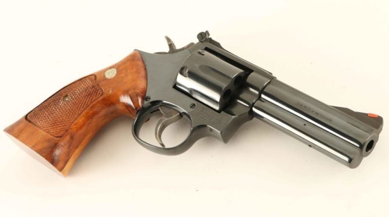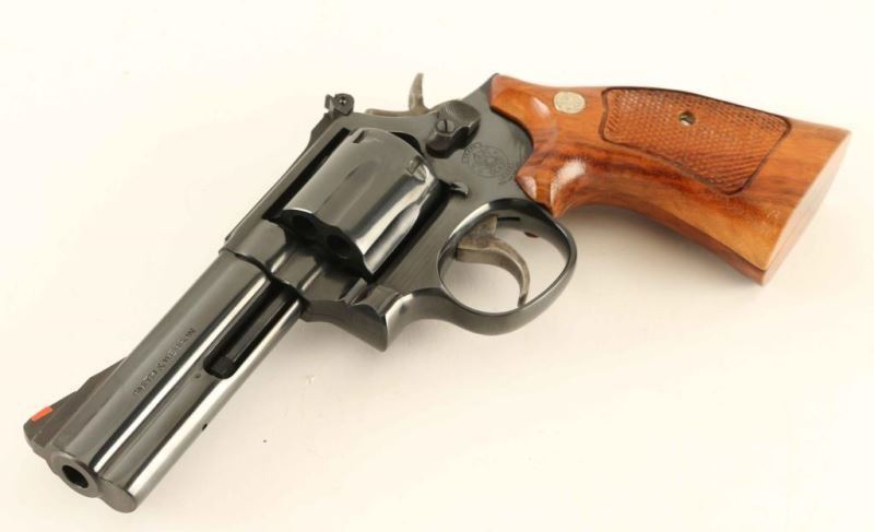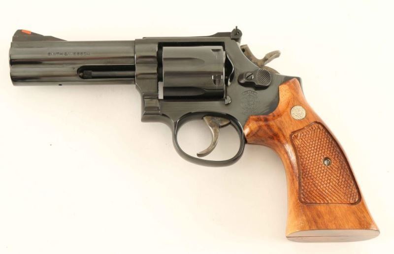 Distinguished Combat Magnum' Medium frame double-action revolver chambered in .357 Magnum, circa 1981-1986. Features a blued finish, 4" ribbed barrel with full underlug, raised ramp front sight with orange insert, adjustable micrometer click rear sight, fluted six-shot cylinder, .312" smooth trigger, .375" semi-target hammer, square butt L target frame and two-piece checkered walnut target grips with silver S& W medallions. Includes the original factory cardboard box with documents. Revolver exhibits approximately 96% of it's original blued finish with a light drag line on the cylinder and a few spots of scattered rust. Action is smooth with solid lock-up, bore is pristine and wood grips are very good.
