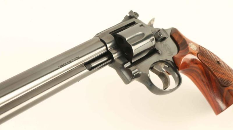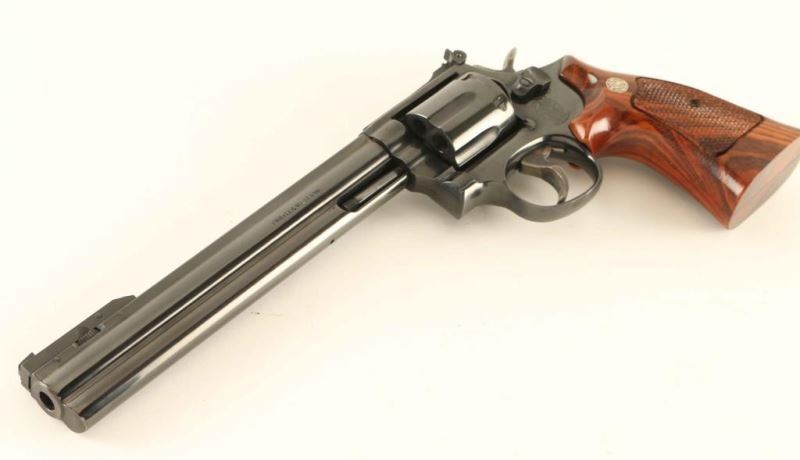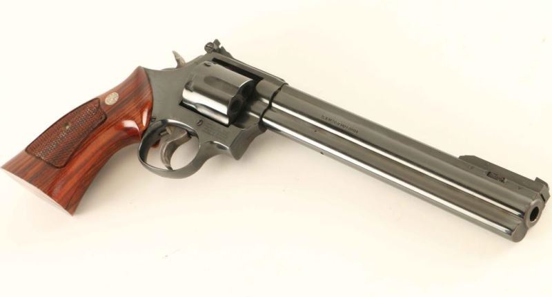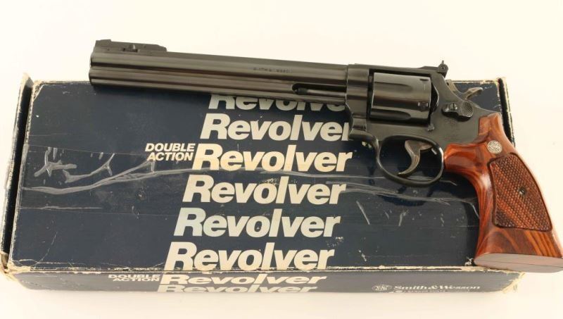 'Distinguished Combat Magnum' Medium frame double-action revolver chambered in .357 Magnum, manufactured circa 1983. Features a blued finish, ribbed 8 3/8" barrel with full underlug, adjustable four-position front sight, adjustable micrometer click rear sight, fluted six-shot cylinder, serrated .400" trigger, .375" semi-target hammer, three screw square butt L target frame and two-piece checkered Goncalo Alves target grips with silver S&W medallions. Includes a factory one-piece blue cardboard box with documents. Revolver exhibits approximately 98%+ of it's original blued finish with a light drag line on the cylinder and minor muzzle wear. Action is smooth with very good lock-up, the bore is pristine and wood grips are extra fine. Condition is NRA Excellent in box. ***Modern Firearm***