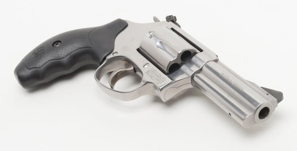 Smith & Wesson 60-15 double action revolver in .357 caliber with a 3" barrel, stainless steel finish, rubber grips, adjustable rear sight, rubber grips, serial number CTV6090. This revolver remains in excellent used condition showing aindex line on the cylinder and little use. In Original box. Est.: $250-$450