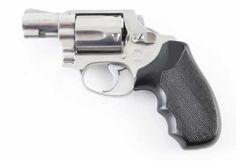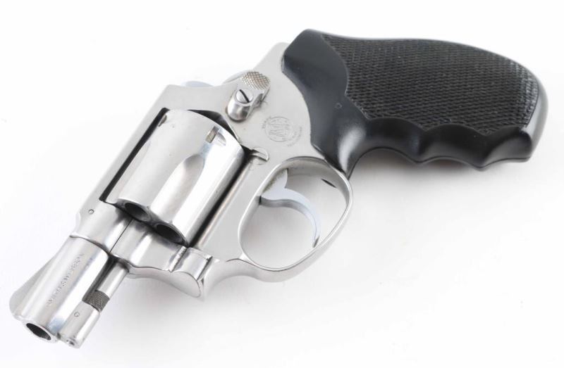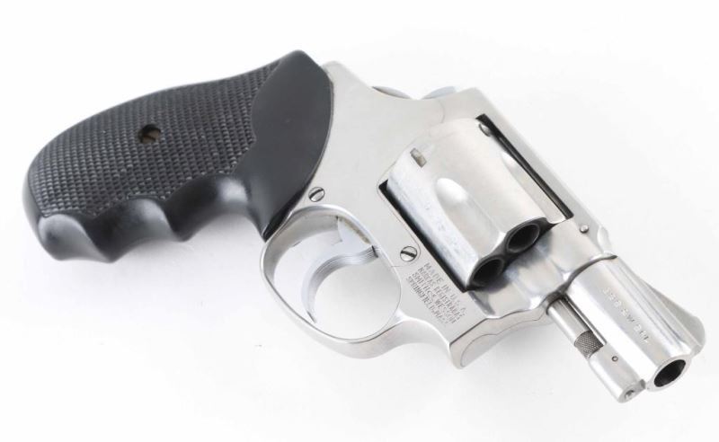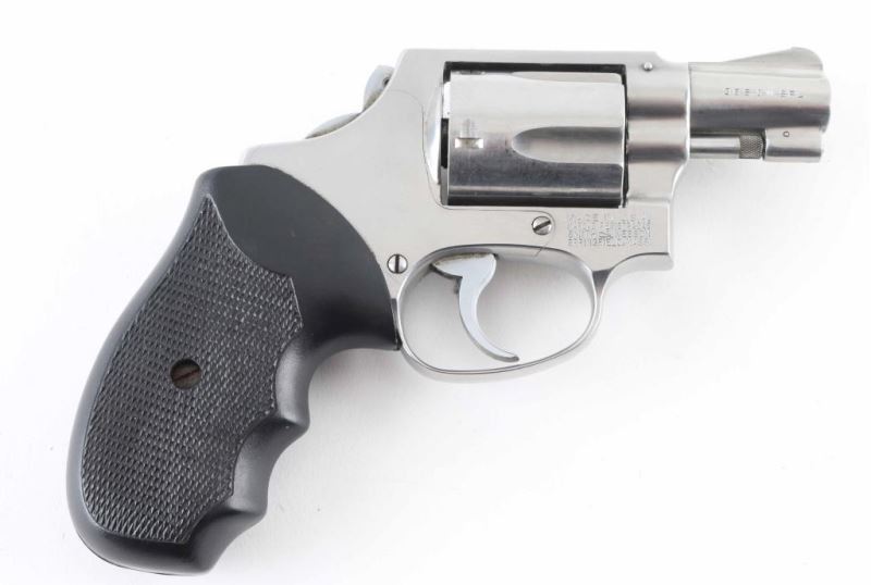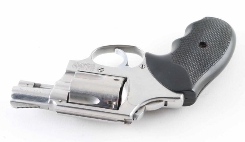 Older all machined construction. Small frame double action snub nose revolver. Features stainless steel construction, 1-7/8" barrel with serrated ramp front sight, square notched rear sight, non-shrouded ejector rod, fluted five-shot cylinder (visible drag line) and serrated trigger. The service hammer has been bobbed aftermarket. Rubber black checkered grip. Bore looks good just dirty. Metal surfaces are good but the gun does show signs of use and handling. Grips are excellent condition. Action is smooth with tight lock-up. NRA Very Good Modern Firearm