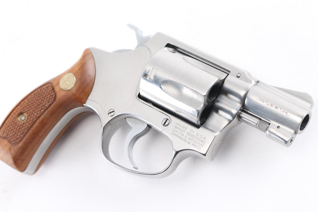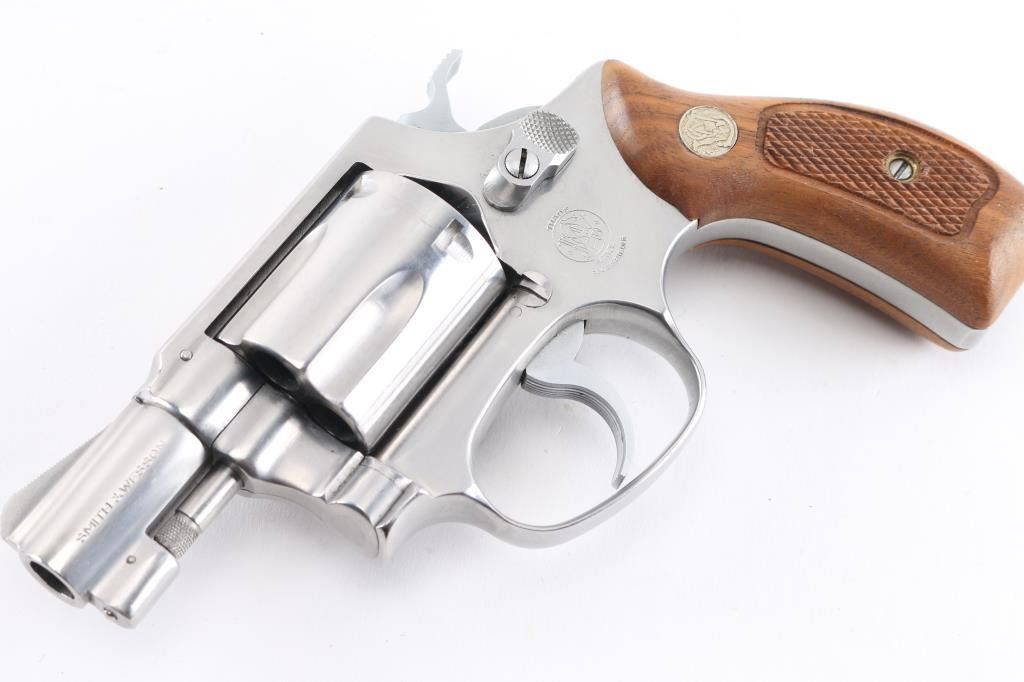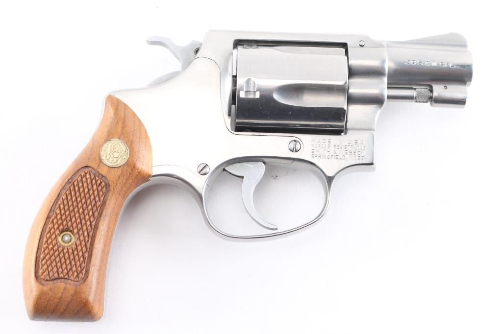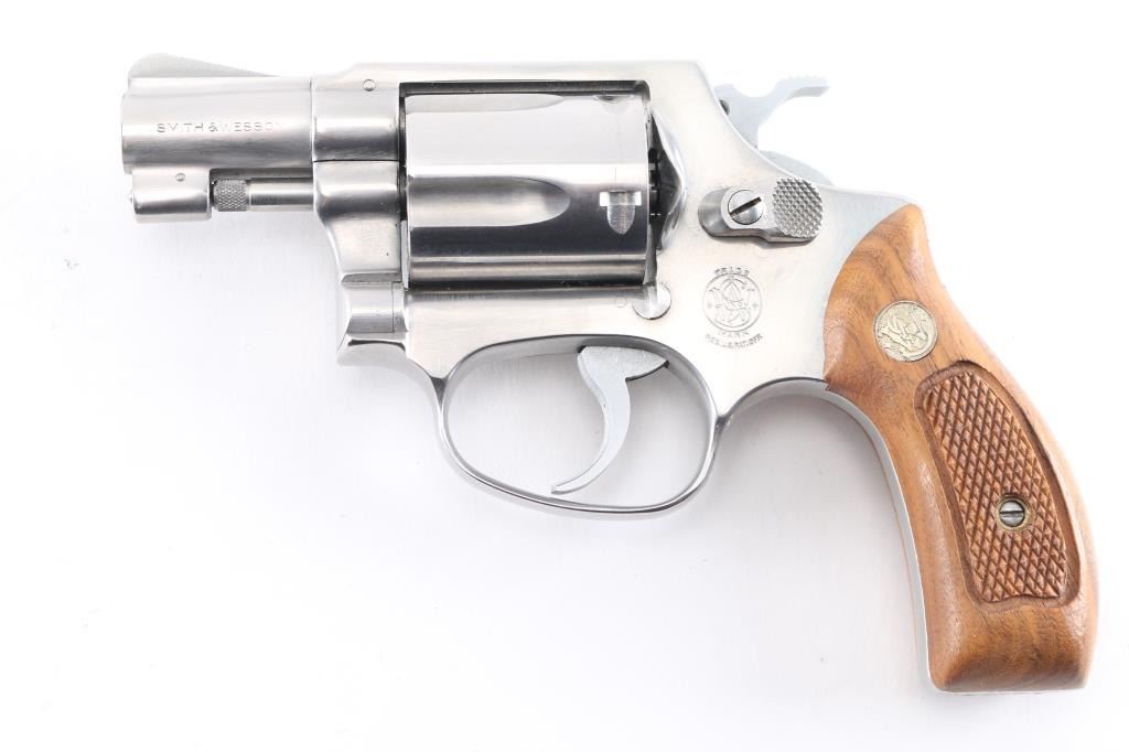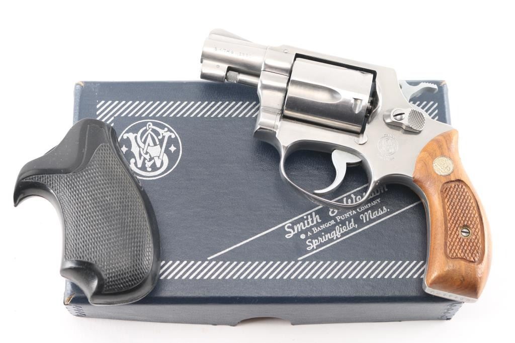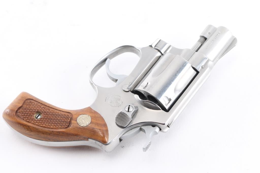 Compact double action revolver features stainless steel construction, checkered wood grips with S&W medallions, 1-7/8" pinned barrel, fixed sights, round butt, "J" frame, 5 shot fluted cylinder. Serial number places manufacture at circa 1979-1980. Bore is excellent/bright. Stainless shows small rub spots, handling marks. Grips are fine. Action is smooth with tight lock-up. Comes in factory blue cardboard box with matching label, manual, cleaning gear, Safariland clip on suede holster and a set of black checkered Pachmyer grips.Condition is NRA Excellent. Modern Firearm.