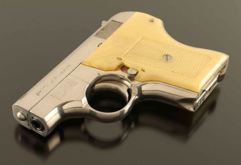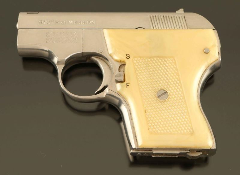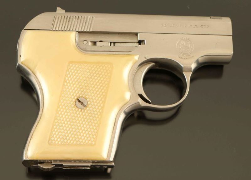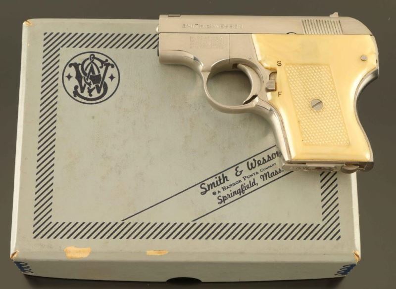 'Pocket Escort' Single action semi-automatic concealed hammer pocket pistol chambered in .22 Long Rifle, manufactured circa 1971. Features a nickel plated finish, 2 1/8" barrel, blade front sight, dovetailed rear sight with square notch, cocked indicator, manual safety on left side of the frame, heel magazine release, factory 5 round magazine, smooth trigger, and two-piece checkered faux mother of pearl plastic grips. Includes the original factory two-piece gray cardboard box with tools, paper and matching label. Pistol exhibits approximately nearly all of it's original finish showing only light handling marks. Action is smooth, bore is pristine and the plastic grips are fine. Condition is near NRA Excellent in box. ***Modern Firearm***