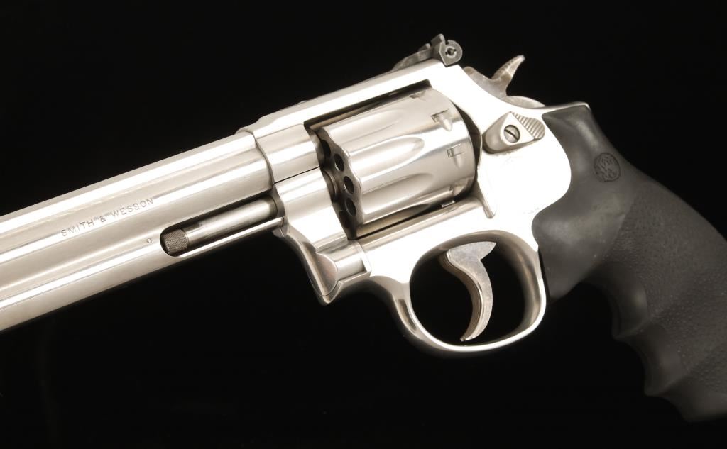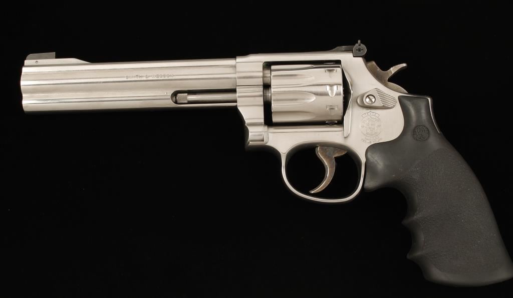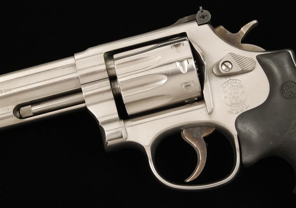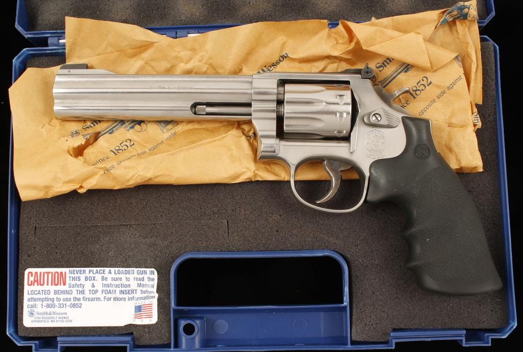 Double action ten shot revolver chambered in .22 Long Rifle. Features a 6" stainless barrel with full ejector rod shroud, black Patridge front sight, micrometer adjustable rear sight, case hardened hammer & serrated trigger, stainless frame & fluted cylinder, smooth tang and Hogue rubber grips with the Smith & Wesson logo. Revolver has many small scratched and gives the it a slight 'brushed' appearance, bore is excellent and action works perfectly. Condition is very good in original factory box. ***Modern Firearm***