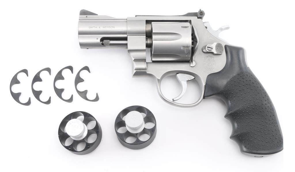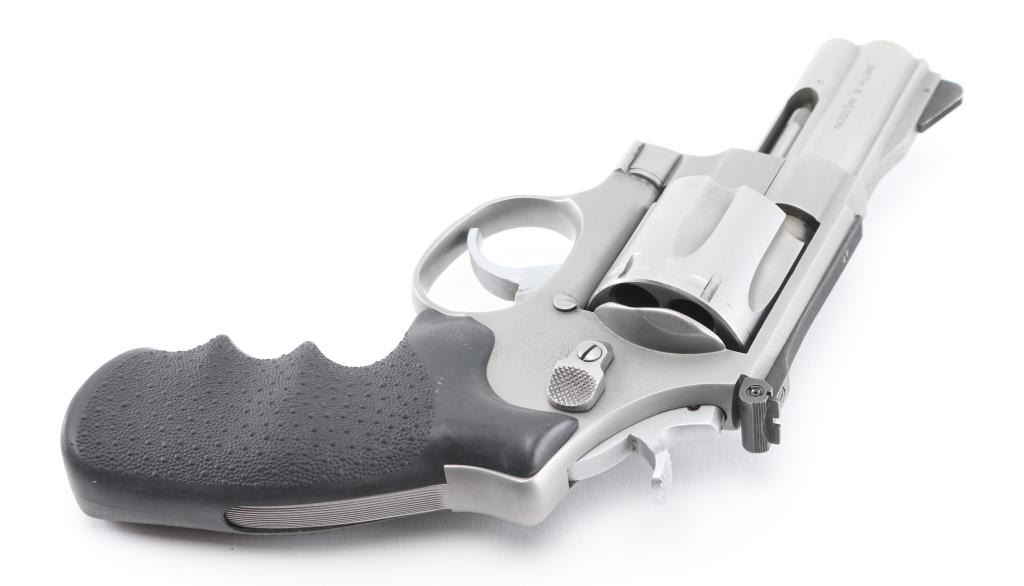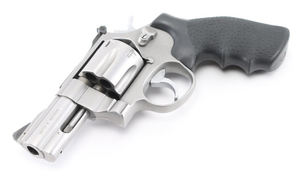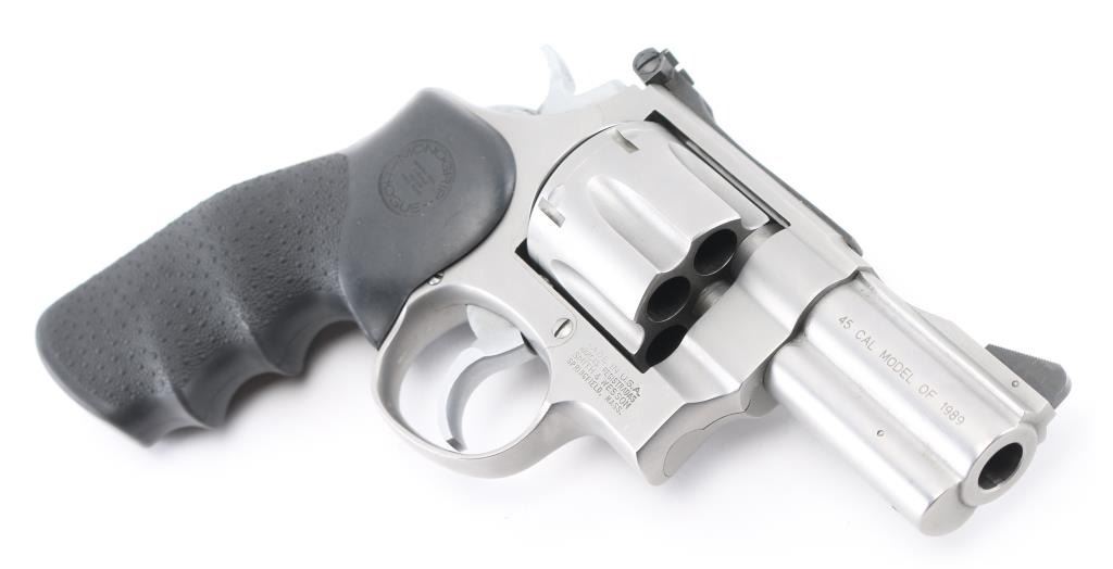 This S& W Model 625-3 is marked “.45 CAL MODEL OF 1989”. It is chambered for the .45 ACP Rimless cartridge commonly used in semi auto pistols. Built on the round butt N target frame with 3 screws, full lug 3" barrel, micro-click adjustable rear sight and serrated ramp blade front sight. .400 semi-target hammer, .312 smooth combat trigger, non-glare matte stainless finish. Hogue Monogrips. It is in excellent condition with the exception of the drag line and minor scratches Judging by the bolt face it appears to have been fired very little. Bore and charge holes are excellent, action is crisp/tight., grips are excellent. Comes with 2 6-rd speed loaders, and 4 half moon clips. NRA Condition-Excellent. Modern Firearm.