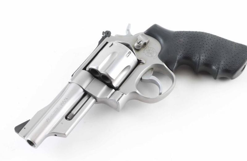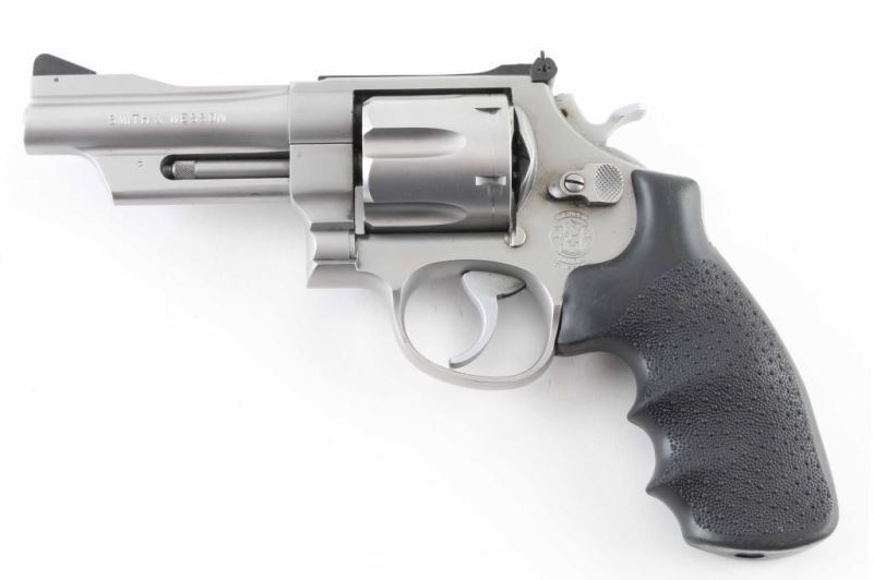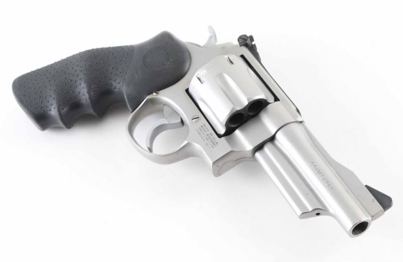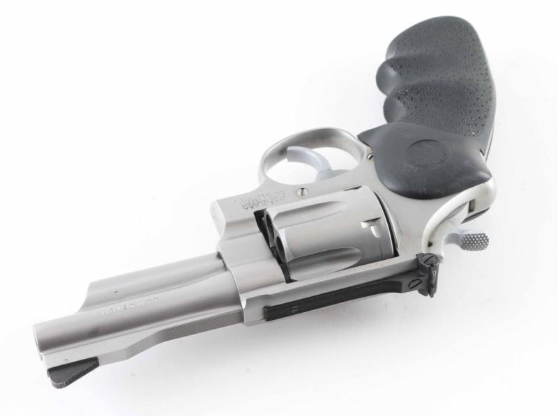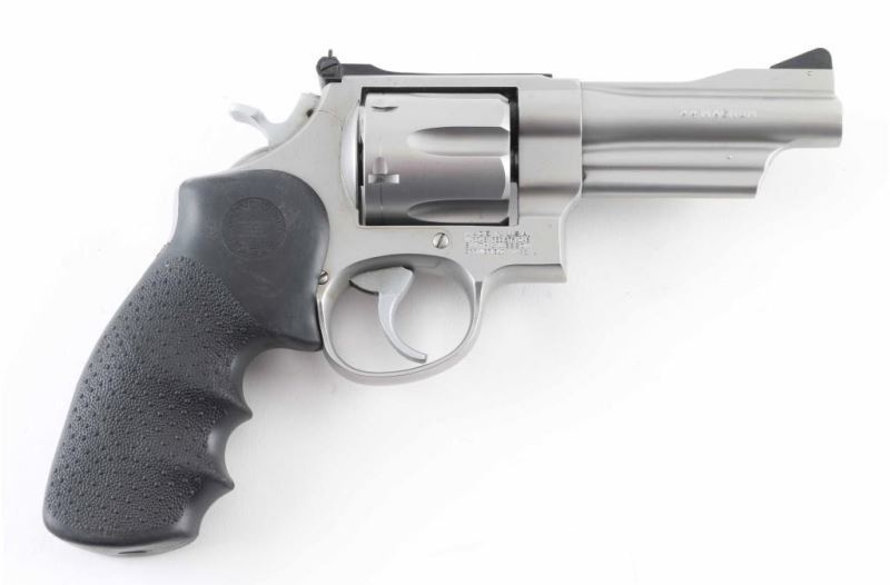 Large frame stainless steel double-action revolver chambered in .44 Magnum. Features a brushed finish, 4" barrel. Shrouded ejector rod, raised ramp serrated front sight, adjustable rear sight, fluted six-shot cylinder, smooth trigger, knurled hammer spur, and Hogue Monogrips. Revolver exhibits slight wear, a drag line and few minor handling marks with no major wear observed. Action is very smooth with tight lock-up, bore is good just needs cleaned. NRA Very Good Modern Firearm