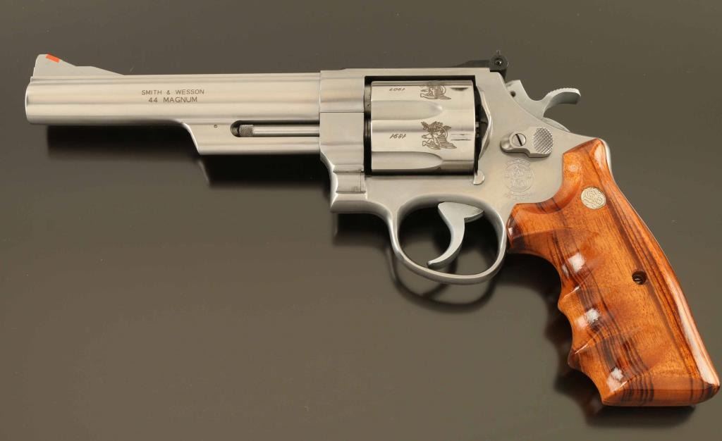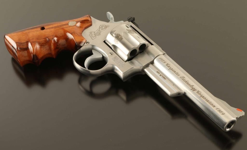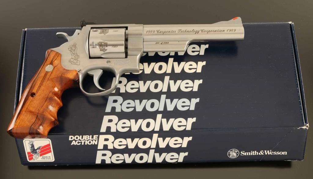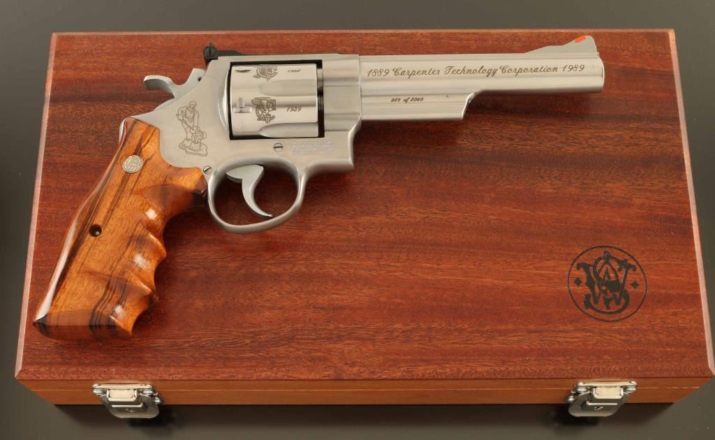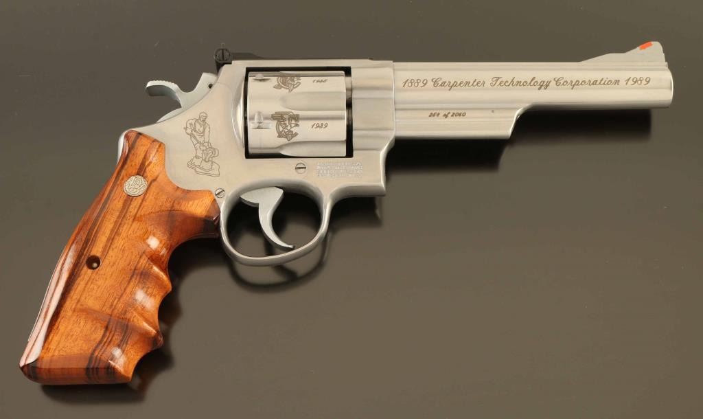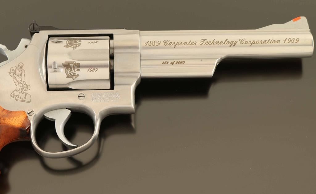 'The .44 Magnum Stainless' Commemorative stainless steel large frame double-action revolver chambered in .44 Magnum, manufactured circa 1989. Number 258 of only 2,060 special order revolvers produced for the 100 year anniversary of the Carpenter Technology Corporation. Features a brushed finish, C.T.C. themed laser engraving, 6" barrel with partially serrated sighting rib, raised ramp front sight with red insert, micrometer click rear sight with white outline, fluted six-shot cylinder, shrouded ejector rod, smooth .400" trigger, .500" target hammer, three screw square butt N target frame and two-piece Goncalo Alves finger groove grips with silver Smith & Wesson medallions. Includes the original factory shipping box with correct label, one-piece blue cardboard box, documents, cleaning tools and wood display case. Revolver exhibits minor handle marks with no major wear observed. Action is smooth with very good lock-up, the bore is pristine and the wood stocks are fine. Condition is NRA Excellent in box. ***Modern Firearm***
