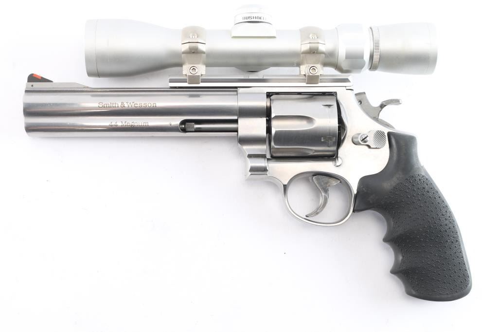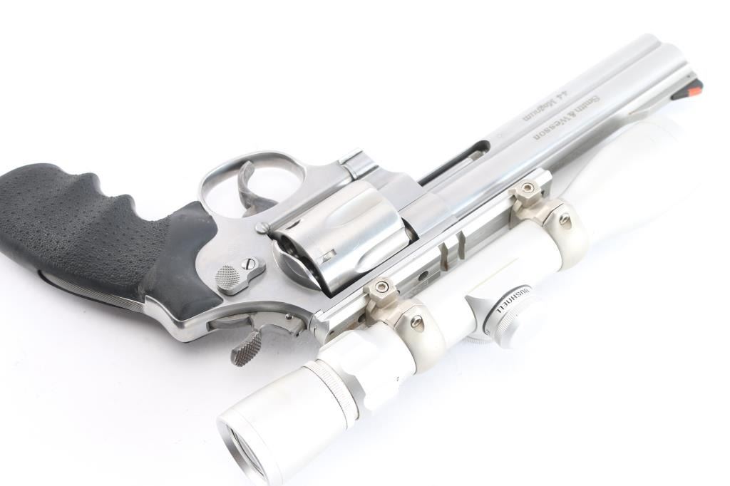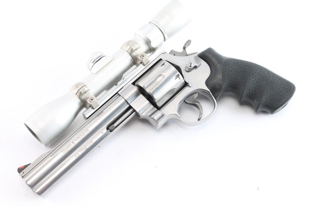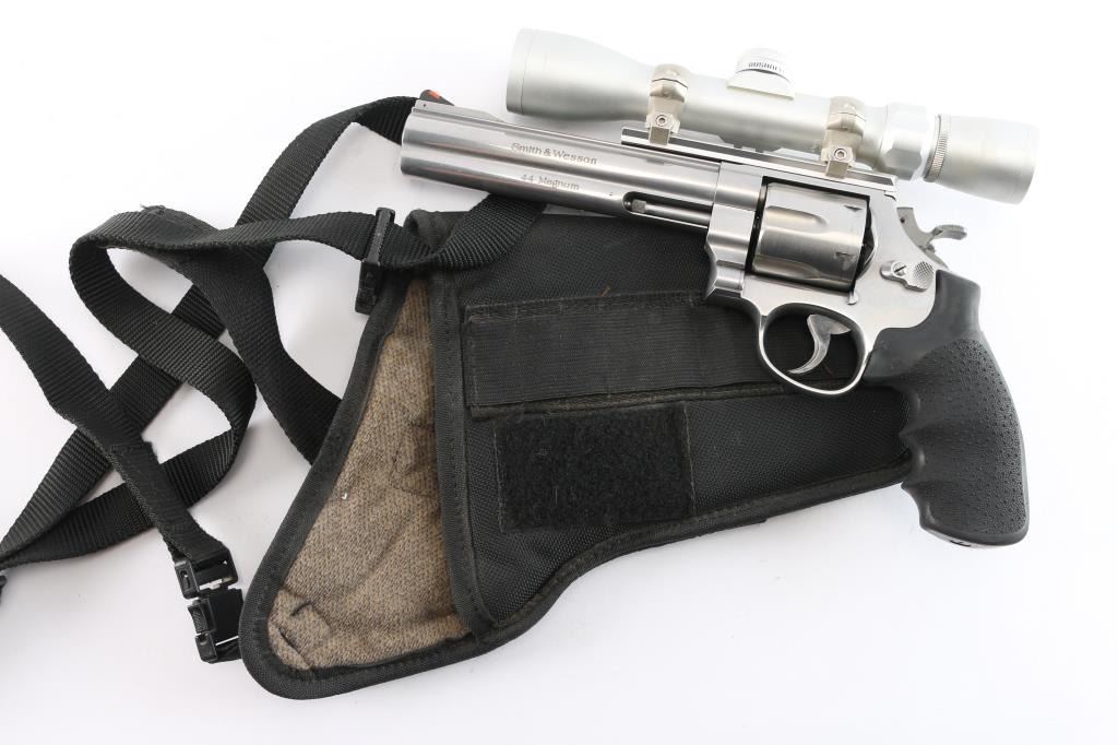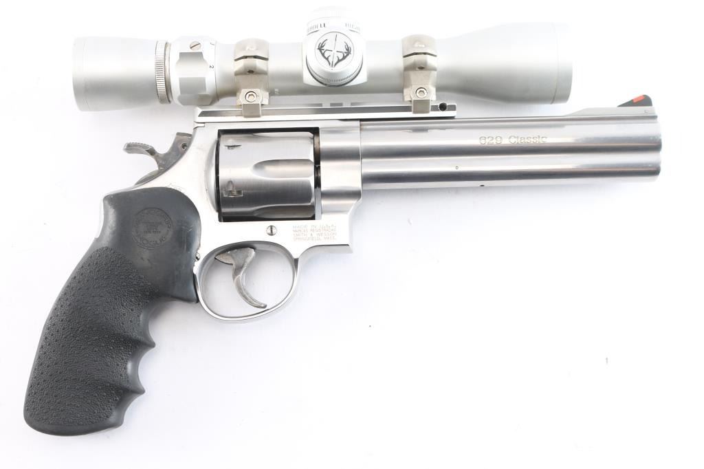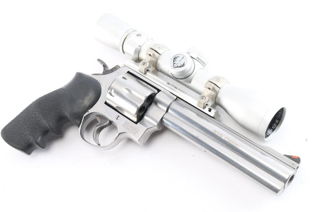 '629 Classic'. American made N-frame revolver, DA/SA, stainless steel barrel, frame and cylinder, approximately 6 1/2" barrel, red insert on a serrated ramp front sight, the top of the barrel rig is flat and serrated, rear sight removed and B-Square scope rail installed, full-length ejector rod housing, checkered wide hammer spur, checkered cylinder release, serrated wide trigger, black textured Hogue "Classic " - American made N-frame revolver, DA/SA, stainless steel barrel, frame and cylinder, approximately 5" barrel, bore and cylinders are bright, red insert on a serrated ramp front sight, the top of the barrel is flat and serrated, adjustable white outline open notch rear sight, full-length ejector rod housing, checkered wide hammer spur, checkered cylinder release, smooth wide trigger, black textured Hogue rubber grip. Mounted with a Bushnell Trophy 2X32 scope, duplex reticle, clear optics. Comes with black nylon shoulder holster. the bore is excellent/bright, action is sound, the grips are very good and the finish is near excellent with some minor scratches.