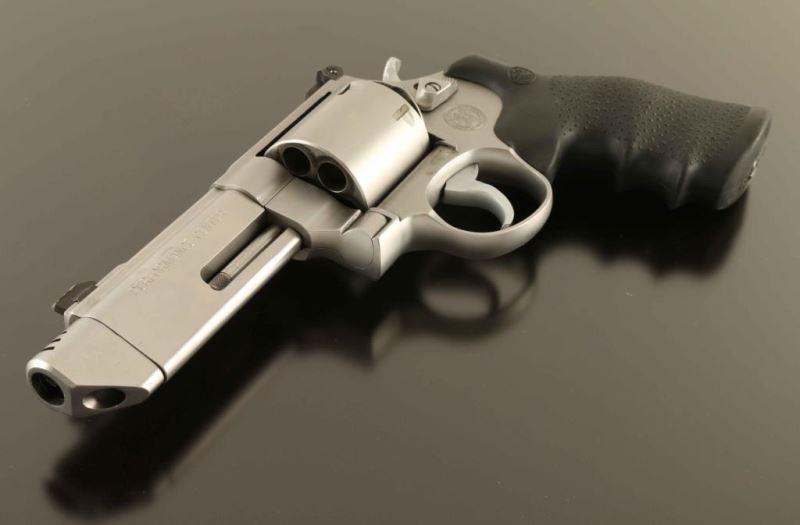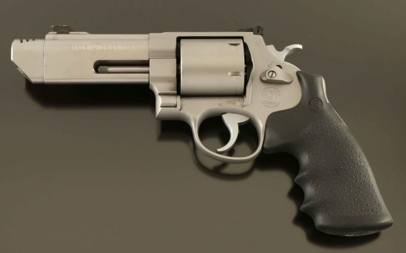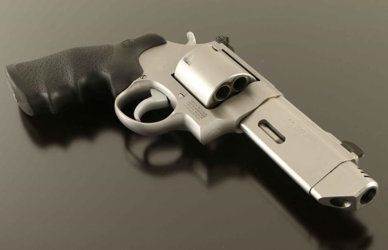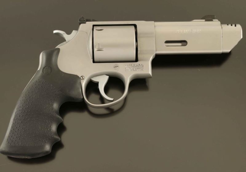 Performance Center stainless steel large frame double action revolver chambered in .44 Magnum, manufactured circa 2008. Featured a matte finish, 4" slabside barrel with removable compensator, shortened ramp front sight with orange accent, adjustable micrometer click rear sight, unfluted six-shot cylinder, .312 smooth combat trigger with overtravel stop, .300 semi-target hammer, internal key lock safety, three screw N target frame and one-piece pebbled black rubber Hogue Monogrip with S&W monograms. Includes documents, lock, spent case, keys and muzzle cap. Revolver exhibits light wear with a few scattered bright scuffs. Action is smooth with solid lock-up, the bore is pristine and the rubber grips is very good. Condition is NRA Very Good+++. ***Modern Firearm***