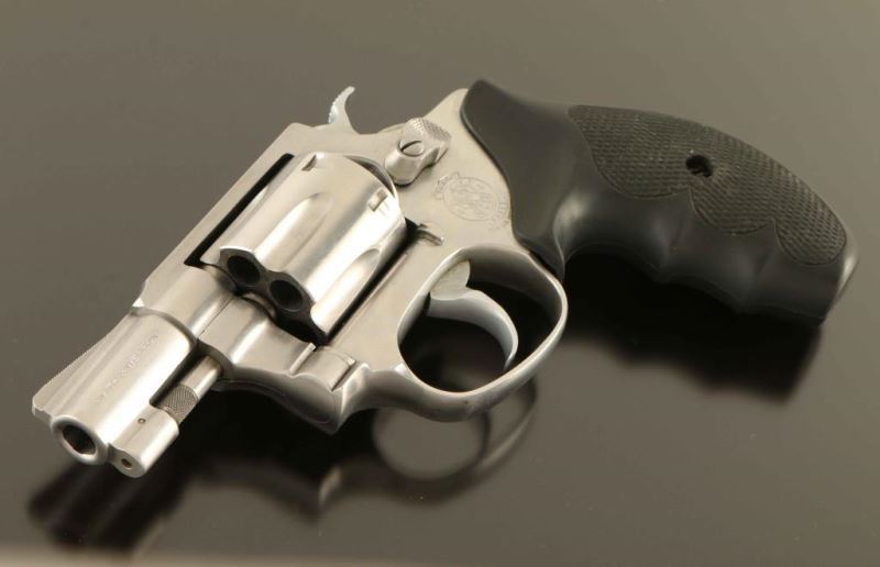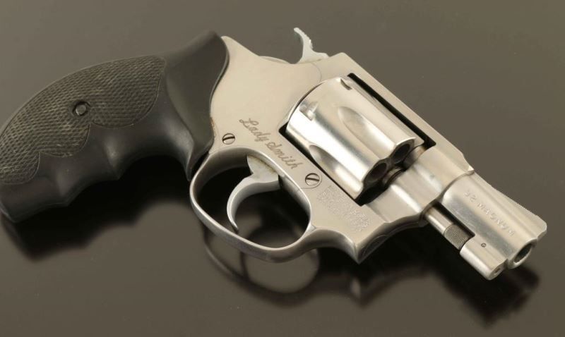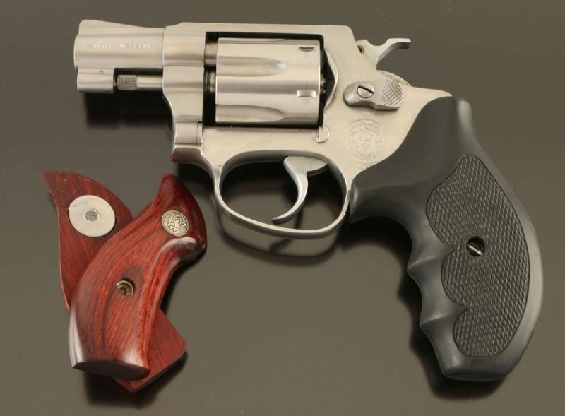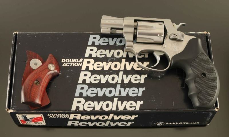 "Lady Smith' Stainless steel small frame double action revolver chambered in .32 Harrington & Richardson Magnum, manufactured circa 1990. Features a brushed finish, ribbed 2" barrel, ramp front sight, square notched rear sight, fluted six-shot cylinder, non-shrouded ejector rod, smooth .312 " combat trigger, .240" hammer, three screw round butt J frame and two-piece Uncle Mike's checkered black rubber grips. Includes the original factory one-piece blue cardboard box with documents, paper, correct label and a set of smooth laminated rosewood grips with S&W medallions. Finish exhibits a bright drag line on the cylinder and light handling marks. Action is strong with very good lock up, bore is excellent and the rubber grips are fine. Condition is NRA Very Good++ ***Modern Firearm***